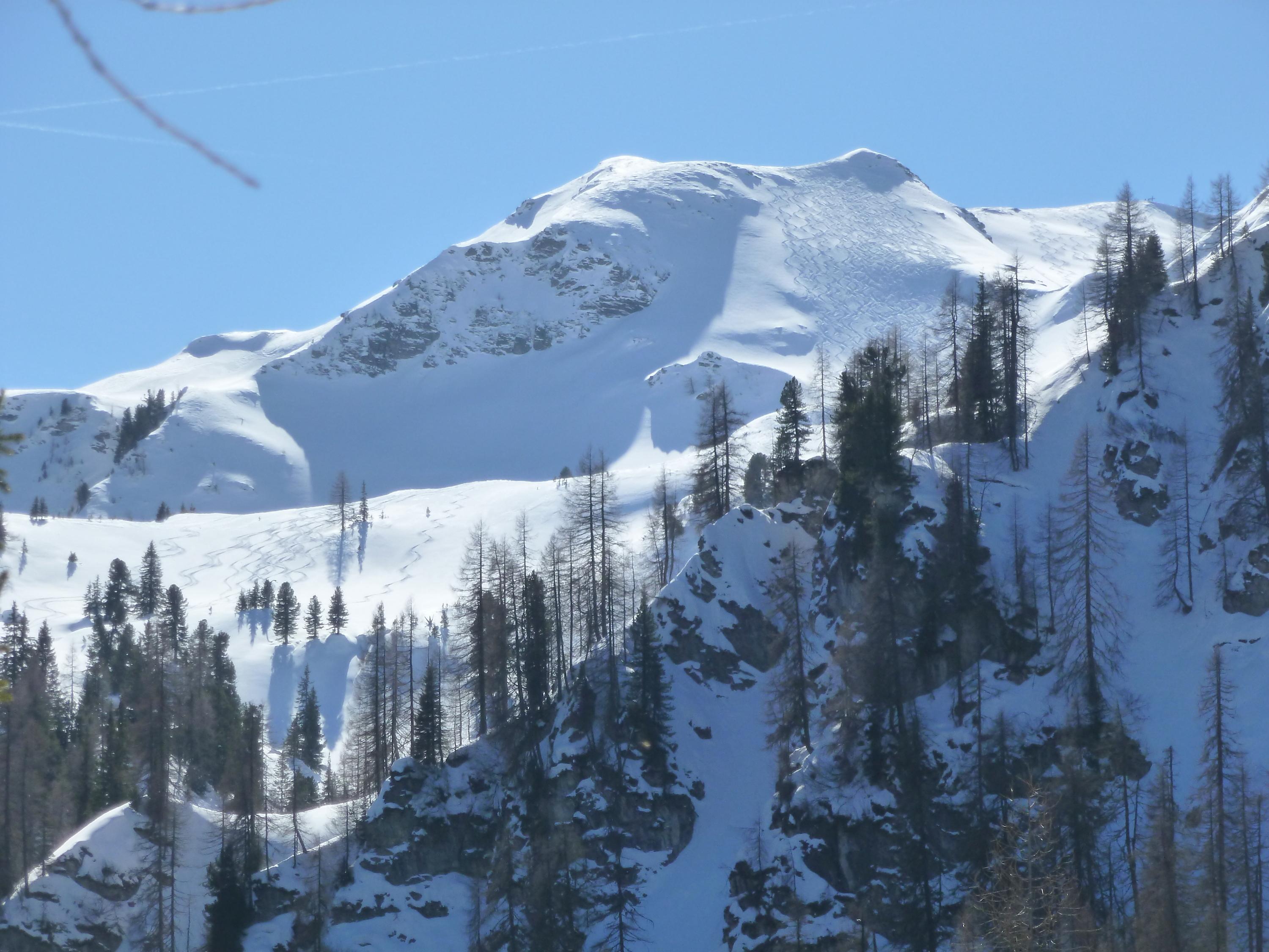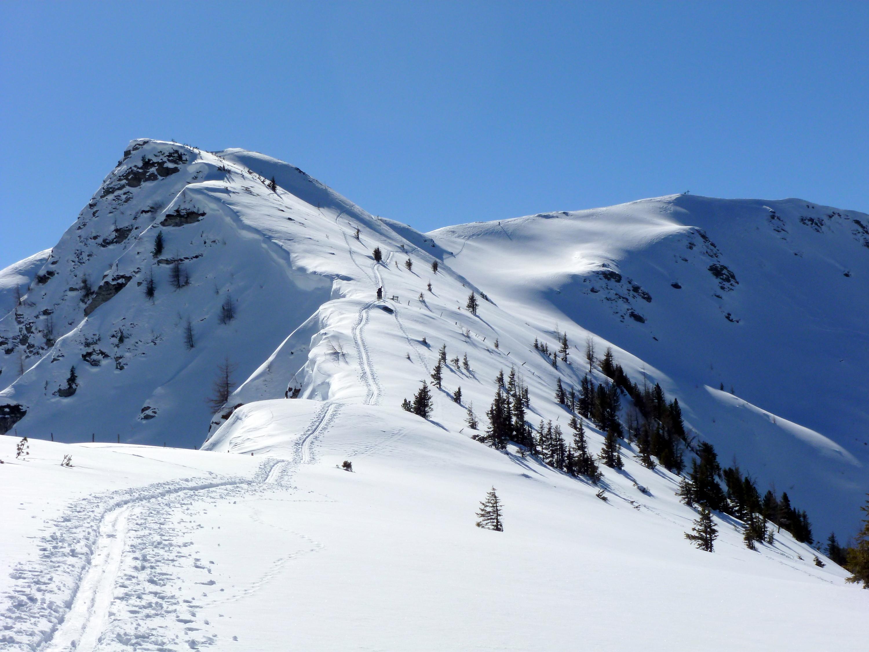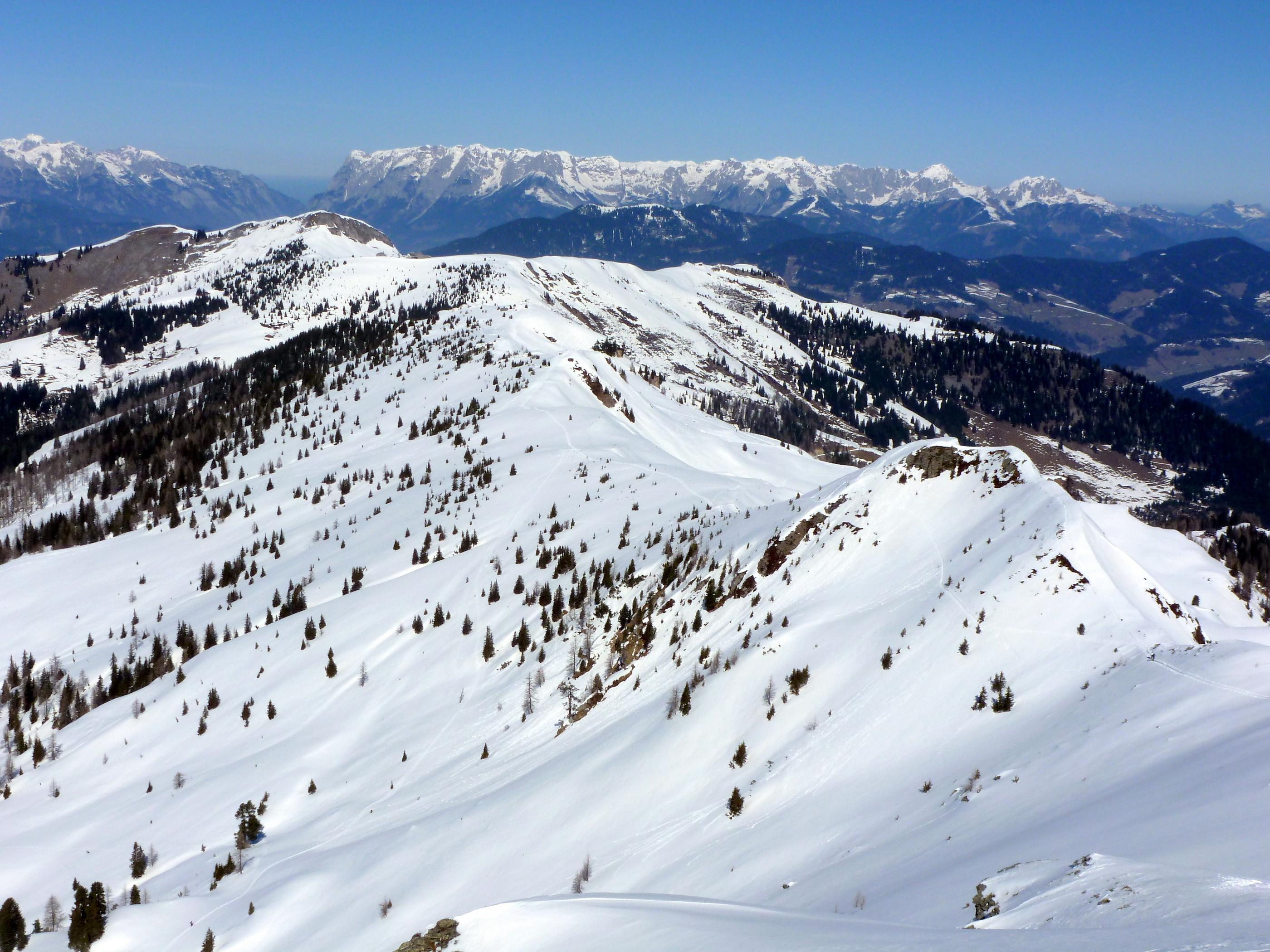 Vom vielbesuchten Penkkopf oberhalb der Kleinarler Hütte aus scheint das Gründegg nur noch einen Sprung entfernt. Dennoch bietet der Weiterweg nach Süden entlang des Gratrückens nicht nur beiderseits ein eindrucksvolles Panorama, sondern auch noch eine etwas knifflige Stelle. Die direkt am Grat verlaufende Spur ist ein kurzes Stück recht luftig und stellenweise etwas ausgeapert. Die untere Spurvariante quert höhenmeterschonend den Westhang und ist - so wie heute am Vormittag - bei Harsch und einer abgerutschten Spur für ein kurzes abschüssiges Stück eher heikel. Für die Abfahrt bieten sich derzeit noch bei Pulverbedingungen die bereits ziemlich zerspurten NE-Hänge oder aber die NW-Hänge in Richtung Kleinwildalm an, wo heute noch deutlich mehr Platz für eine eigene Spur vorhanden war. Diese Variante hat zusätzlich den Vorteil, dass man am Rückweg zur Kleinarler Hütte nochmals den Penkkopf im Vorbeigehen mitnimmt. Für die Abfahrt nach Kleinarl ist bei den momentan herrschenden Verhältnissen die gut präparierte Rodelbahn die eindeutig zu bevorzugende Variante.
