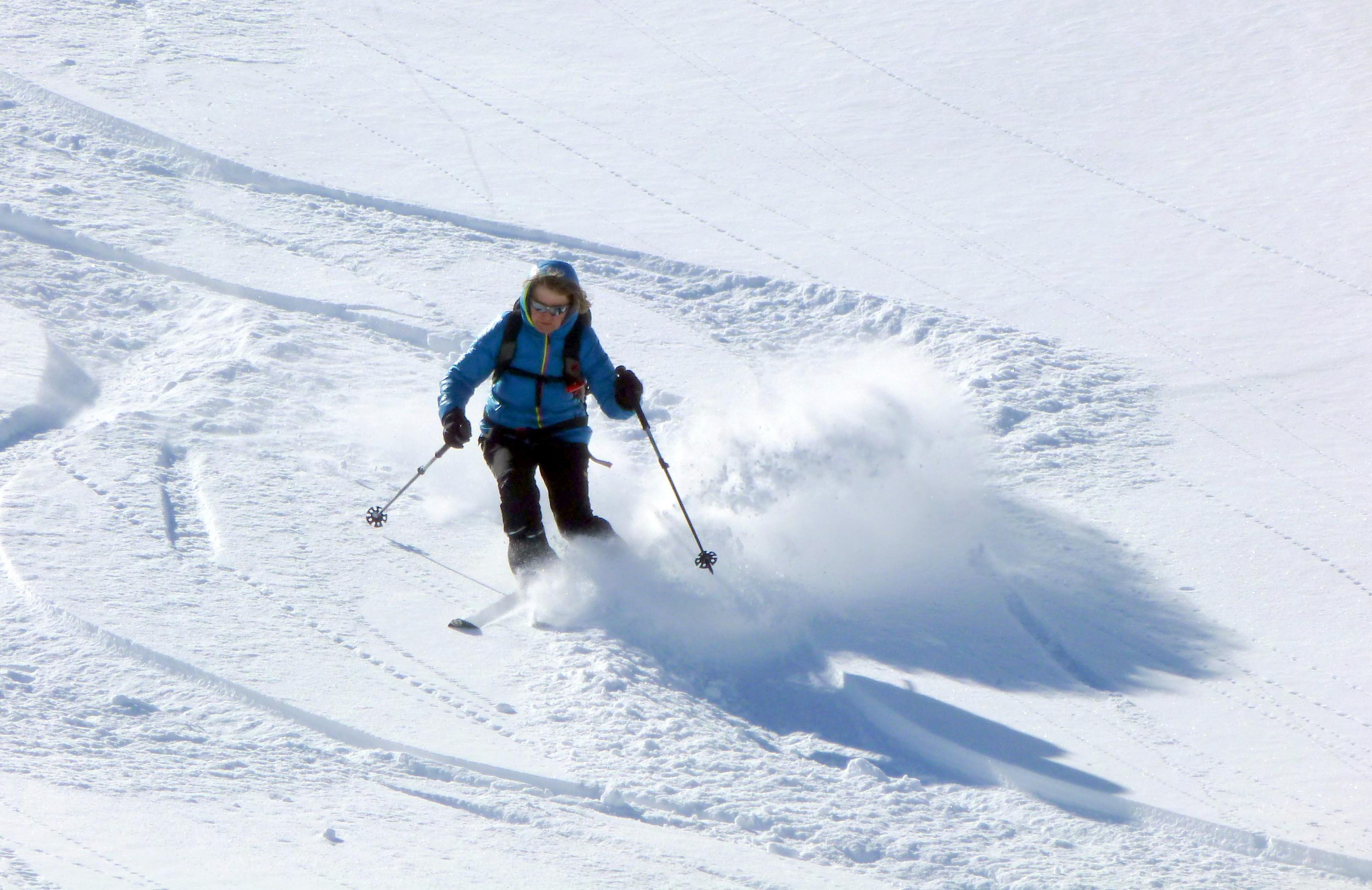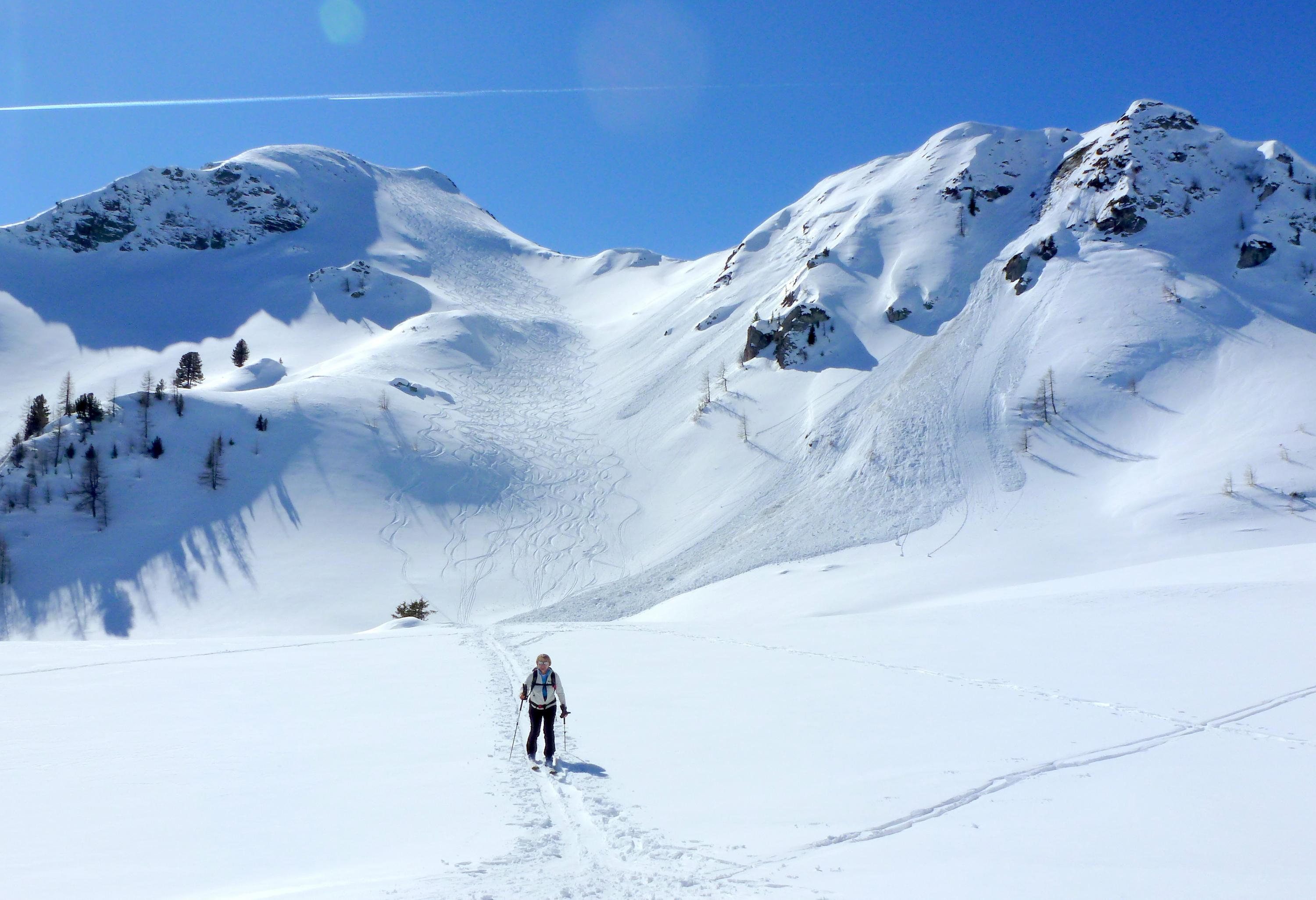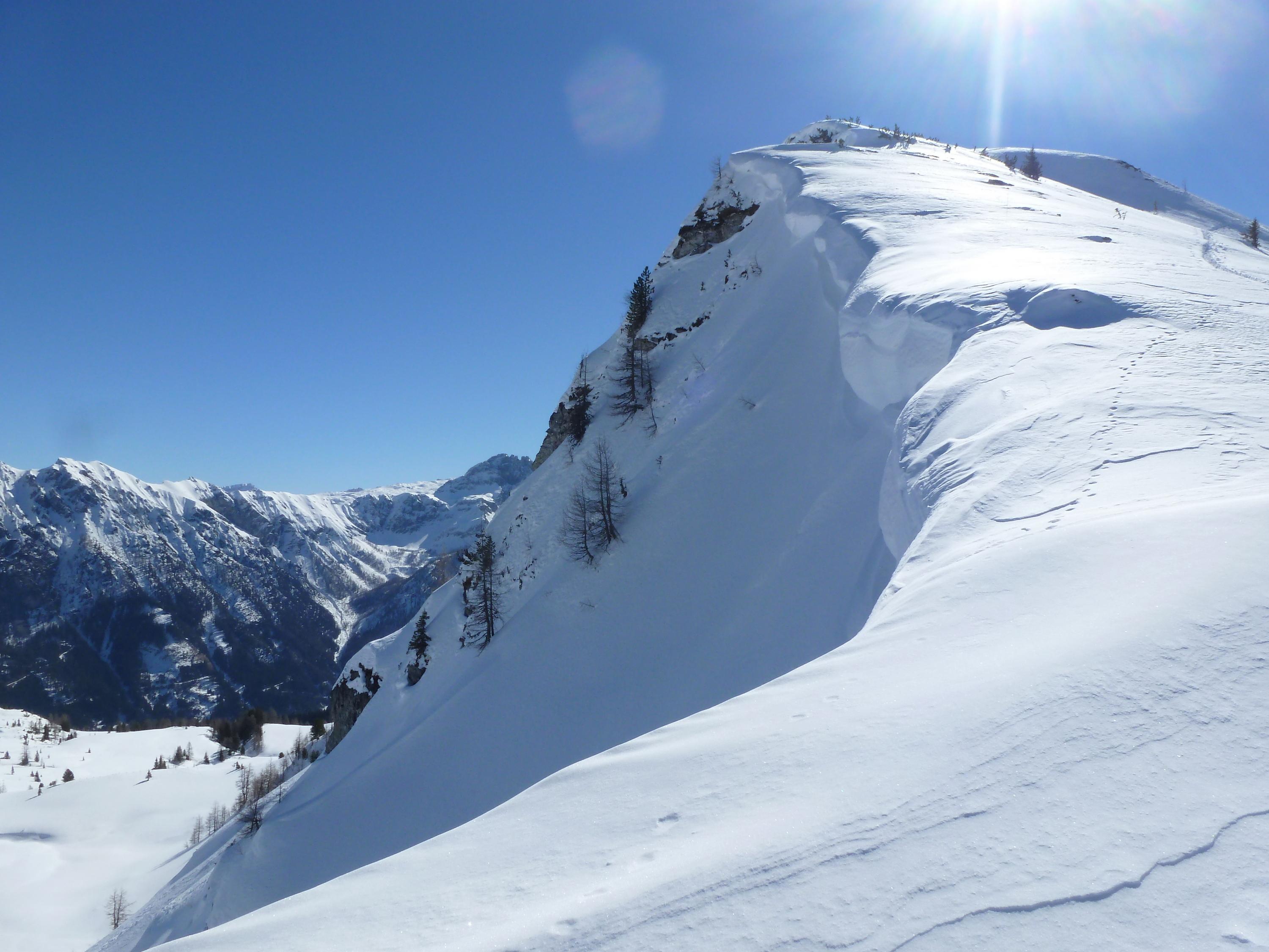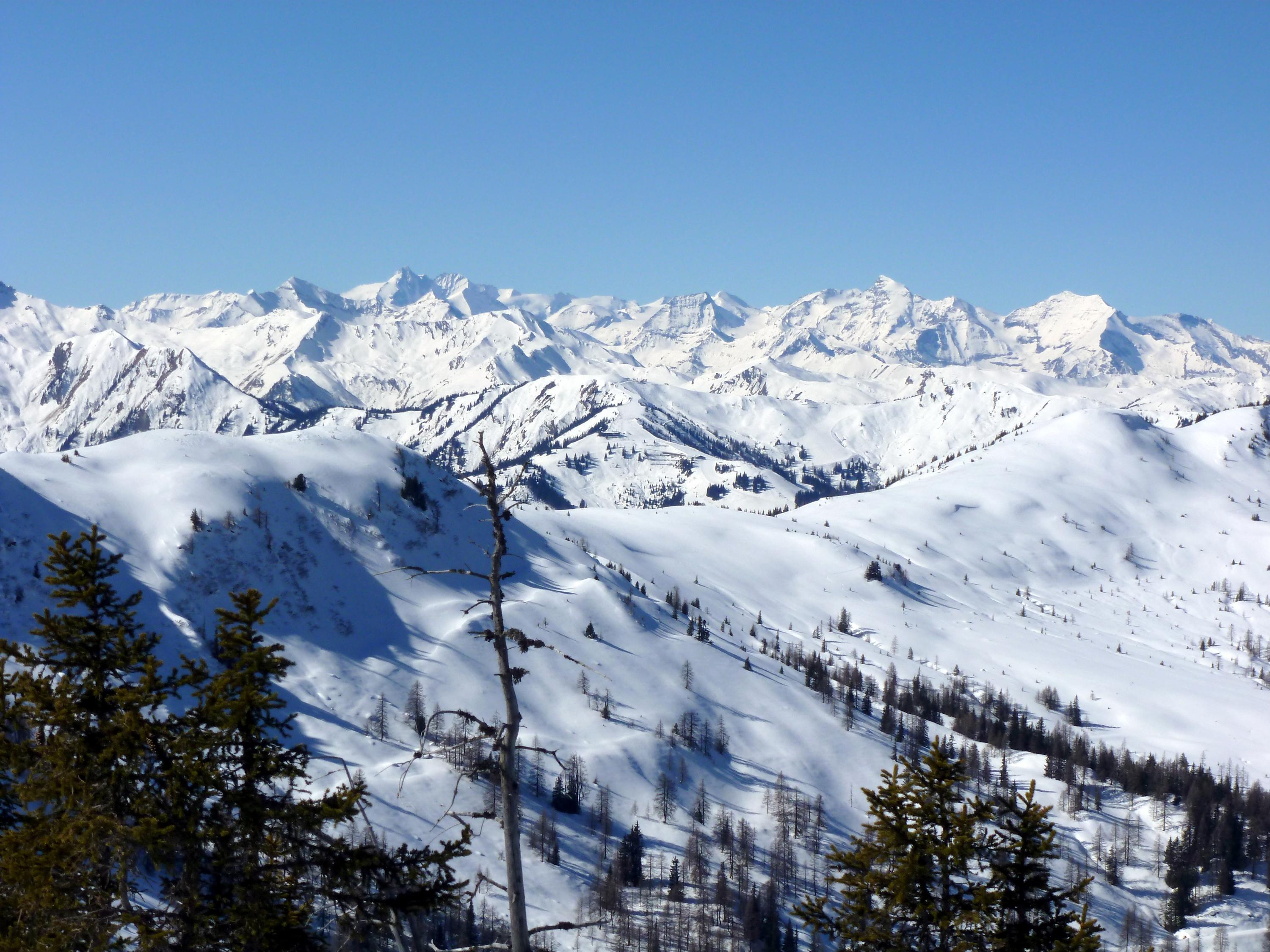 Vom vielbesuchten Penkkopf oberhalb der Kleinarler Hütte aus scheint das Gründegg nur noch einen Sprung entfernt. Dennoch bietet der Weiterweg nach Süden entlang des Gratrückens nicht nur beiderseits ein eindrucksvolles Panorama, sondern auch noch eine etwas knifflige Stelle. Die direkt am Grat verlaufende Spur ist ein kurzes Stück recht luftig und stellenweise etwas ausgeapert. Die untere Spurvariante quert höhenmeterschonend den Westhang und ist - so wie heute am Vormittag - bei Harsch und einer abgerutschten Spur für ein kurzes abschüssiges Stück eher heikel. Für die Abfahrt bieten sich derzeit noch bei Pulverbedingungen die bereits ziemlich zerspurten NE-Hänge oder aber die NW-Hänge in Richtung Kleinwildalm an, wo heute noch deutlich mehr Platz für eine eigene Spur vorhanden war. Diese Variante hat zusätzlich den Vorteil, dass man am Rückweg zur Kleinarler Hütte nochmals den Penkkopf im Vorbeigehen mitnimmt. Für die Abfahrt nach Kleinarl ist bei den momentan herrschenden Verhältnissen die gut präparierte Rodelbahn die eindeutig zu bevorzugende Variante.
