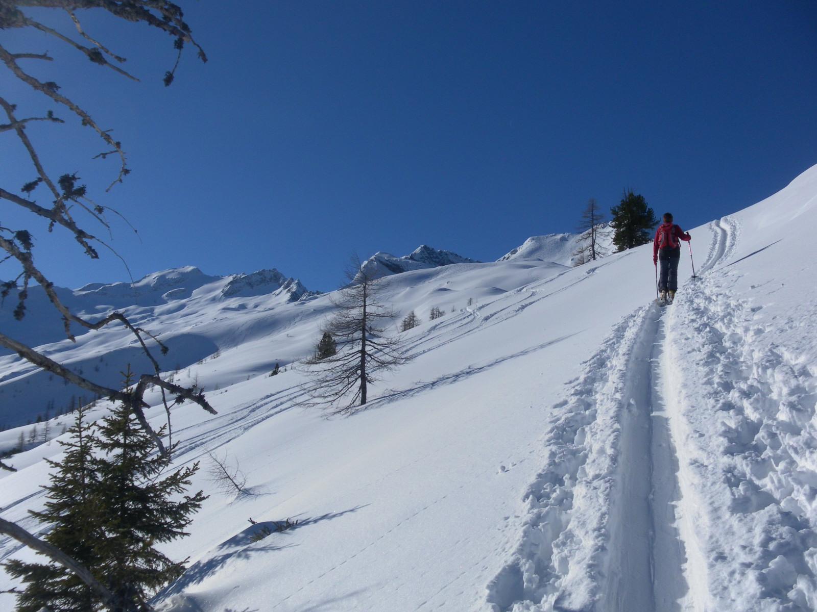 Im Moderegggraben liegt genügend buckelpistenartig eingefahrener Schnee. Ab der Modereggalm finden wir lockeren Pulverschnee, im Gstößkar und in Gipfelnähe ist der Pulver gut gesetzt und nur wenig windbearbeitet.