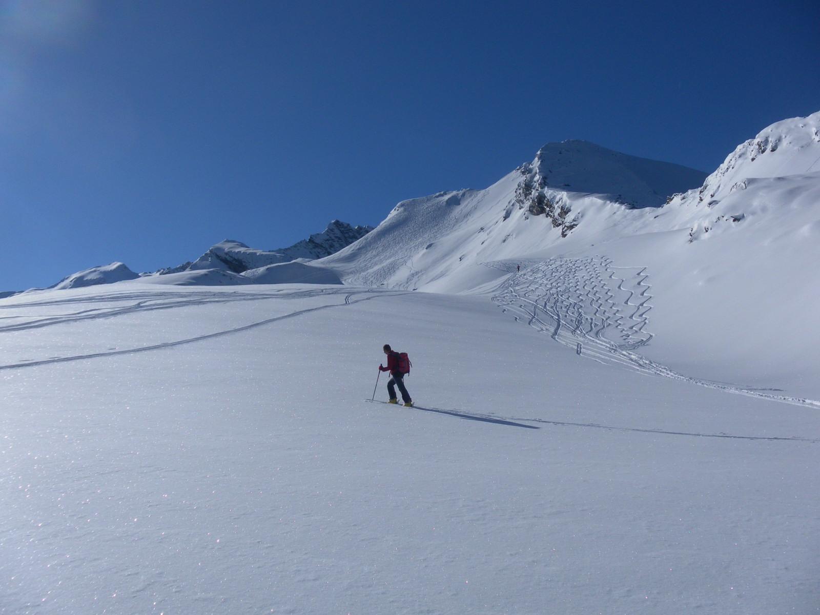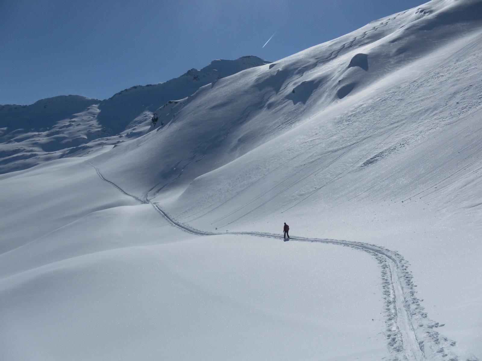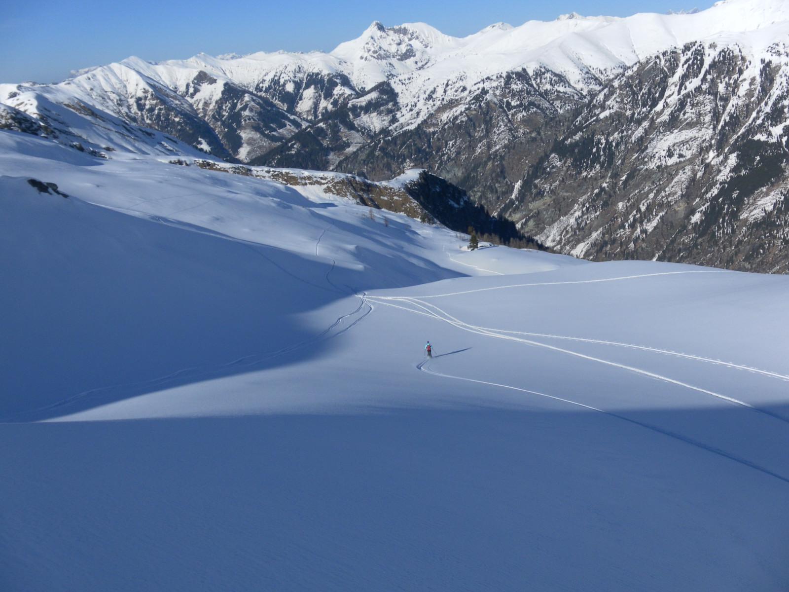 Die Abfahrt über die kaum verspurten Pulverhänge bis unter den Mandlkogel bieten Hochgenuss. Vom zerfahrenen Nordhang des Mandlkopfes bis zur Modereggalm sind die Abfahrtsspuren verkrustet, abseits findet man Lockerpulver.