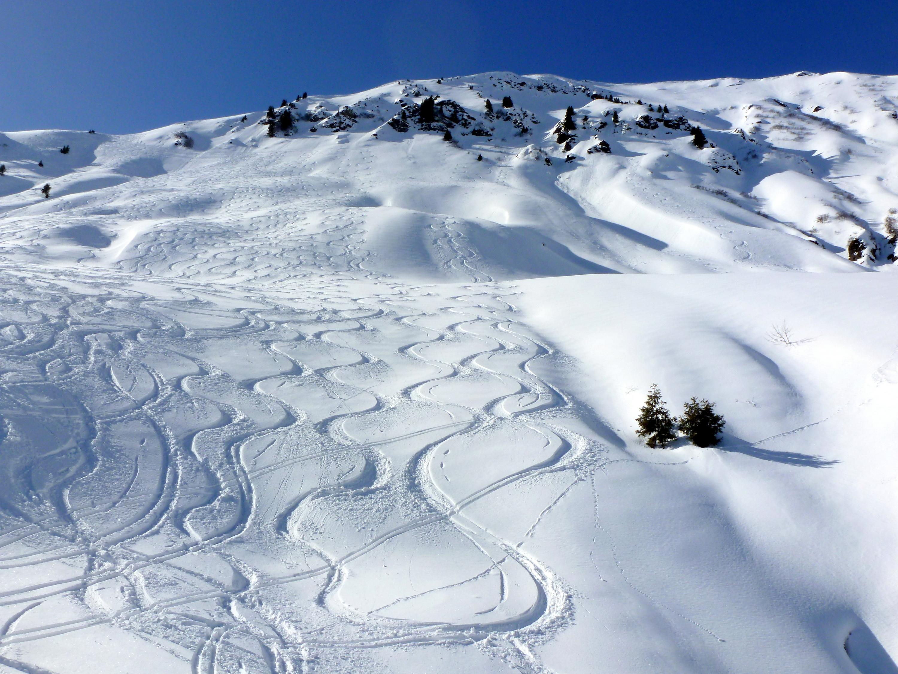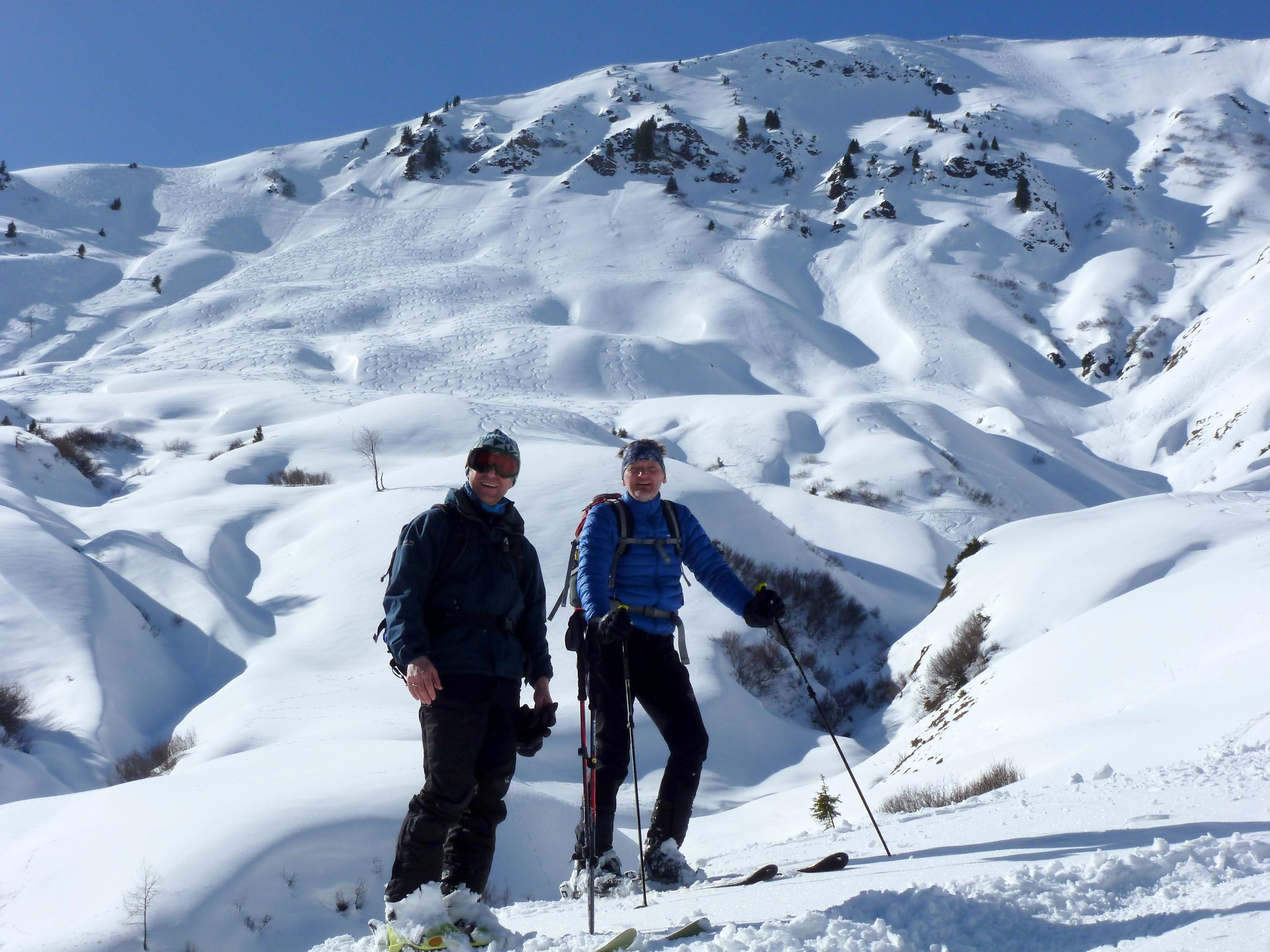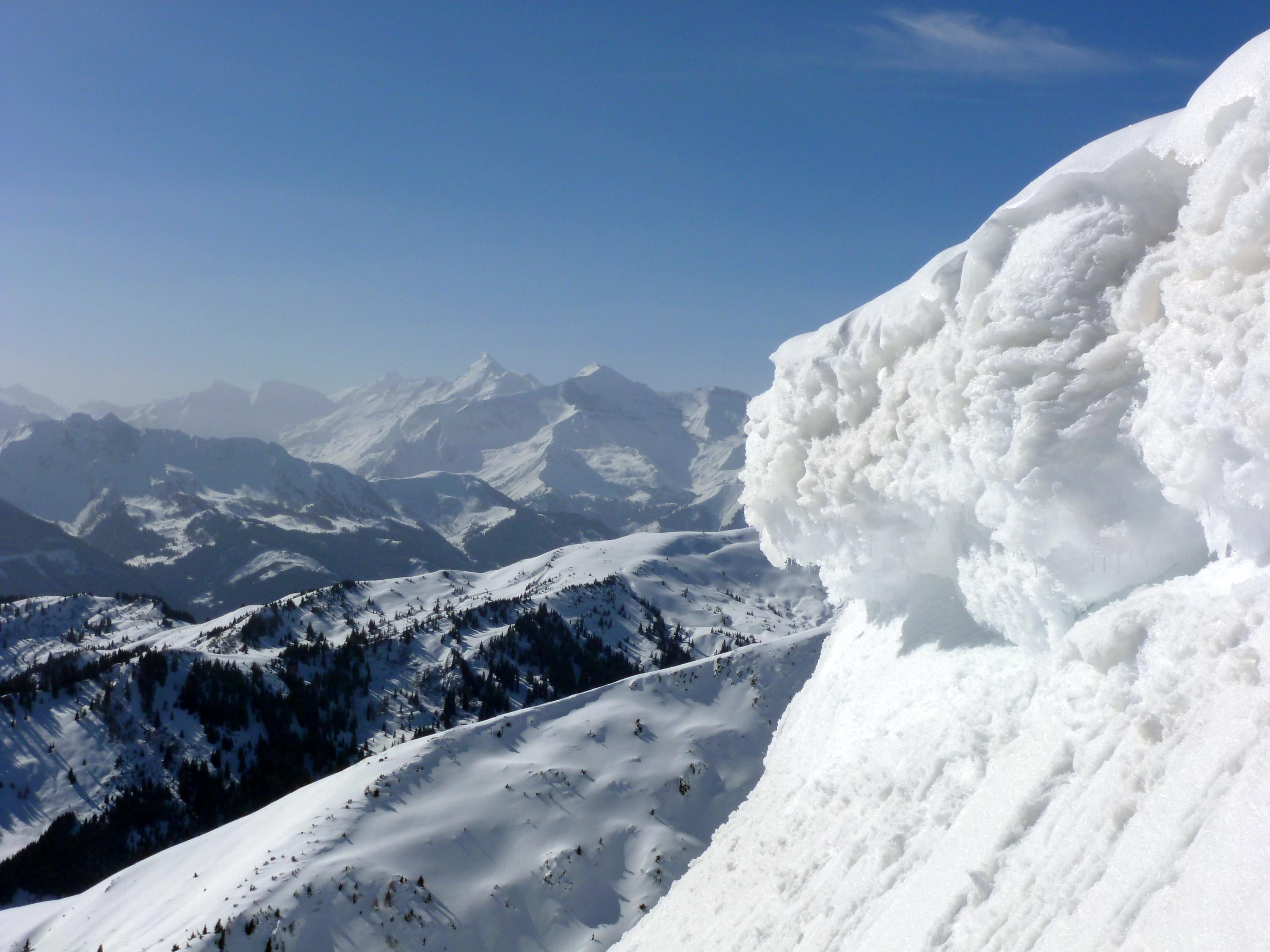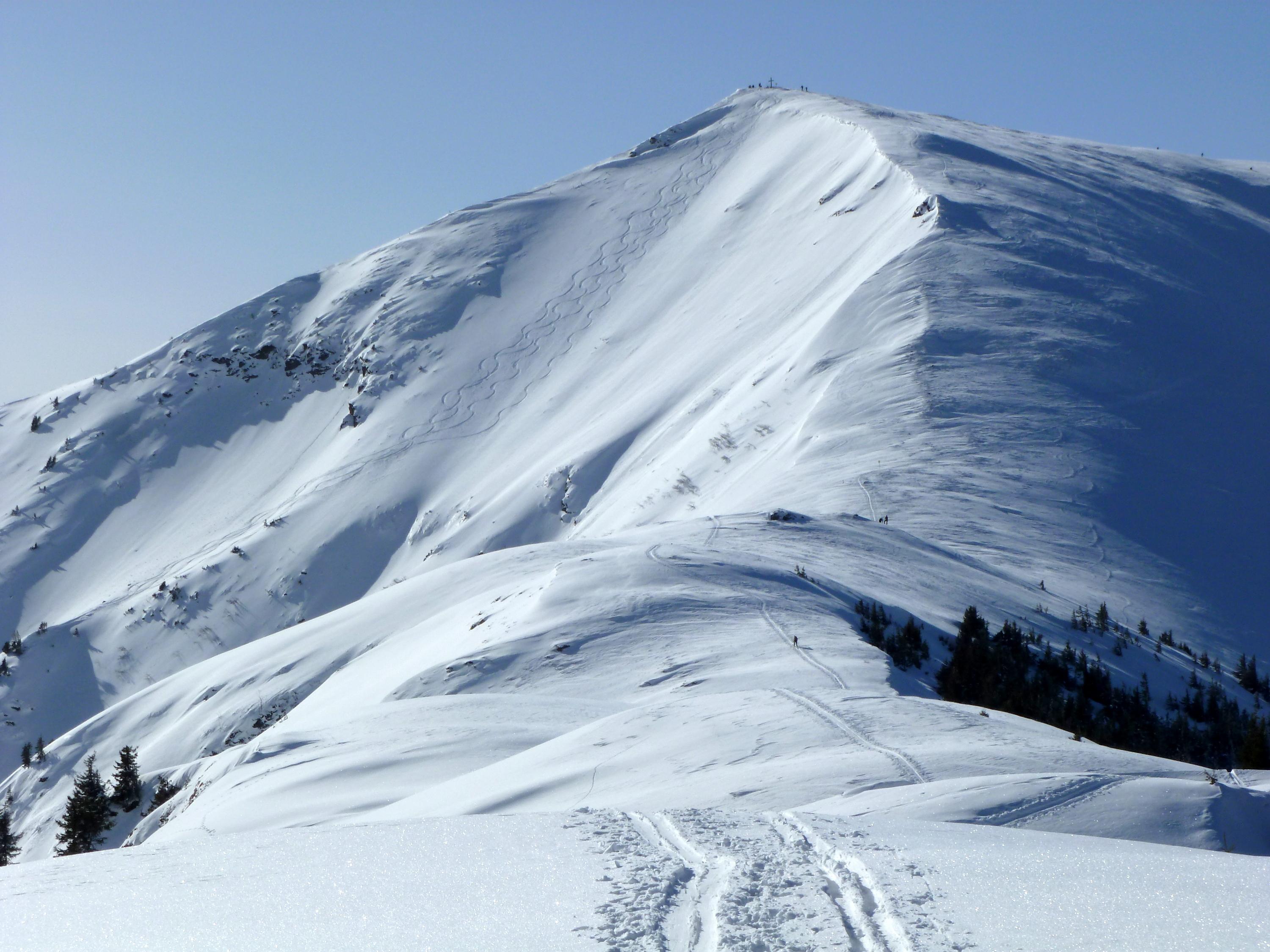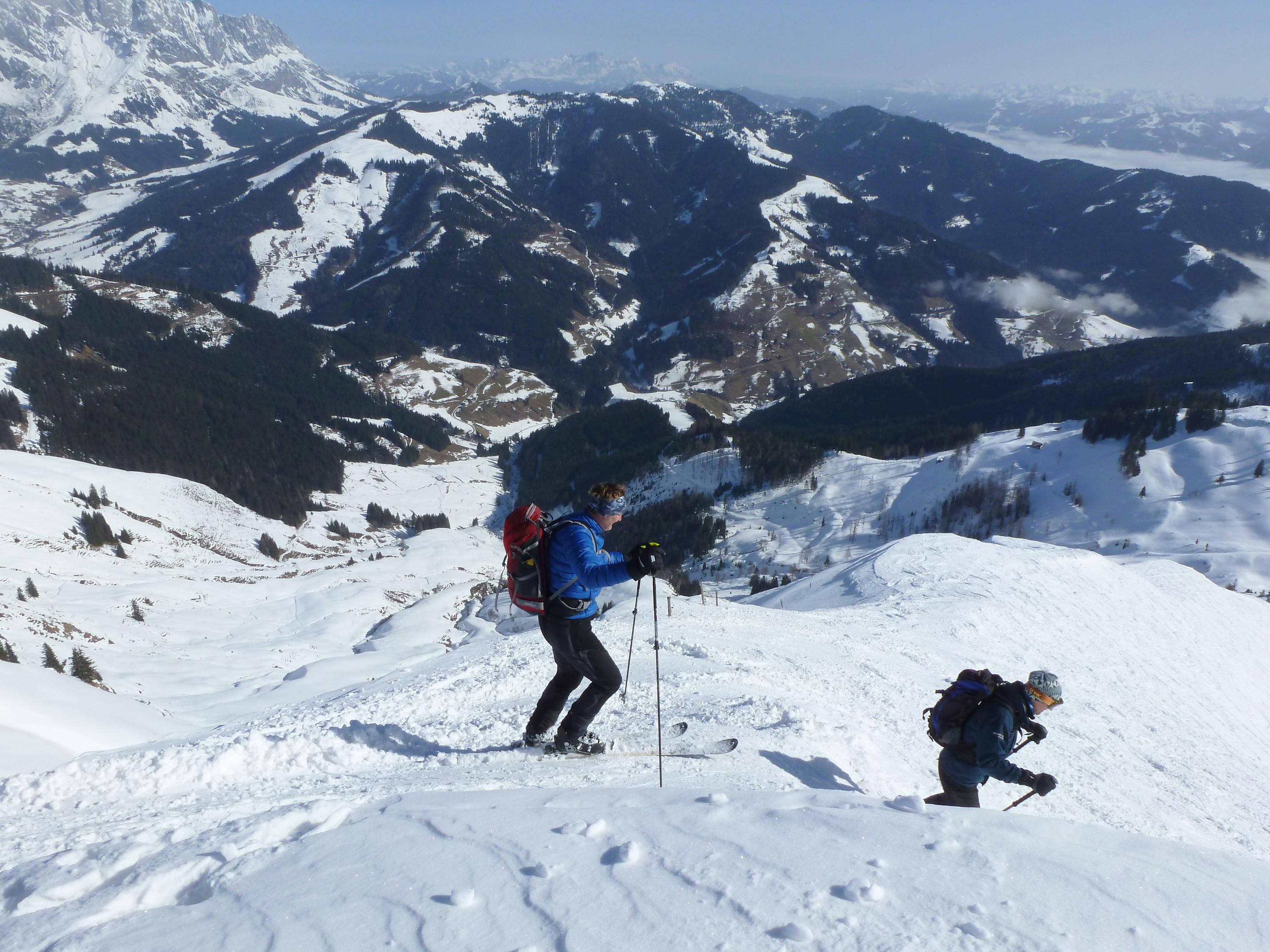 Im Anstieg über die Reicheralm sind bei mehreren Graben- bzw. Bachquerungen die Ski auszuziehen, will man nasse Felle und damit das Anstollen bzw. Aneisen vermeiden. Auf kompakter Spur und tragendem Harsch auf die Marbachhöhe, von dort pulvrig bis zum heute windstillen Gipfel. Noch am späteren Vormittag liegt eine Hochnebeldecke überm Pinzgauer Saalachtal, Richtung Süden über den Tauern der bereits mehrfach angesprochene goldbraune Dunst des mutmaßlichen Saharastaubes. Für die Abfahrt verzichten wir auf die steile Einfahrt in den NE-Hang direkt vom Gipfel, obwohl zu den beiden Spuren, die schon beim Start am Morgen zu sehen waren, inzwischen noch zwei weitere dazu gekommen sind. Ein kräftiger Riss in der Schneedecke genau beim Ansatz der ersten Schwünge ist ein deutliches Singal zur Vorsicht. Darum geht es zunächst im lustigen Wechsel zwischen Pulver und Aufgefirntem entlang des SE-Rückens hinunter, bis eine Einfahrt in den breiten NE-Hang weiter unten problemlos möglich wird. Dort bester Pulver auf einer kompakten Unterlage - und noch jede Menge Platz im Unverspurten! Die Querung der tief eingeschnittenen Gräben ist trotz der geringen Schneehöhe problemlos, weiter unten dann je nach Hangexposition und Steilheit tragender Harsch mit mehr oder weniger Pulverauflage oder bereits feiner Firn. Abfahrt bis zum Parkplatz mit etwas Vorsicht neben der geräumten und teilweise schon ausgeaperten Dacheben-Straße steinfrei möglich.