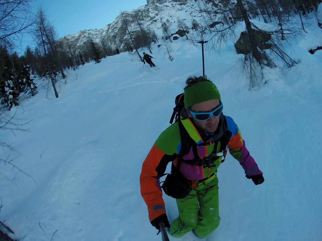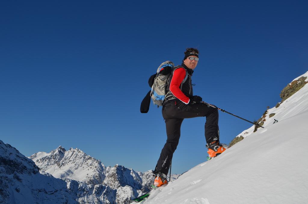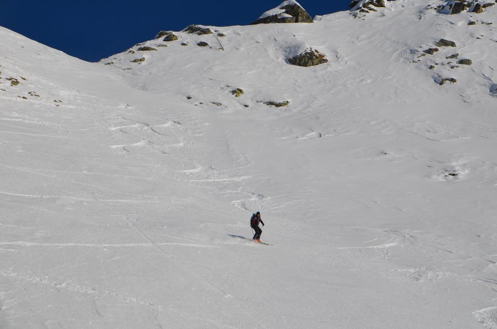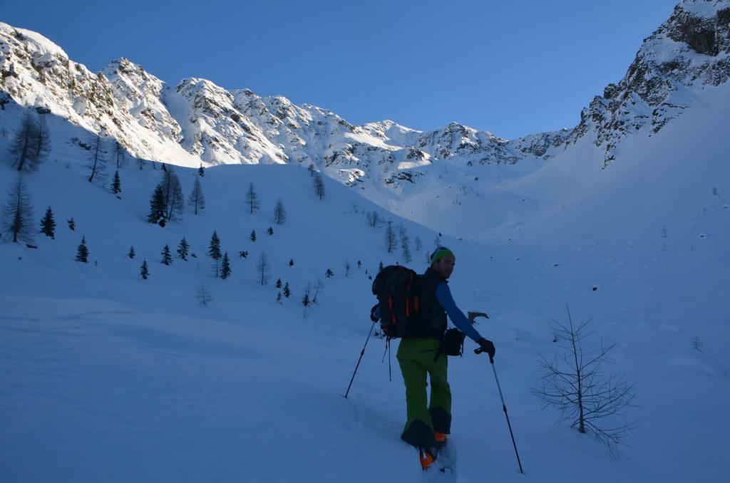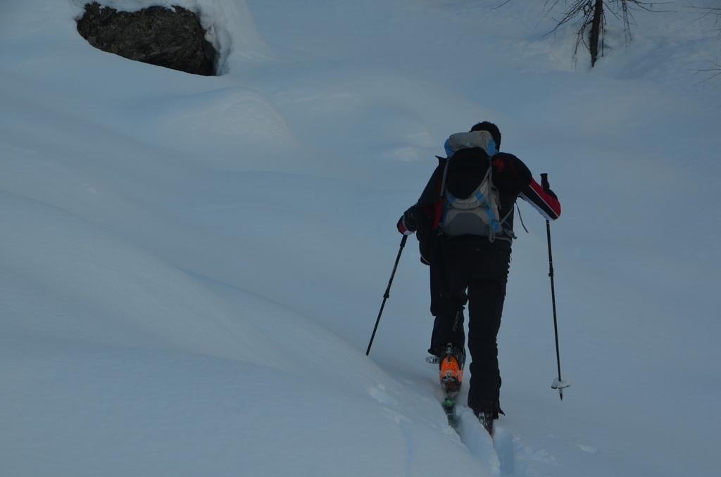 Bis zur Obergailer Alm auf eine Höhe von ca. 1400m hatte die Schneedecke bereits eine lästige, harte Kruste die wahrscheinlich vom Regen der letzten Woche stammt. Von hier bis zu einer Höhe von ca. 1800m dann ein wahrer Pulvertraum, welcher dann im breiten Kar unterhalb des Gipfels leider abrupt zu Ende war. Hier konnte man deutlich den Windeinfluss erkennen. Windgepresste und pulvrige Abschnitte wechselten sich ab. Der Gipfelhang war dann im Kammbereich stark eingeblasen und wir haben uns entschlossen unter einem kleinen Felsen 20m unter der Scharte umzudrehen.