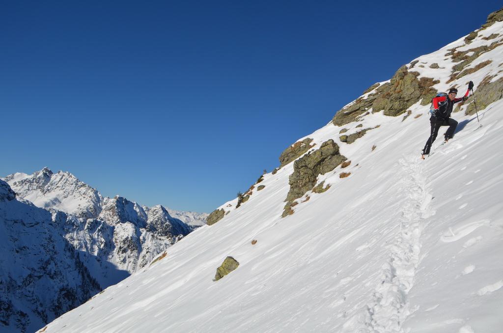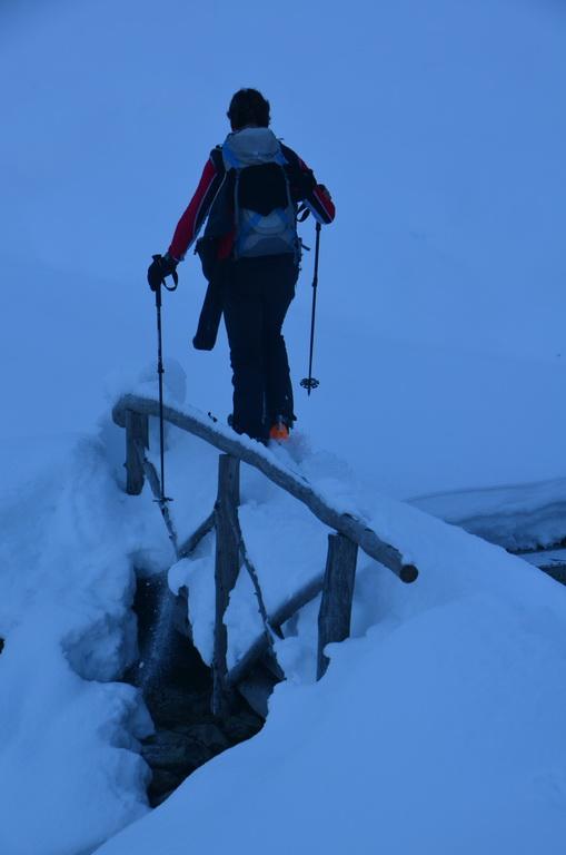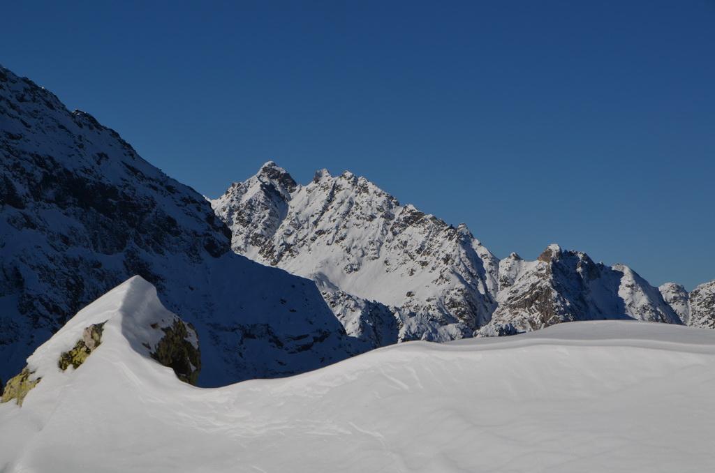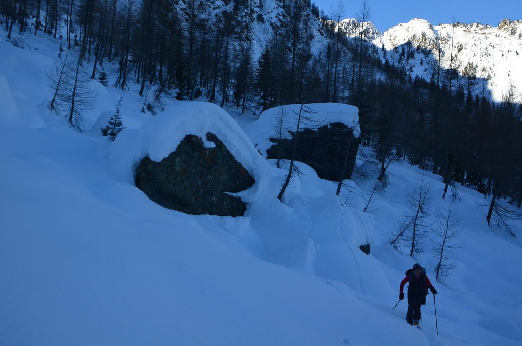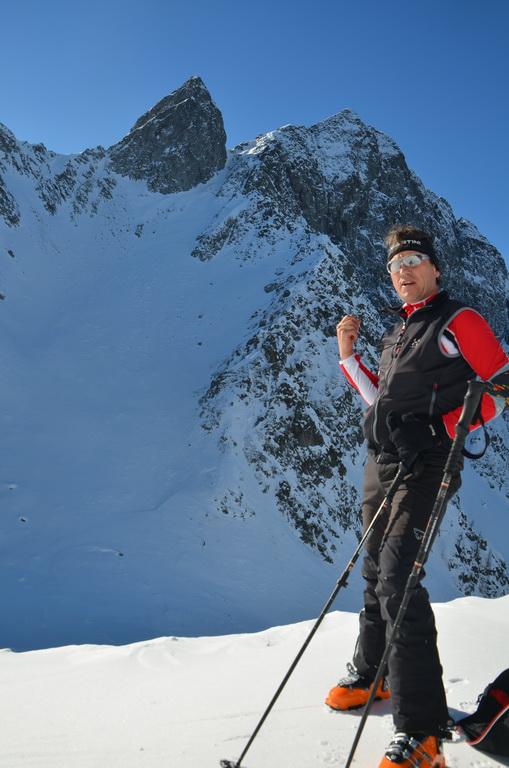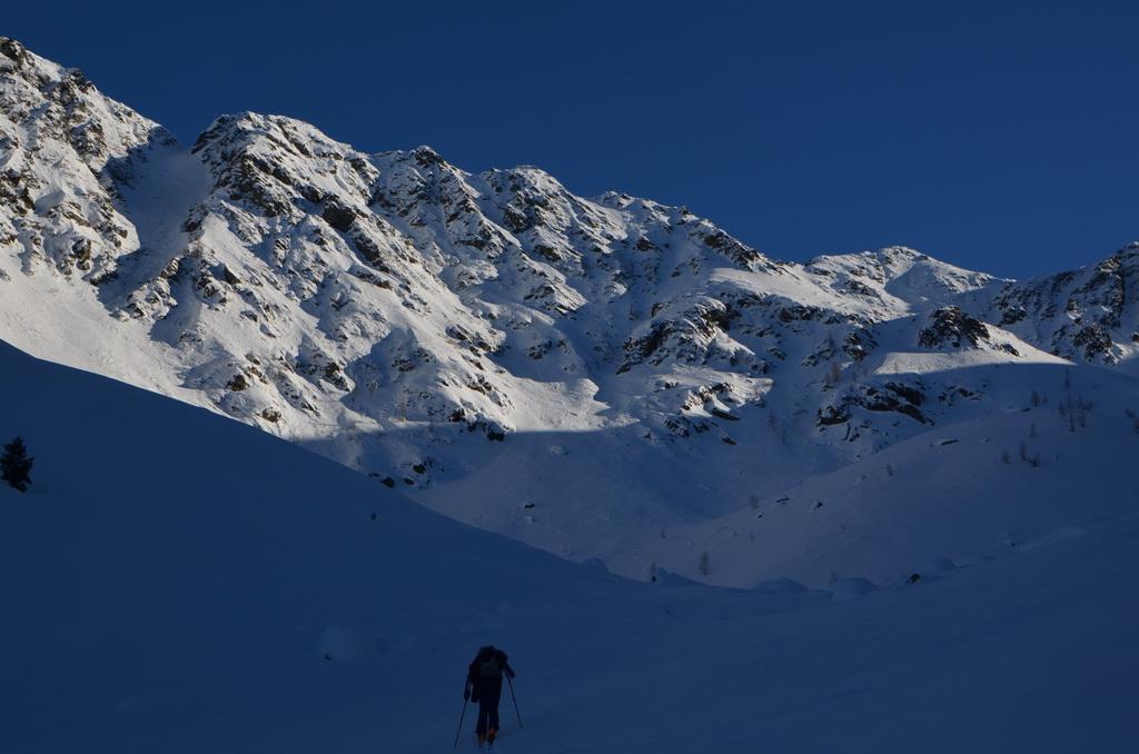Bis zur Obergailer Alm auf eine Höhe von ca. 1400m hatte die Schneedecke bereits eine lästige, harte Kruste die wahrscheinlich vom Regen der letzten Woche stammt. Von hier bis zu einer Höhe von ca. 1800m dann ein wahrer Pulvertraum, welcher dann im breiten Kar unterhalb des Gipfels leider abrupt zu Ende war. Hier konnte man deutlich den Windeinfluss erkennen. Windgepresste und pulvrige Abschnitte wechselten sich ab. Der Gipfelhang war dann im Kammbereich stark eingeblasen und wir haben uns entschlossen unter einem kleinen Felsen 20m unter der Scharte umzudrehen.