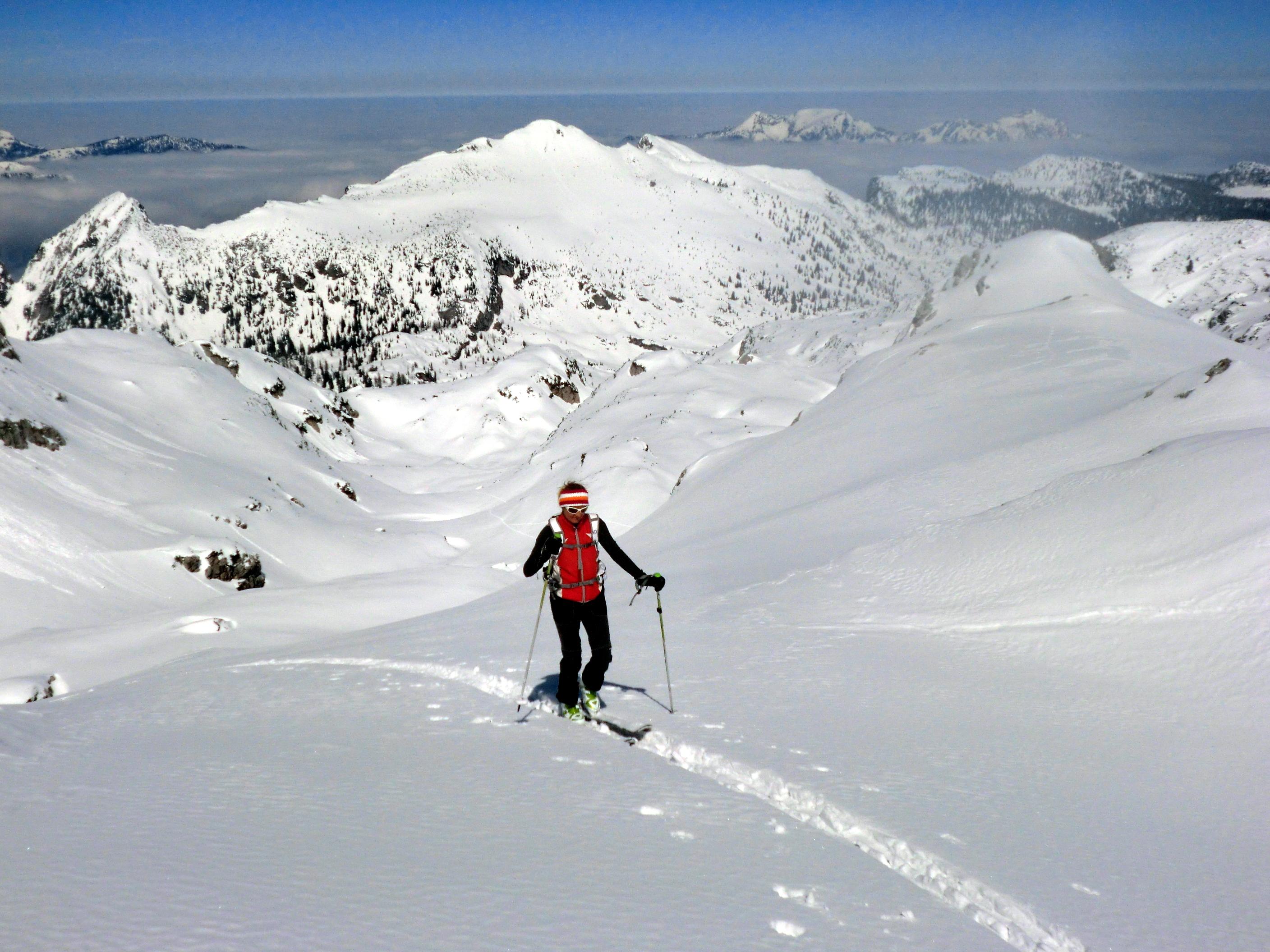 Landschaftlich sehr eindrucksvolle Tour auf der Reiter Alpe. Zuerst auf den Gr. Weitschartenkopf und Abfahrt zur Alten Traunsteiner Hütte - Aufstieg über die Rossgasse zum Wagendrischlhorn - Kurze Abfahrt und Wiederaufstieg zum Plattlkopf - Abfahrt ins Trett über die Steinberggasse - zurück zum Schrecksattel - Abfahrt nach Oberjettenberg.