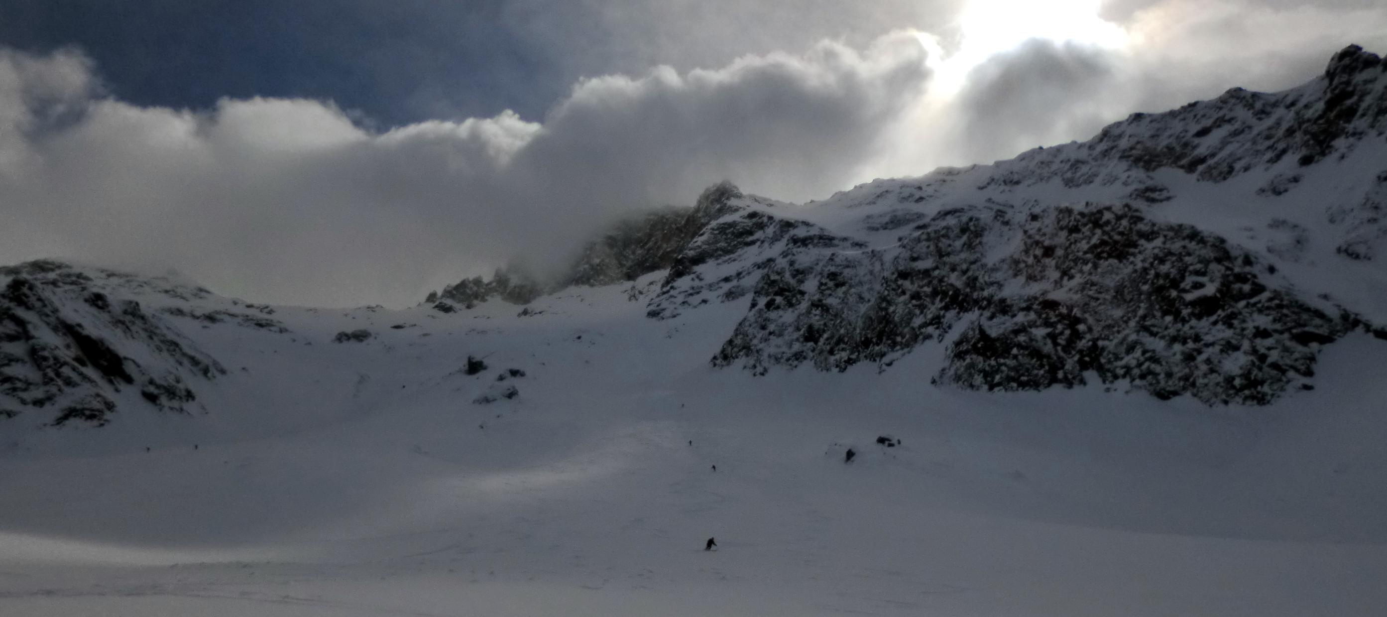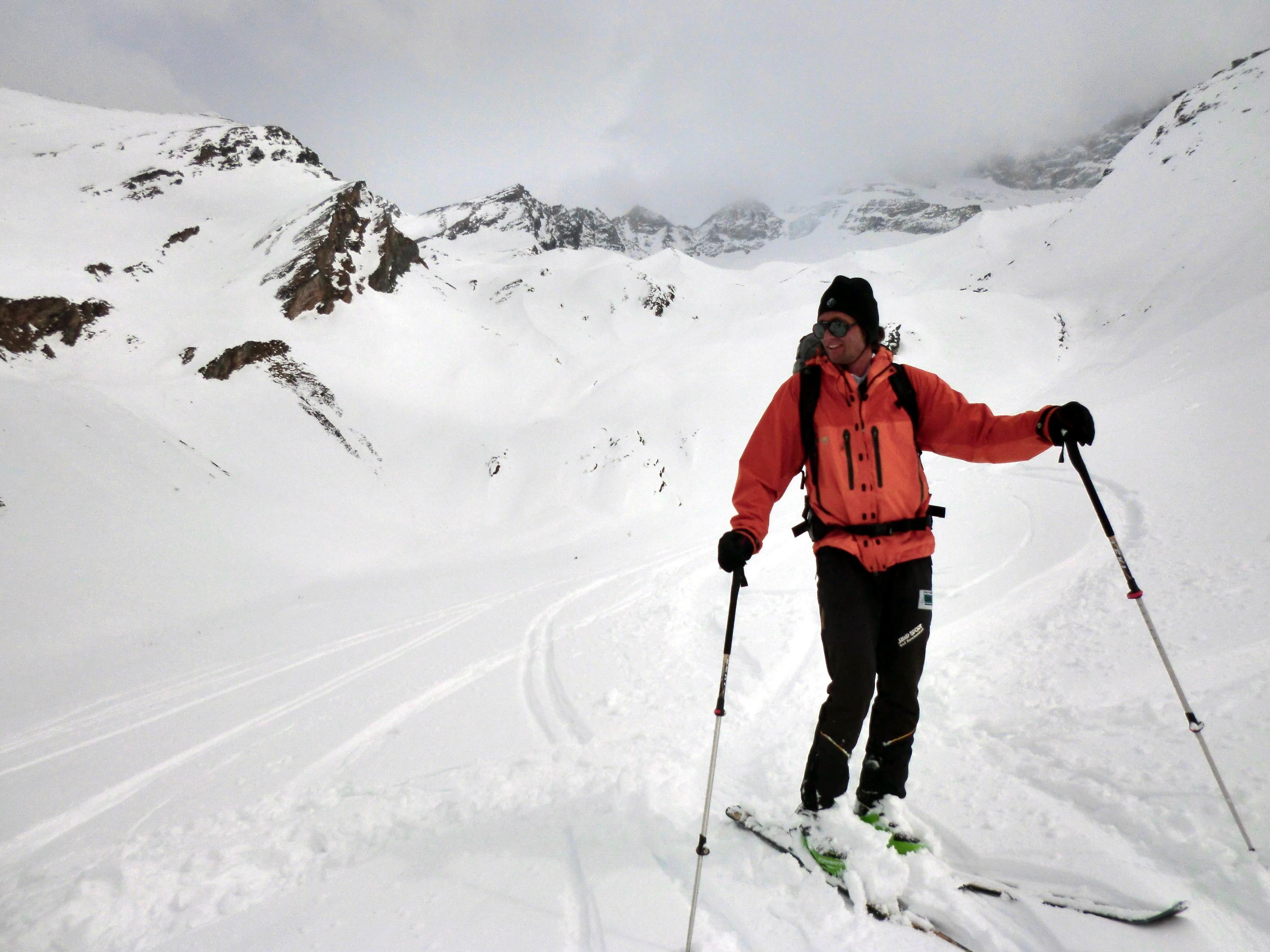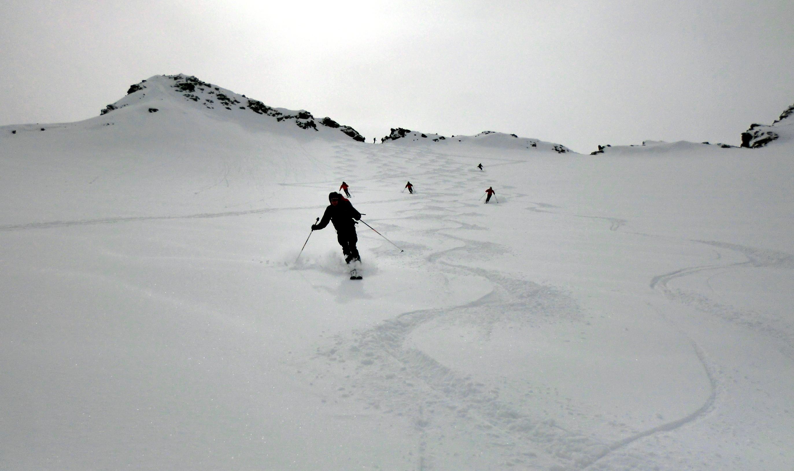 Ebenso wechselhaft wie das Wetter gestalteten sich die Schneeverhältnisse, von hochalpinem Pulver, über Sulz und Bruchharsch war alles dabei. Die Lawinenlage erlaubte fast alle Touren, da der Wind auch während der leichten Neuschneefälle nur mäßig bis schwach war. Insgesamt im Gebiet eine ausreichende und vor allem relativ kompakte Schneedecke. Hohe Ausgangspunkte der Touren, wie im Gebiet reichlich vorhanden, sind sicher zu bald zu bevorzugen.