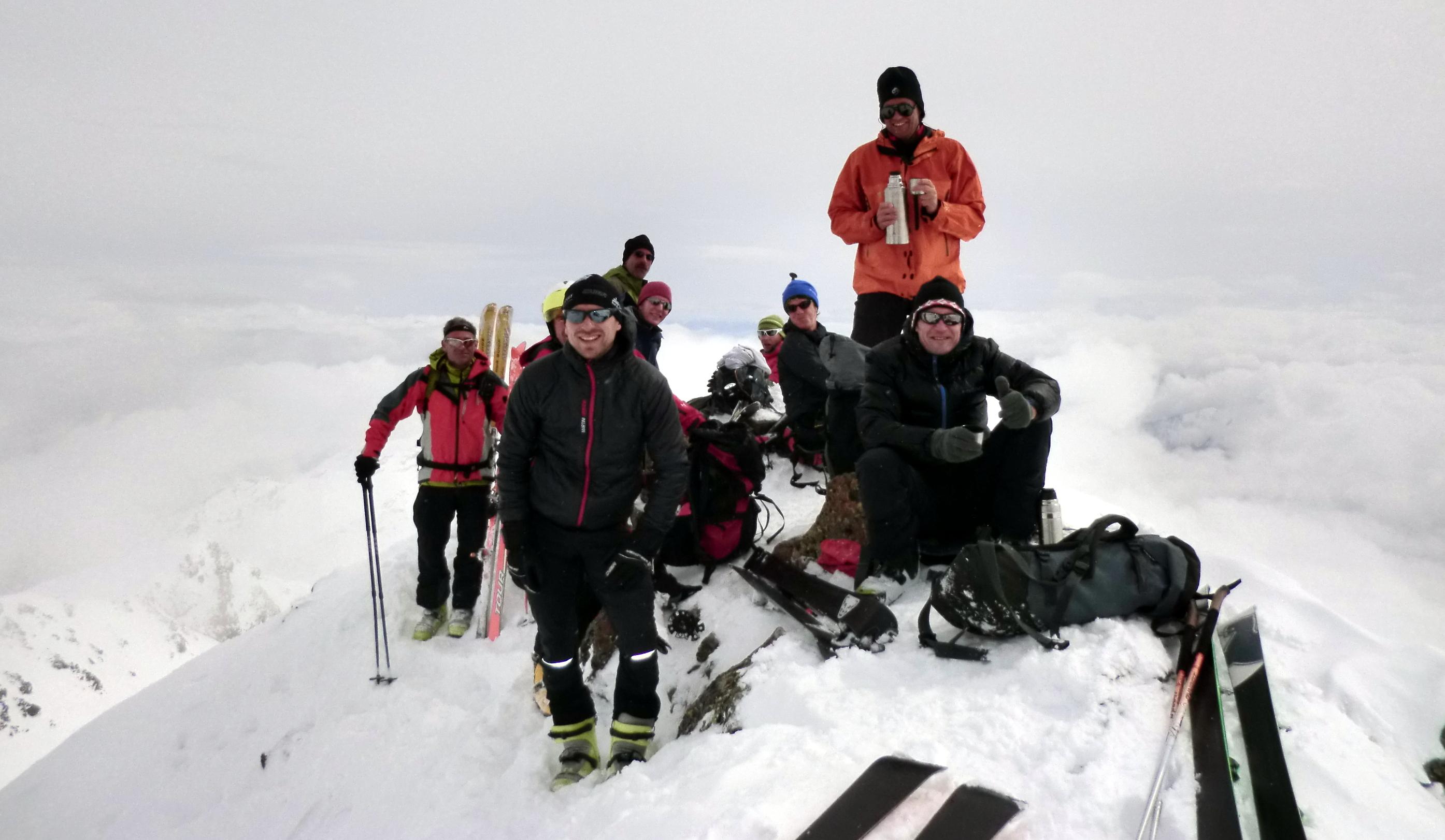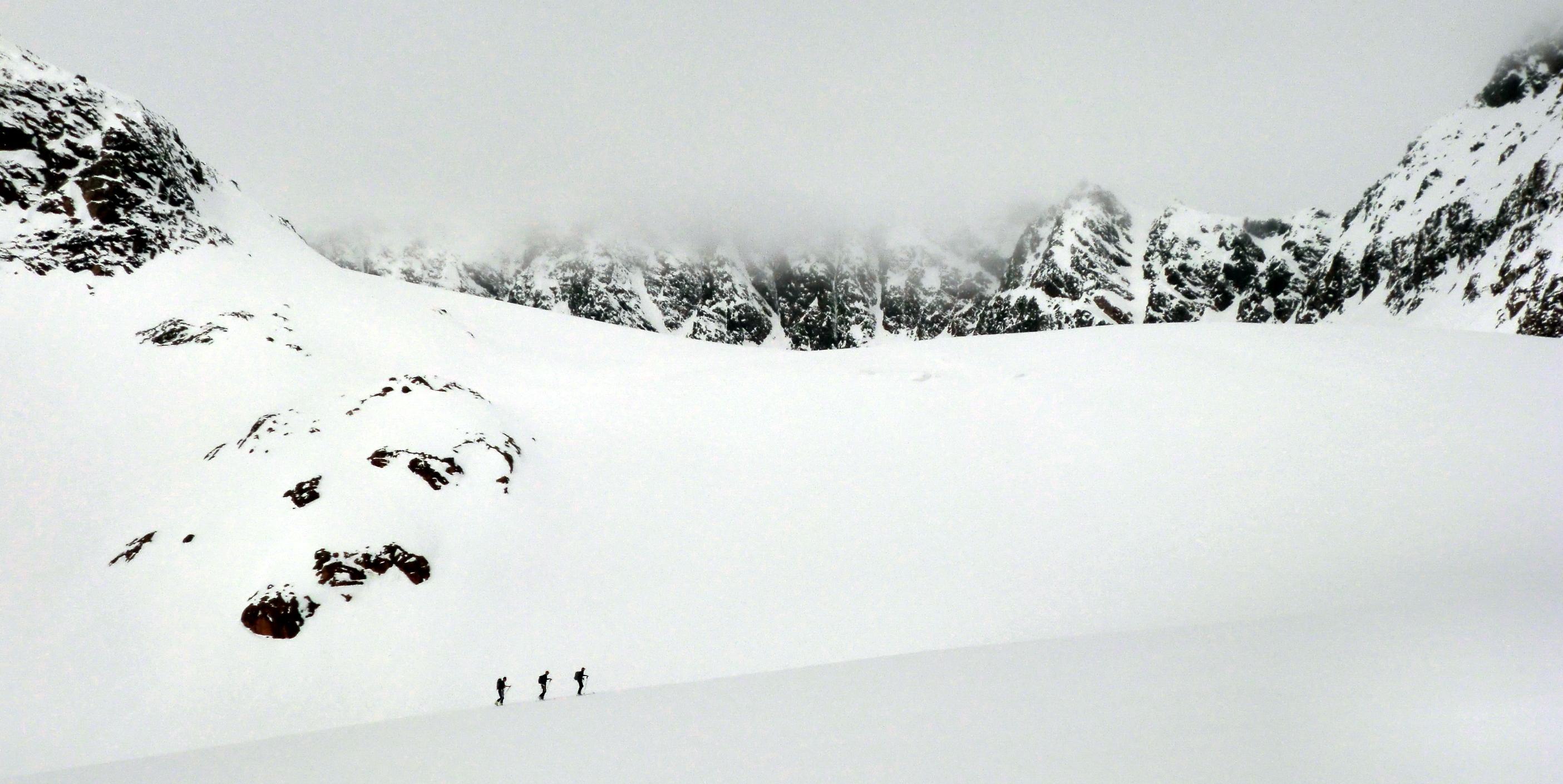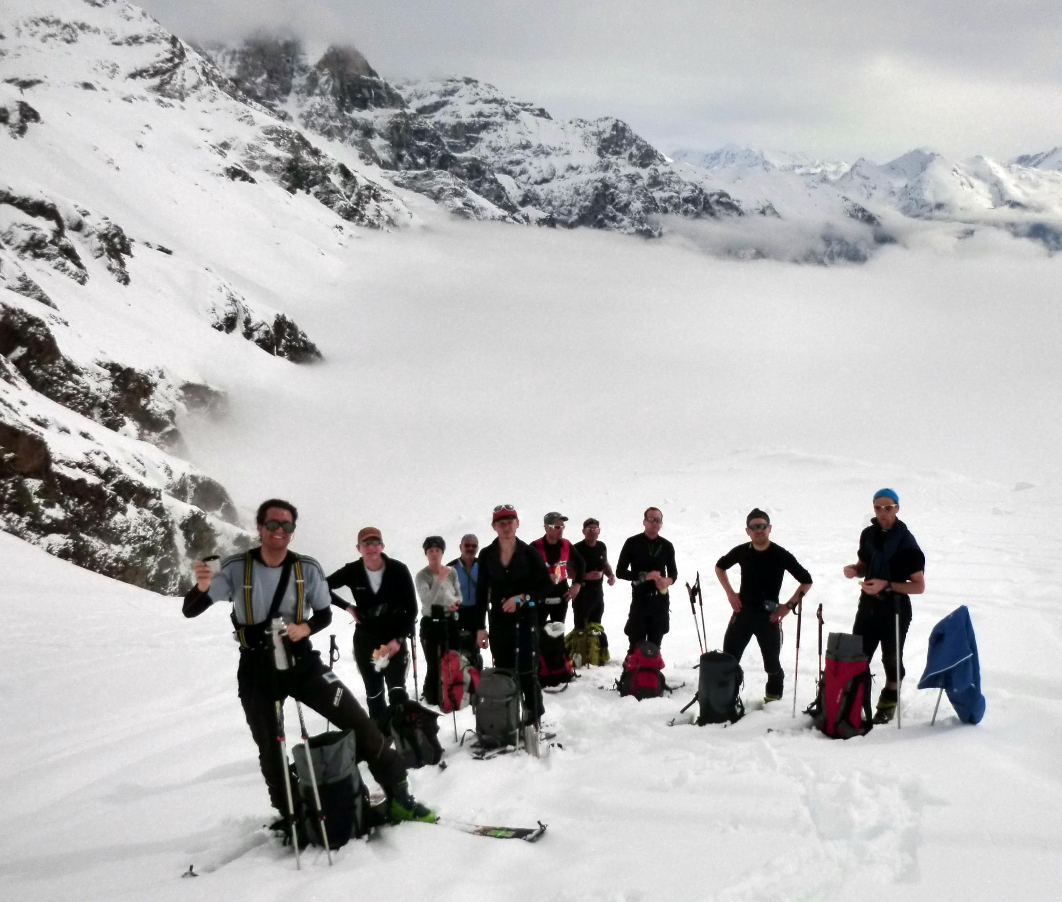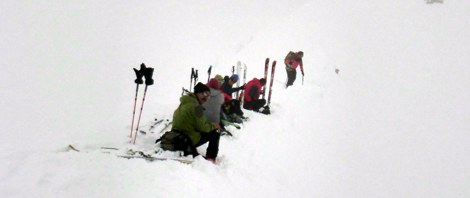 Ebenso wechselhaft wie das Wetter gestalteten sich die Schneeverhältnisse, von hochalpinem Pulver, über Sulz und Bruchharsch war alles dabei. Die Lawinenlage erlaubte fast alle Touren, da der Wind auch während der leichten Neuschneefälle nur mäßig bis schwach war. Insgesamt im Gebiet eine ausreichende und vor allem relativ kompakte Schneedecke. Hohe Ausgangspunkte der Touren, wie im Gebiet reichlich vorhanden, sind sicher zu bald zu bevorzugen.
