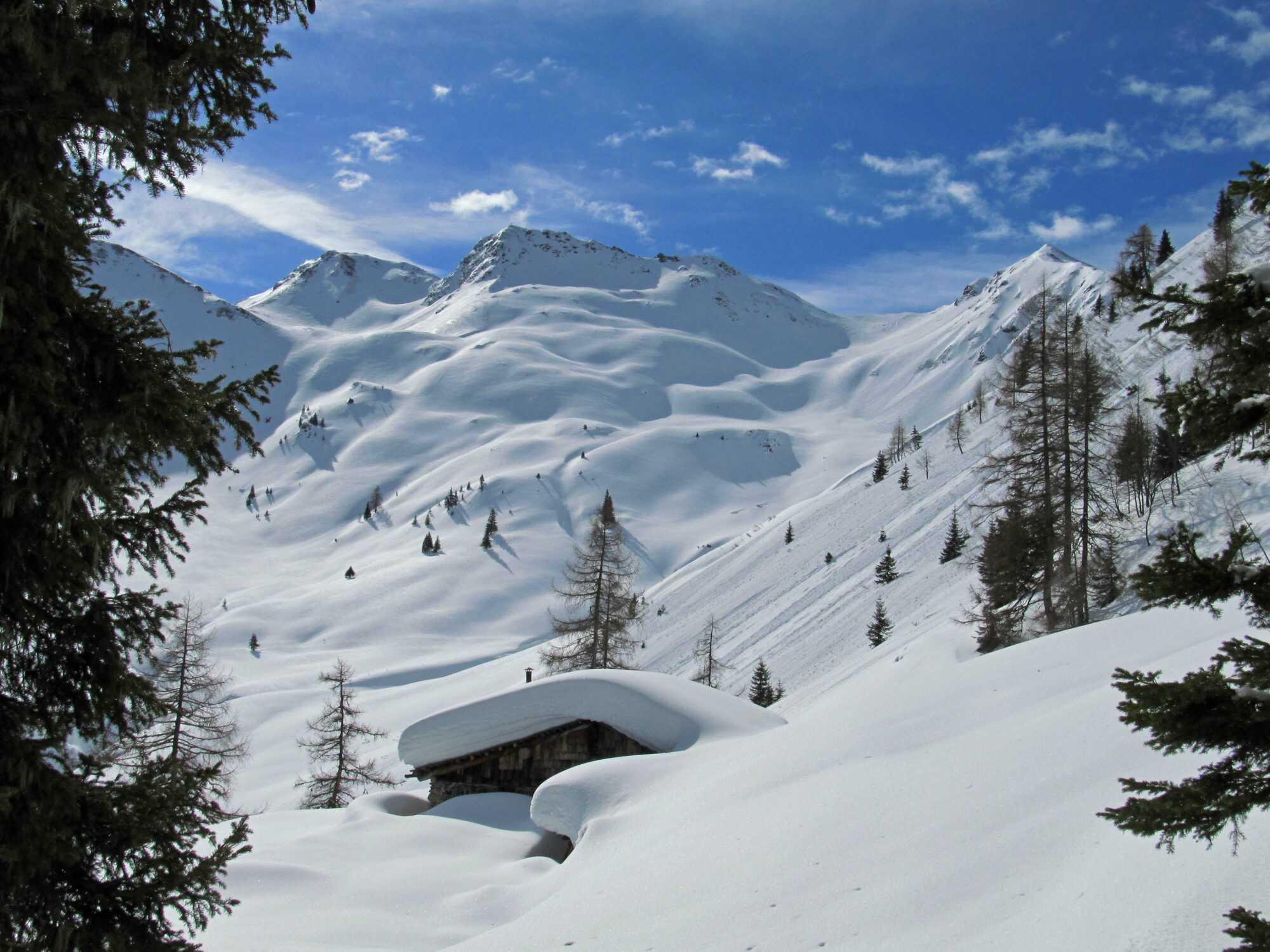 Schneelage: Noch genug Schnee vom PP weg. Schattseitig meist angewärmter Pulver, bis ca. 20cm, teilweise etwas windbeeinflusst. Sonnseitig in der Früh tragender Harsch, später weichwerdend, südseitig auffirnend.
