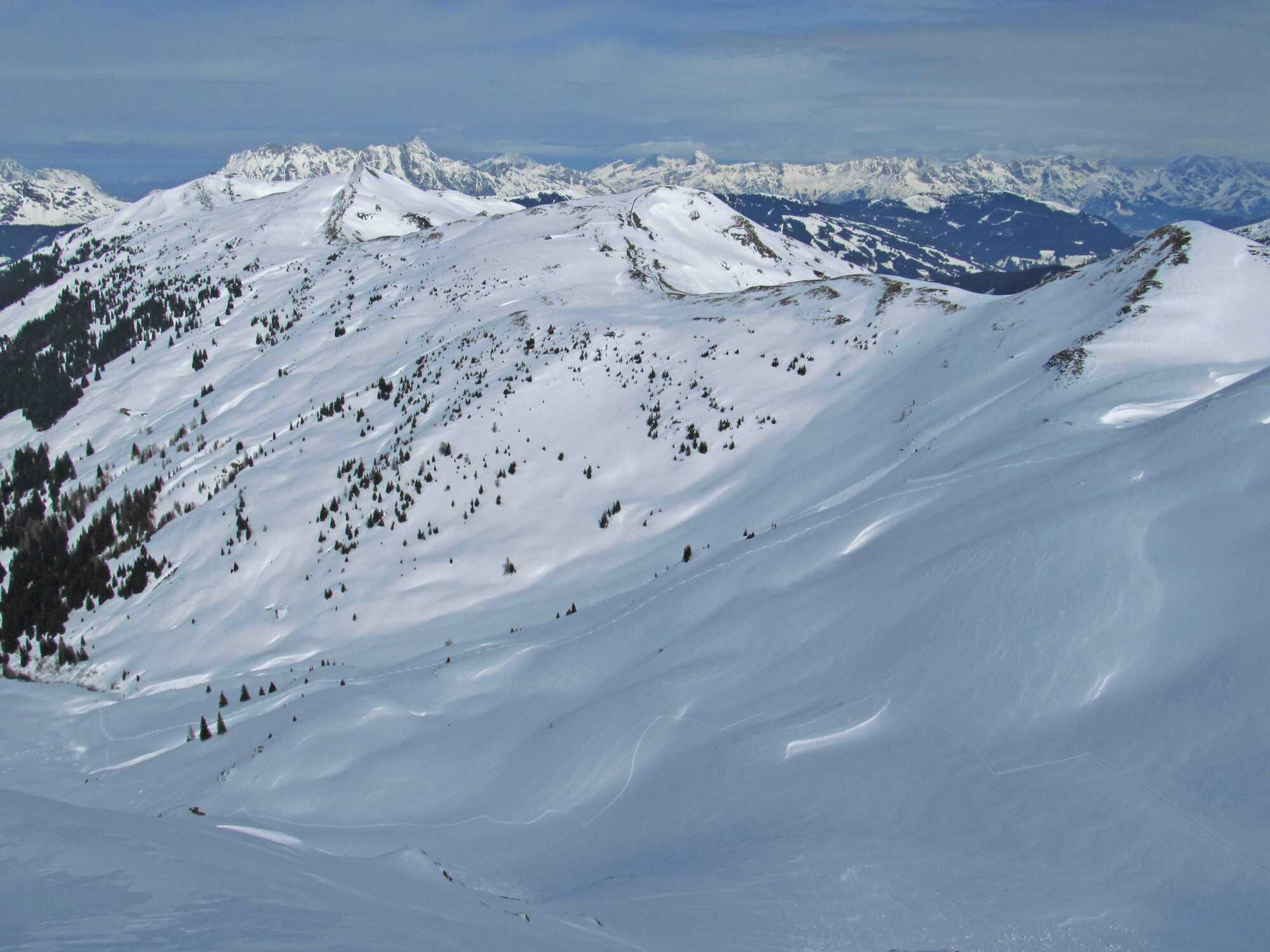 Von Hinterglemm/Schwarzachengraben (1260) über die Huber Hochalm(1734) und Kegerlalm zum Hochsaalbachkogel (2215) aufgestiegen. Abfahrt von der westl. Schulter unterm Gipfel direkt N-seitig hinab zur Polzalm (ca. 1700). Wiederanstieg zum Medalkogel (2123) und Abfahrt vom Gipfel direkt zurück über Huber Hochalm.