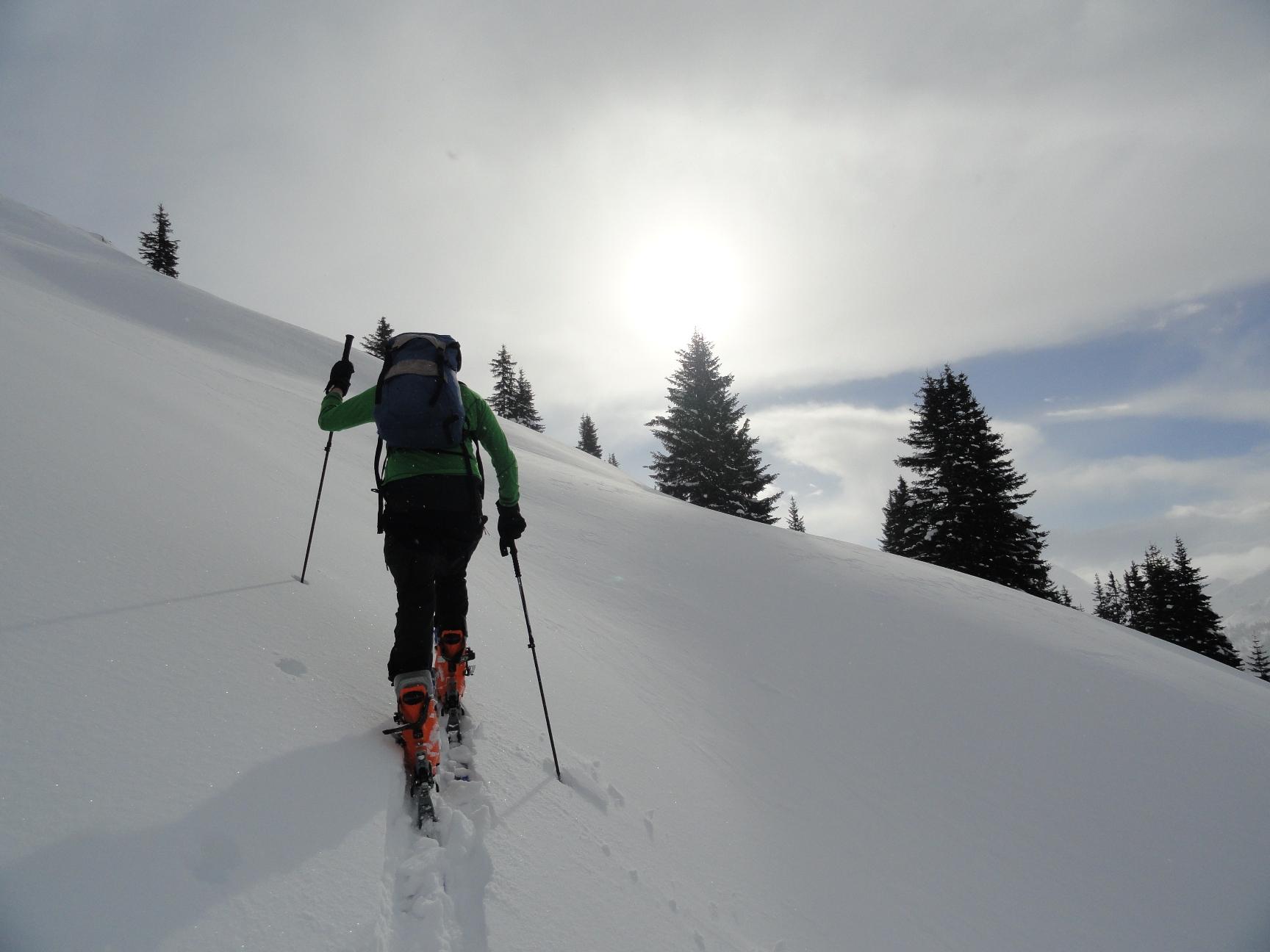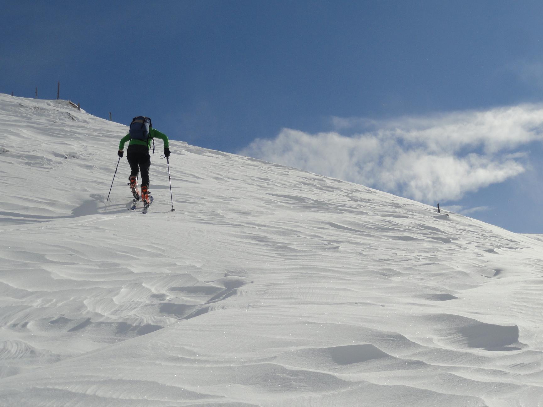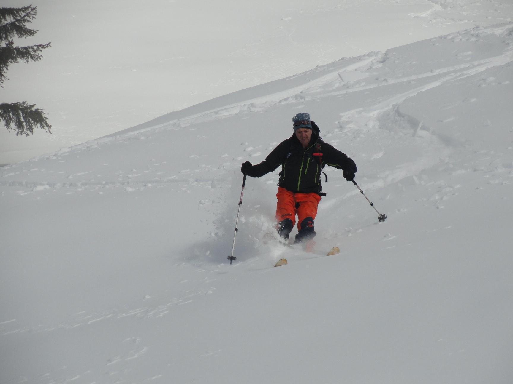 Da diese Aufstiegsvariante offensichtlich nicht viel begangen wird, bedeutete dies, Spurarbeit von unten bis oben. Die Abfahrt war dann genussreicher als gedacht. Die dünnen Schollen der Kruste flogen beim schwungvollen Befahren in hohem Bogen davon.