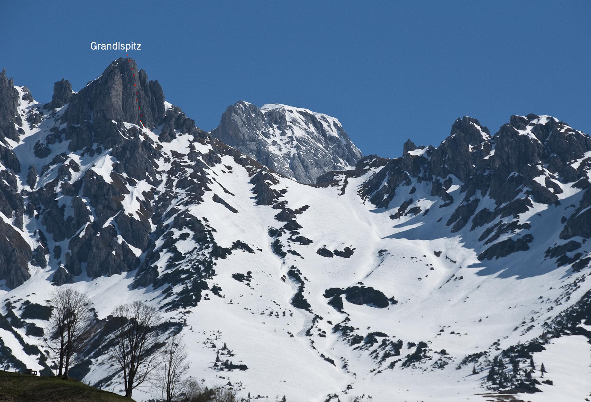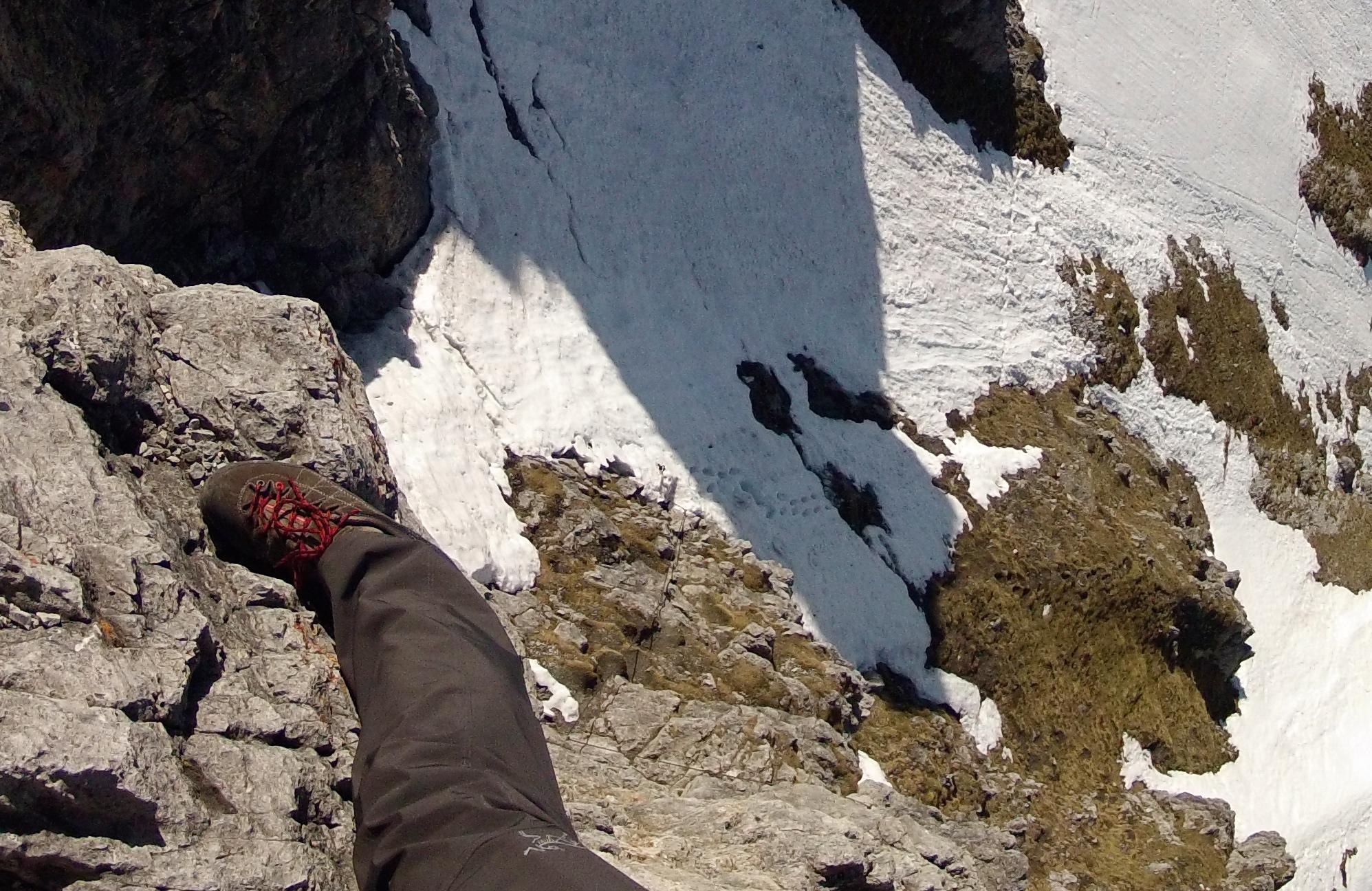 Solange die Schneefelder unter der Grandlspitz im Schatten sind, ist eine gefahrlose Querung zum Einstieg des Klettersteigs möglich.