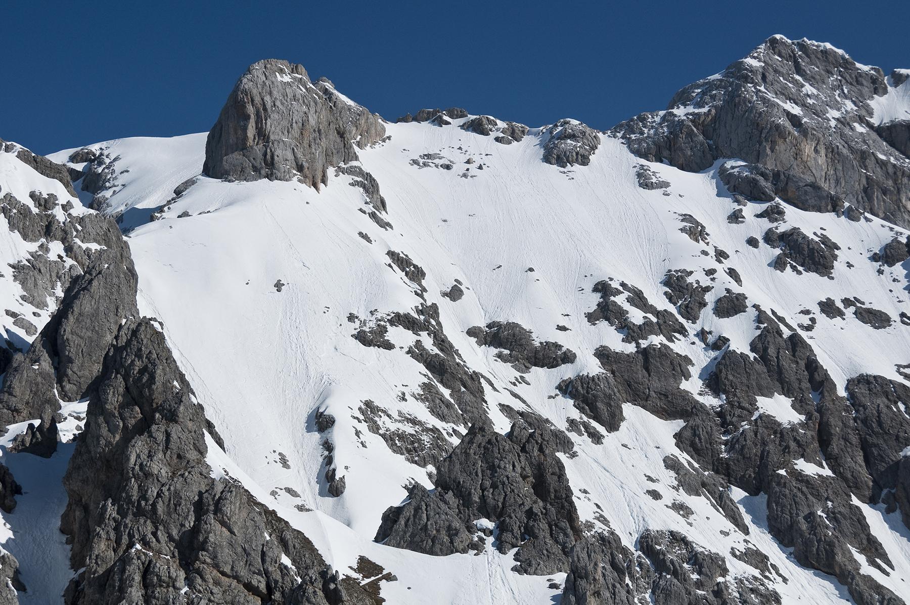 Fast vom Deantner Sattel aus noch genug Schnee, der zur Scharte hinauf sogar über Nacht einen Harschdeckel bekommen hat.