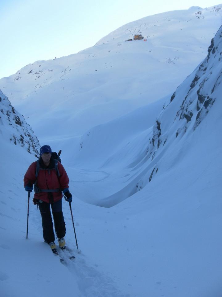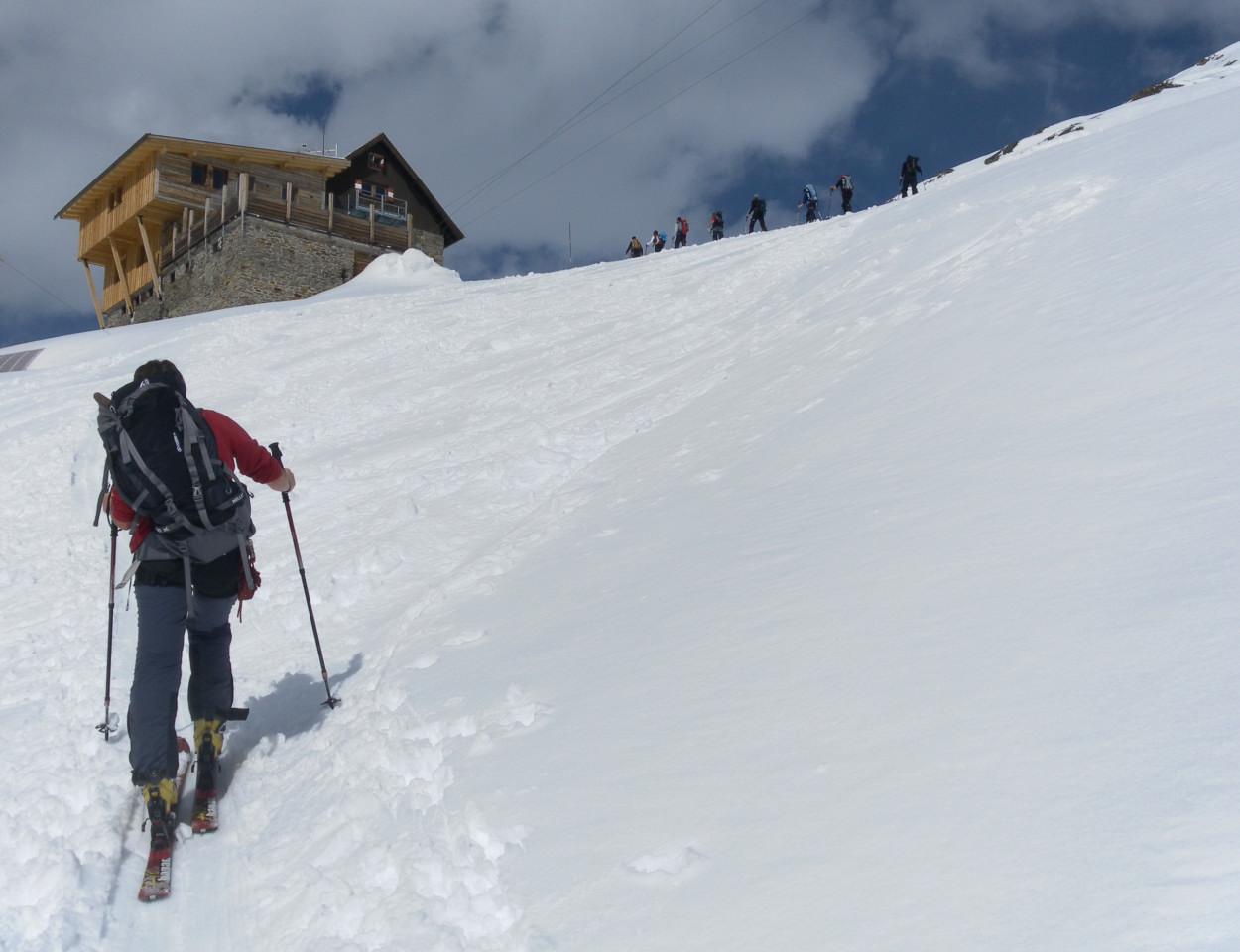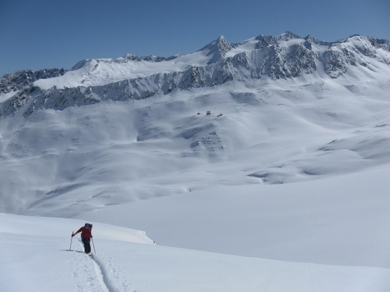 Von Obergurgl wählen wir am Dienstag nicht die Ratracspur zur Langtalereckhütte, sondern überschreiten das Eiskögele von Norden über den Hangererferner. Bei eisigem Wind erreichen wir den empfehlenswerten Tourenstützpunkt per 800HM Edelbruchharsch-Abfahrt breitbeinig in Spitzkehrentechnik.