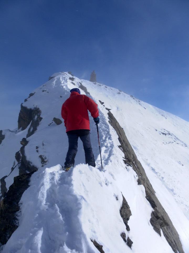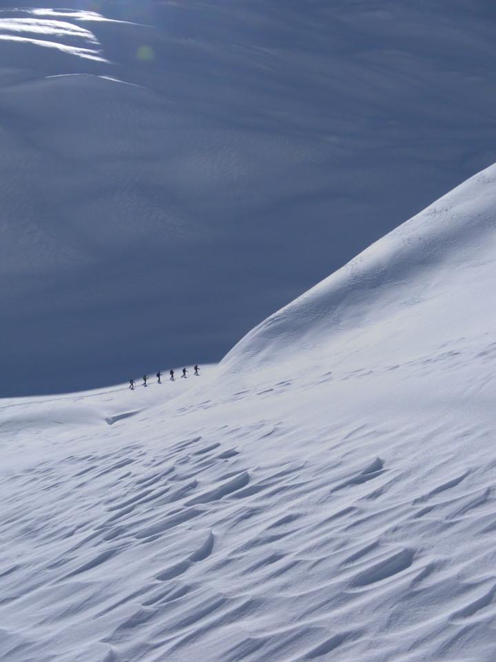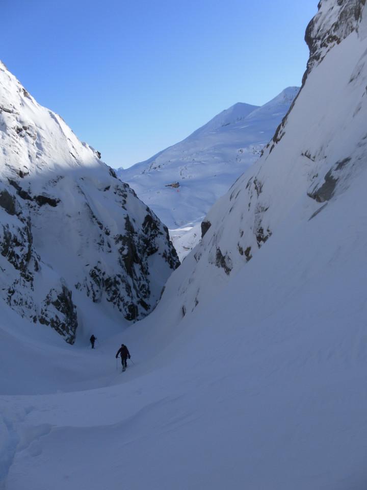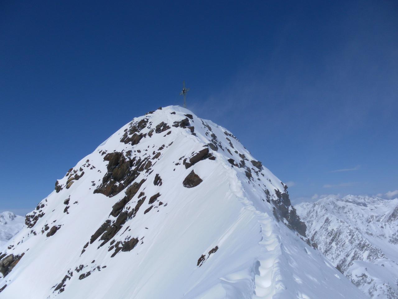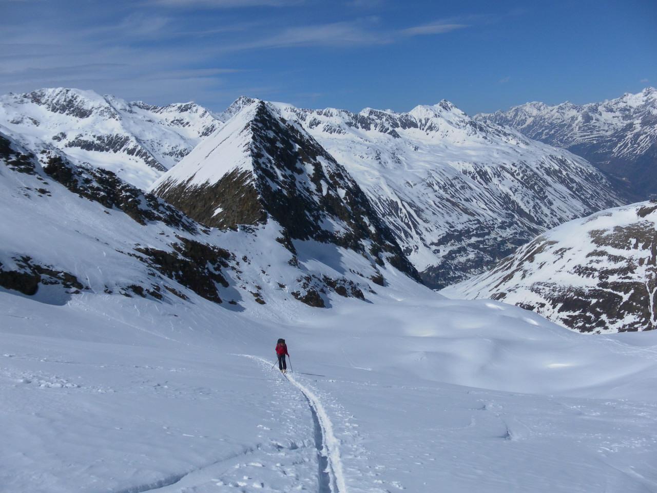 Das Zwischenhoch am Donnerstag ermöglicht nach sehr lokal-persönlicher Auskunft des Hüttenwirts zur Lawinensituation: "da Schuppn isch ned zuagwachlt, do kenntsch ois doa, obn segtsch es dann scho, wias duad", die Besteigung des Schalfkogels 3537m. Pulverabfahrt.