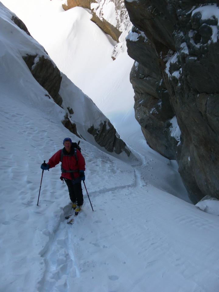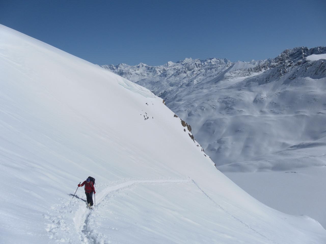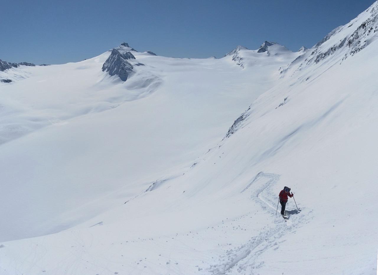 Fünf Tage stark durchwachsenes Wetter, sehr gute Schneelage (no na, so hoch oben), die Spalten gut eingeschneit, ausser kleine Triebschneerutscher recht stabile Schneebedingungen.