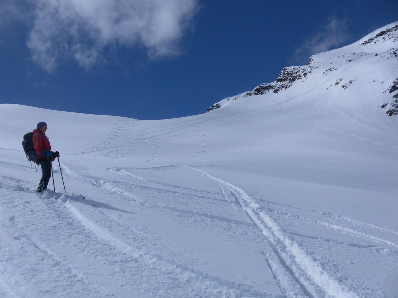 Intesiver Schneefall tags darauf führt uns über die Ratracspur ins Skigebiet und ohne Gepäck als Pistentour zur Hohen Mut.