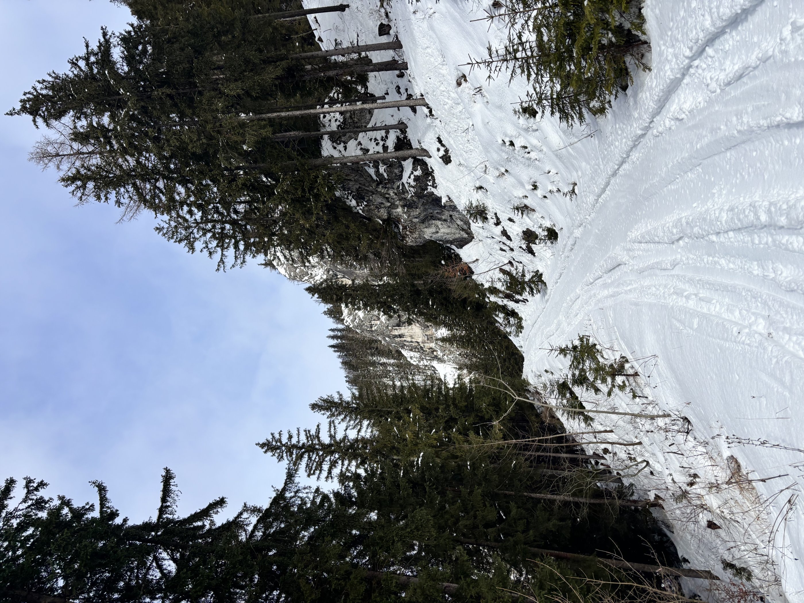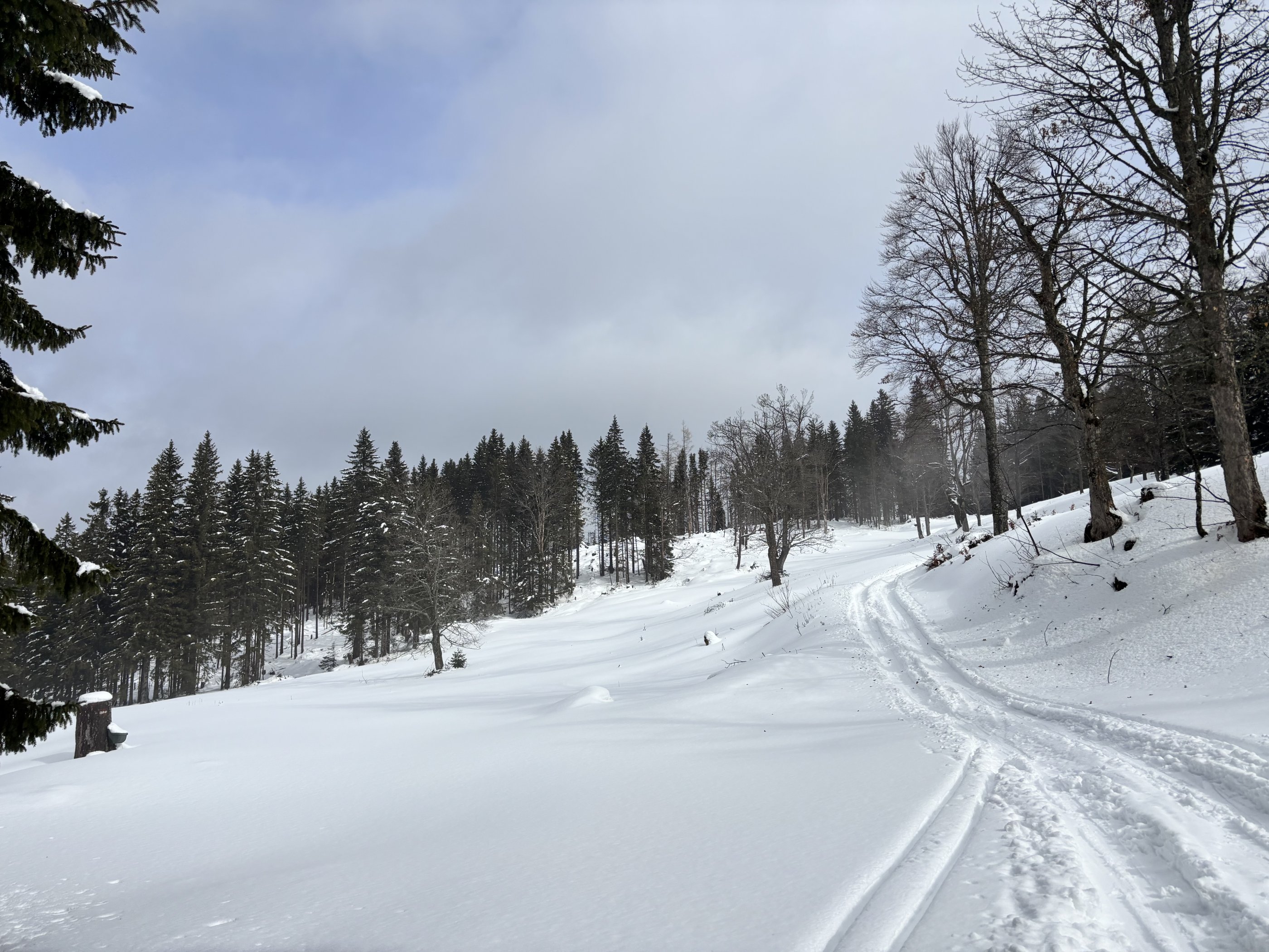 Auf der Forststraße ausreichend sehr nasser Schnee, auf den Wiesen genug schwerer Schnee, um die meisten Hindernisse gut abzudecken. Für eine Abfahrt durch den Lechnergraben aber zu wenig.
