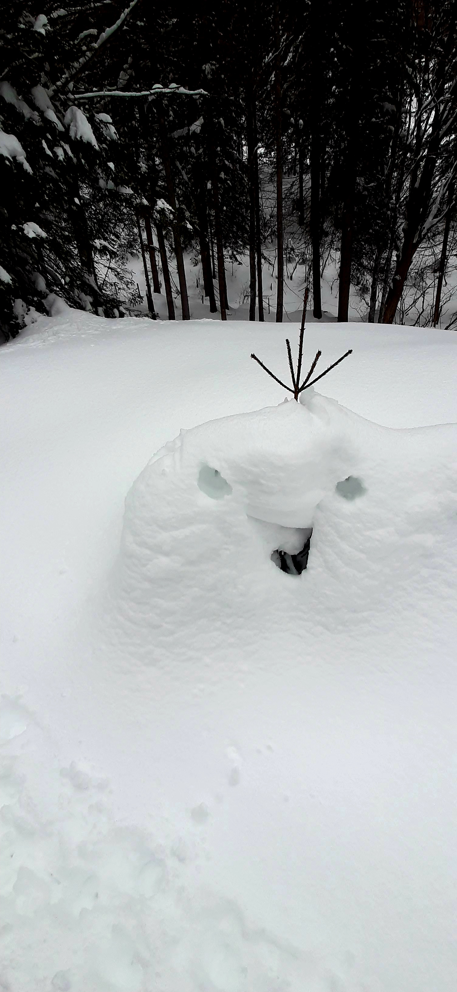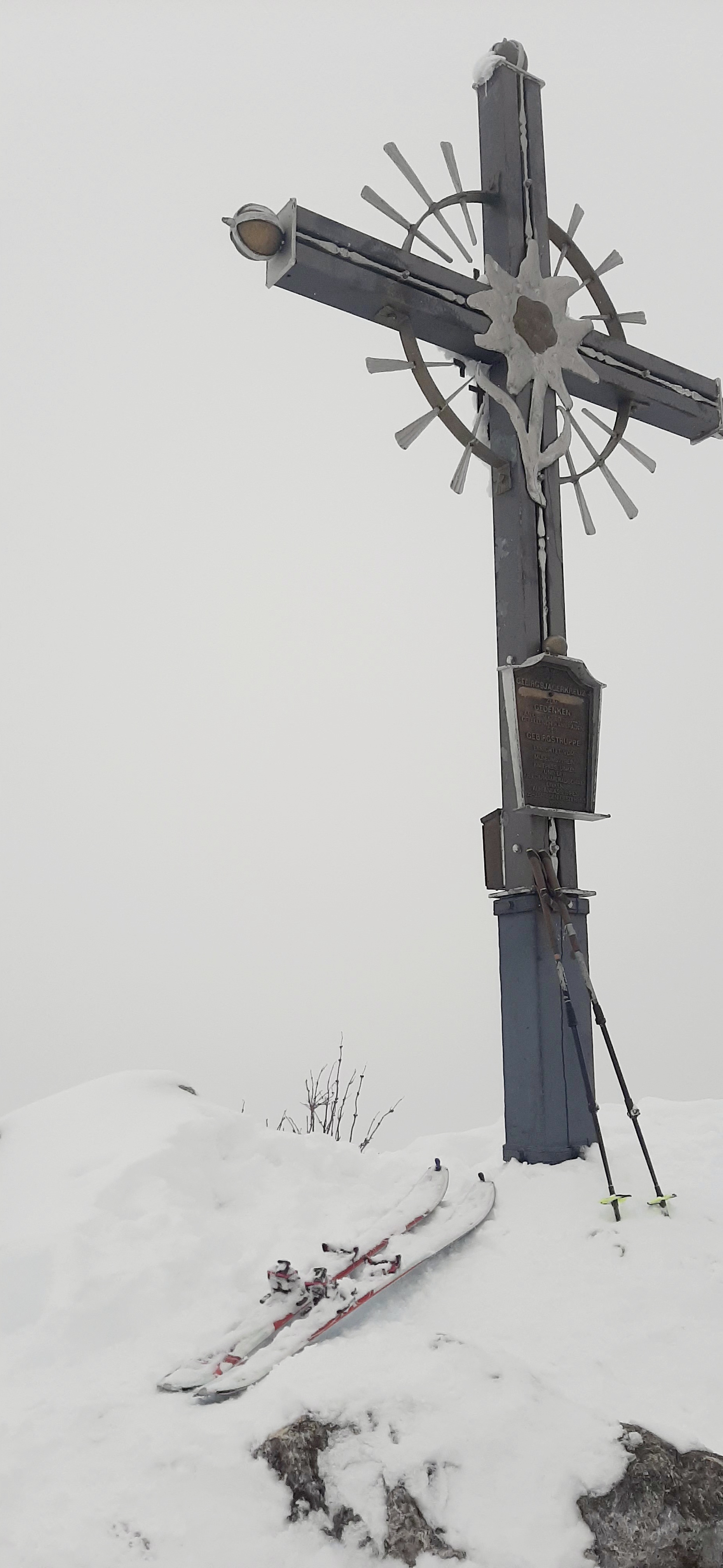 Die von den Berichten am Wochenende erwähnten „Wumm Geräusche“ haben wir nicht gehabt aber die Sonne am Wochenende hat sicher geholfen. Eine halbwegs Unterlage unter ca. 30 cm Neuschnee mit recht viel Graupel. Wind war bis kurz vor dem Gipfel nicht zu spüren und die Wolken haben nur manchmal etwas aufgemacht. Aber der Wind hat sicher oben gut einiges verfrachtet, was man nur nicht gesehen hat.