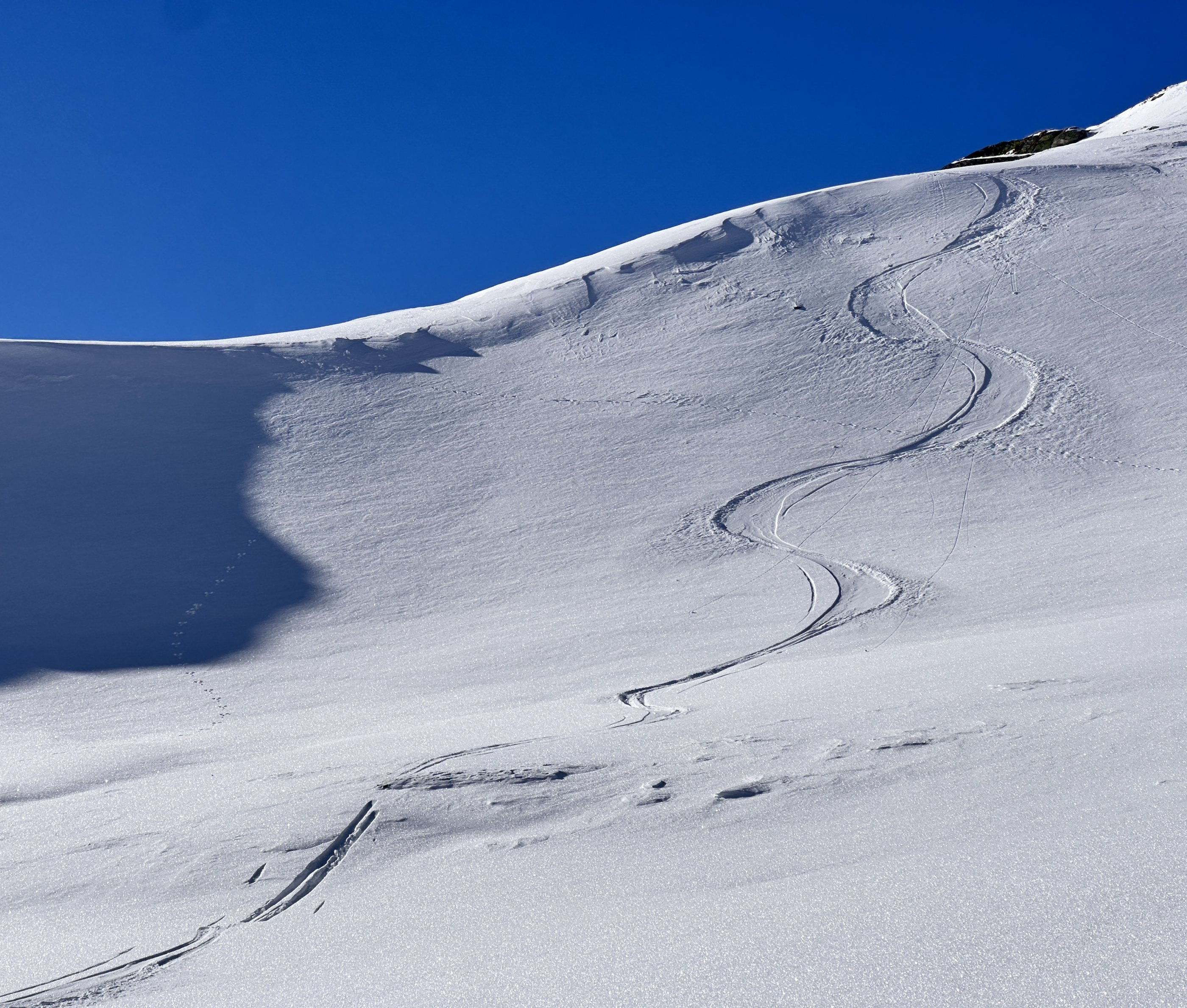kaum Schnee- die eingewehte Rinne ist schon sehr gut umgeflügt worden. Also eher geringe Lawinengefahr ;-)