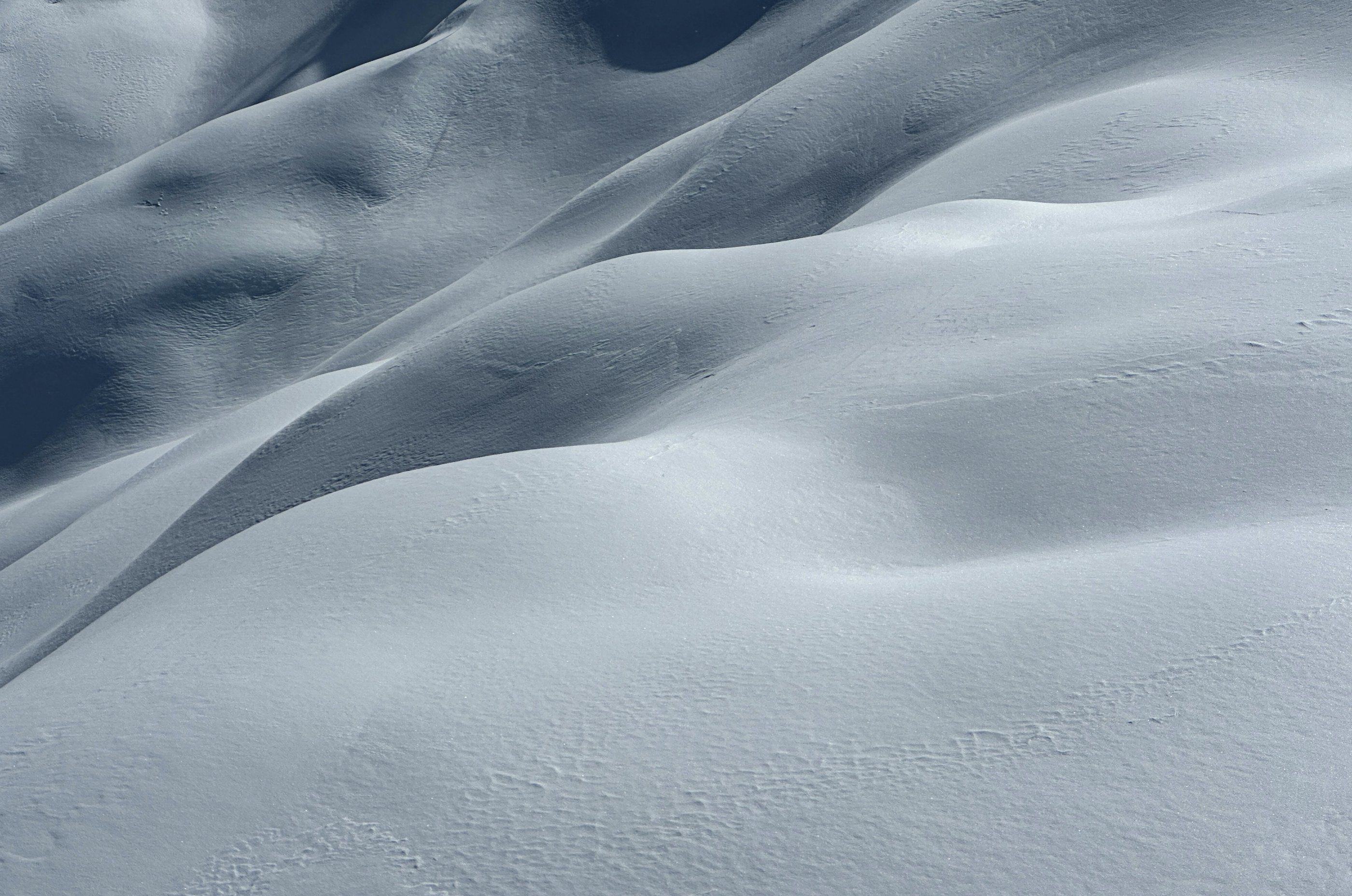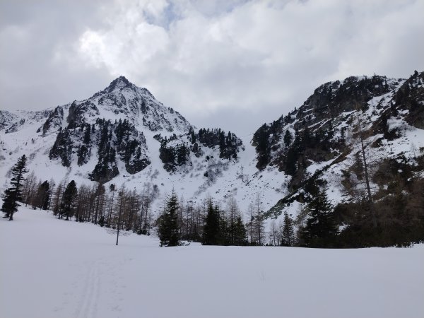 Für die Abfahrt hat er dann auch auf "finster" geschaltet, diffuses Licht und schwacher Schneefall. Wie gut, dass der Pulverschnee leicht fahrbar ist. Trotzdem muss man wegen der Dolinen sehr aufpassen.