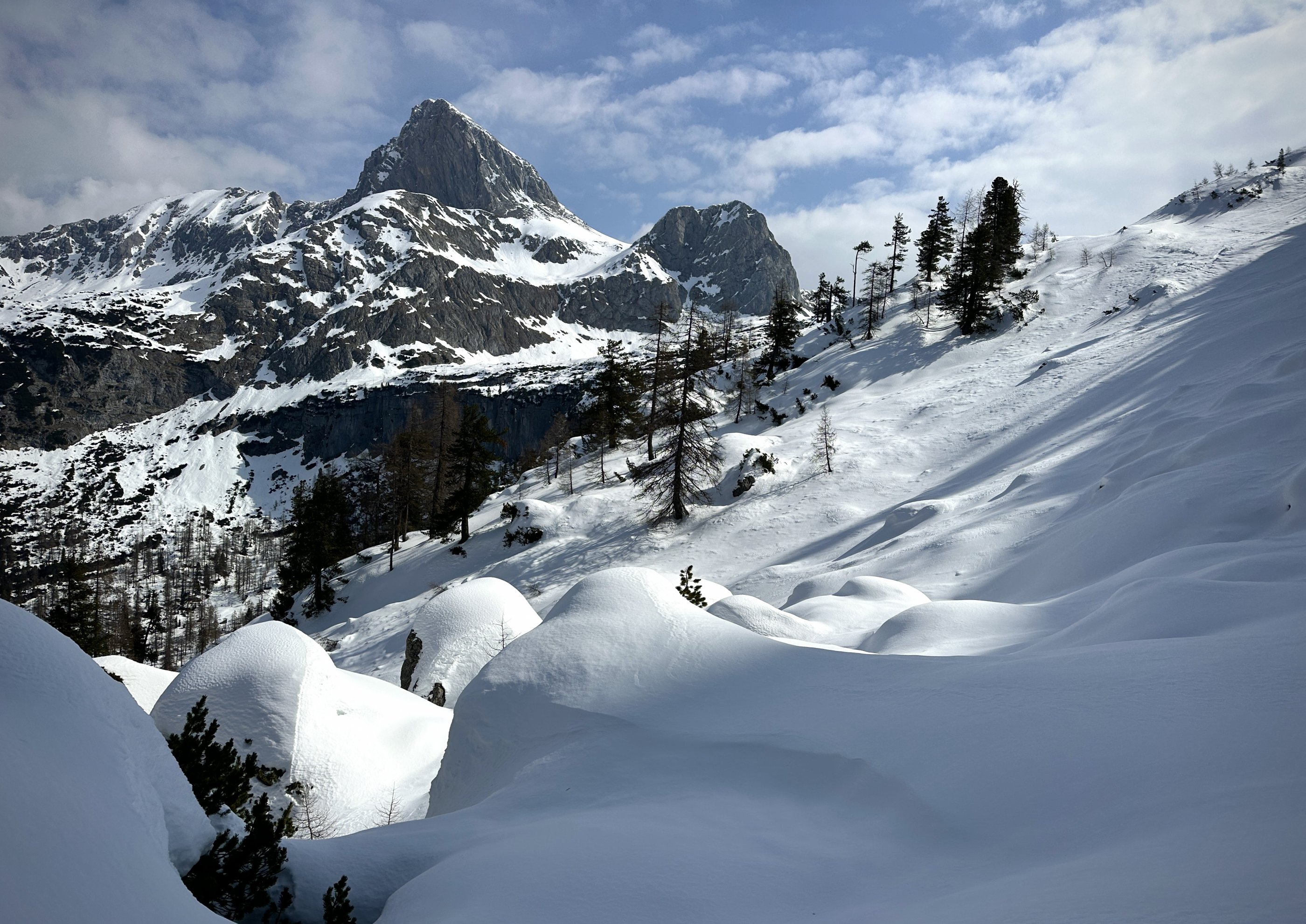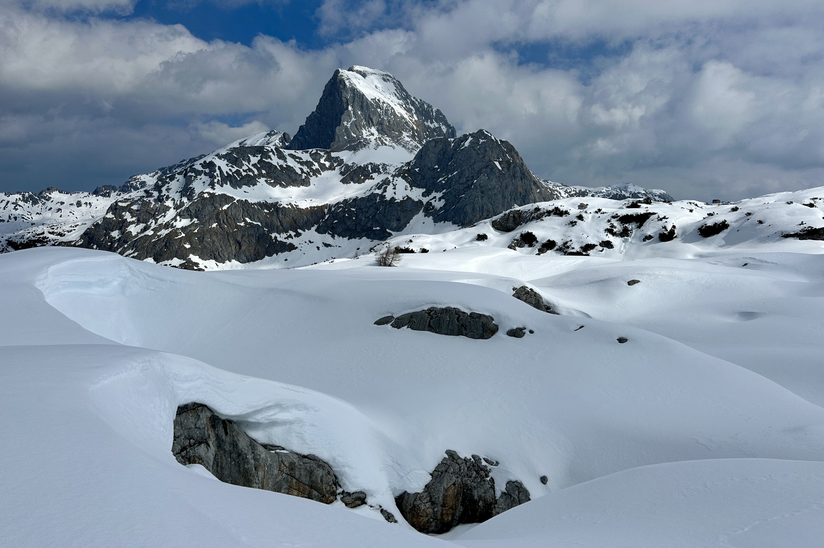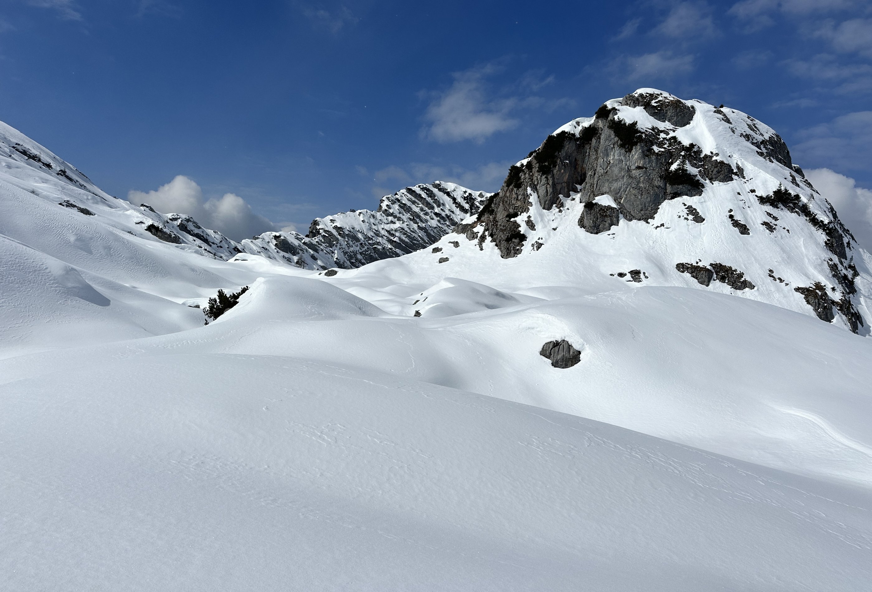 Zwischen Seehorn und Spitzhörndl verlässt man den Weg zur Materialseilbahn und sucht sich rechts hinauf einen Weg durch Felsbänder und Dolinen bis zu den steilen Hängen unterm Spitzhörndl. Nordseitig davon kommt man auf die Hochfläche und die Finsterbachköpfe werden sichtbar. Etwas Gespür braucht's, um in den Wellen des Meeres den Weg zum Finsterbachkopf zu finden. Dann mache ich ein Skidepot. Wahrscheinlich geht das auch viel einfacher. Für die letzten 10 Meter zum Gipfel brauche ich schließlich eine halbe Stunde! Warum? Ich traue mich nicht nah an den Kamm wegen der Wechte, die von Norden nicht beurteilbar ist, und muss deshalb in der steilen Wand darunter mit haltlosem Grieselschnee über gefrorenen Felsen kämpfen. Immer wieder rutsche ich einen Schritt zurück, und will dabei nicht auch noch in die Randspalte zwischen Schnee und Fels rutschen, die vielleicht gar nicht tief ist, aber brrrrr, schwarzes Loch... . Mimimi.