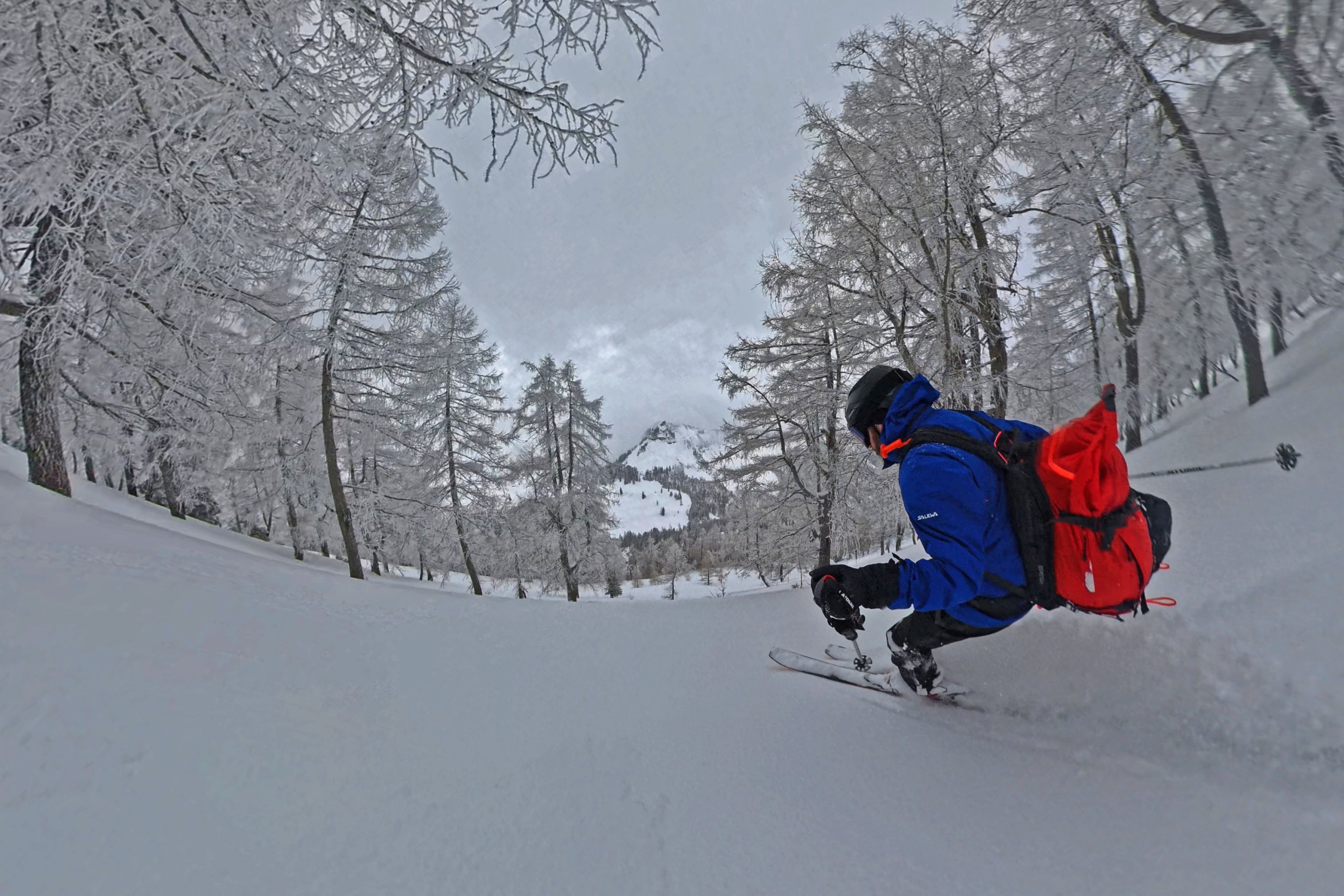 Oben kurz vor dem Gipfel war es einfach nur noch weiß, der Schnee recht windgepresst und daher sparen wir uns die letzten 15 Minuten bis zum Gipfel und genießen das Hinabschweben im Pulver/Graupel Mix. Unten auf der Genneralm hat trotz Wolken der Schnee schon ziemlich was von der Strahlung mitbekommen. Dafür gab es noch Aussicht Richtung Hochwieskopf, First , Gennerhorn und auch Faistenauer Schafberg. Da sieht man dann doch das es leider nicht viel Schnee hat aber wir machen das Beste draus und das war heute schon ziemlich geil!