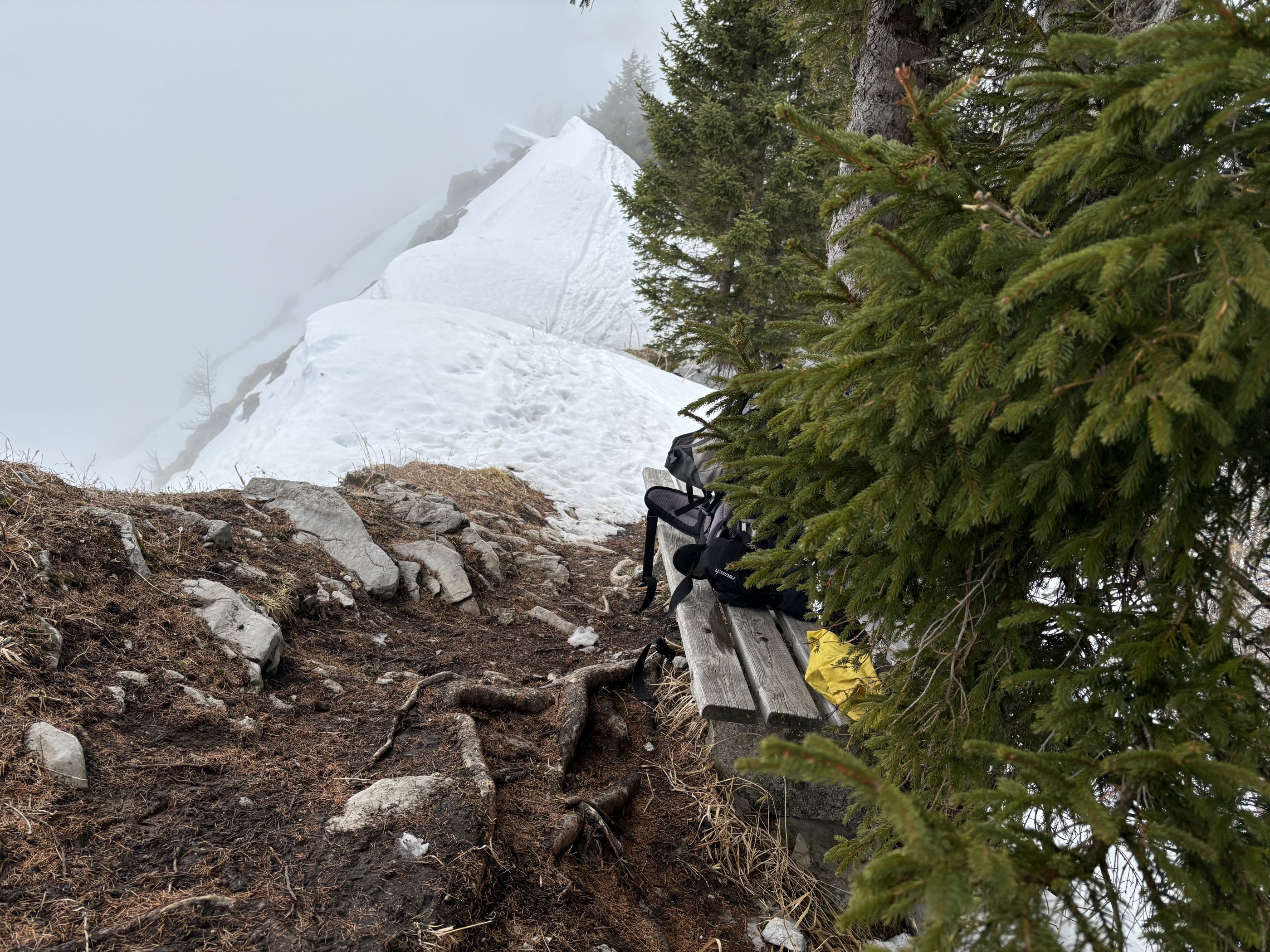 Nasser Schnee bis oben. Vom Kehlstein/Mandlgrat hört man die Feuchtschneerutsche rumpeln.