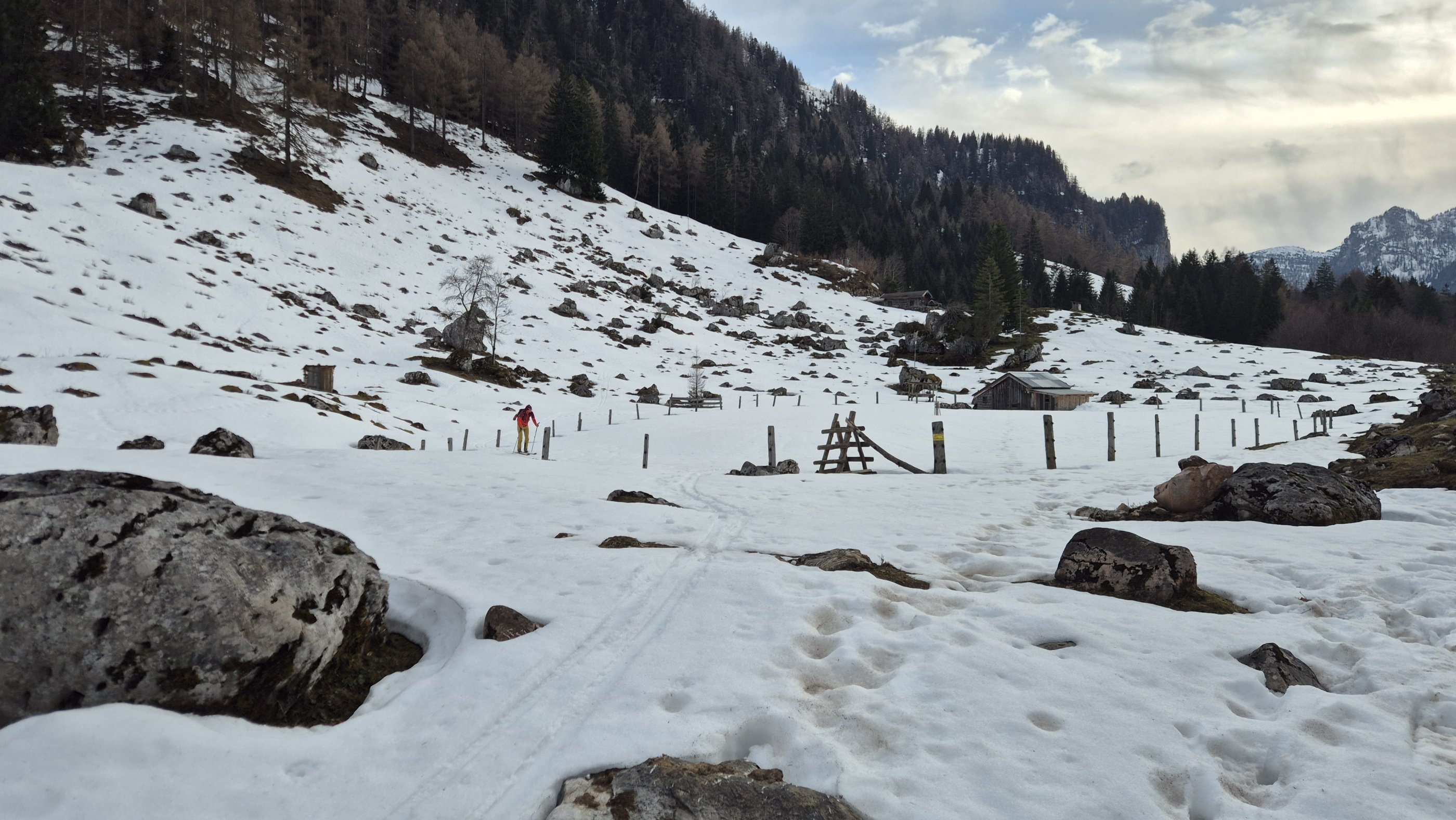 Es war eine abwechslungsreiche Tour mit Schitragen auf aperen Flächen oder auf hartem Schnee mit Steigeisen, steile Querungen, sieben mal Auffellen, Felsstufen umfahren zurückgehen oder, wenn es nicht zu hoch ist hüpfen. Geländekenntnis, vorausschauendes Fahren, vergleichen mit der digitalen Karte und Ausschau halten nach Markierungspunkten sind notwendig um über das Hagengebirgsplateau einen guten Weg zu finden.