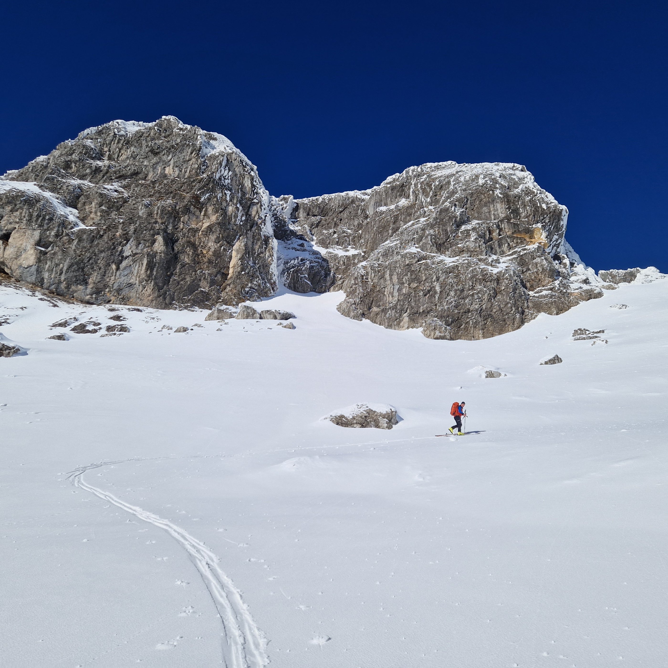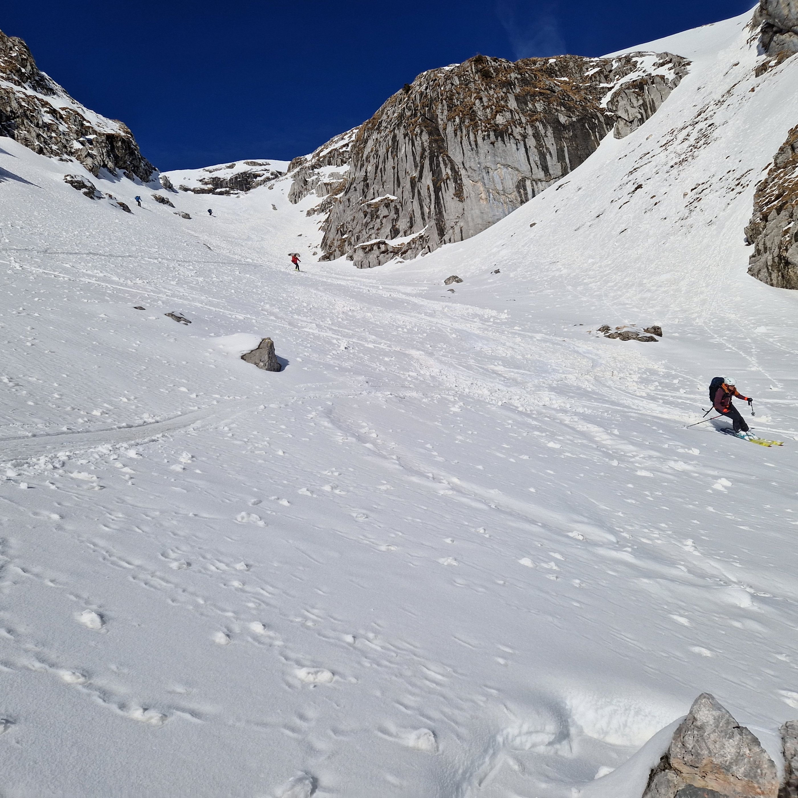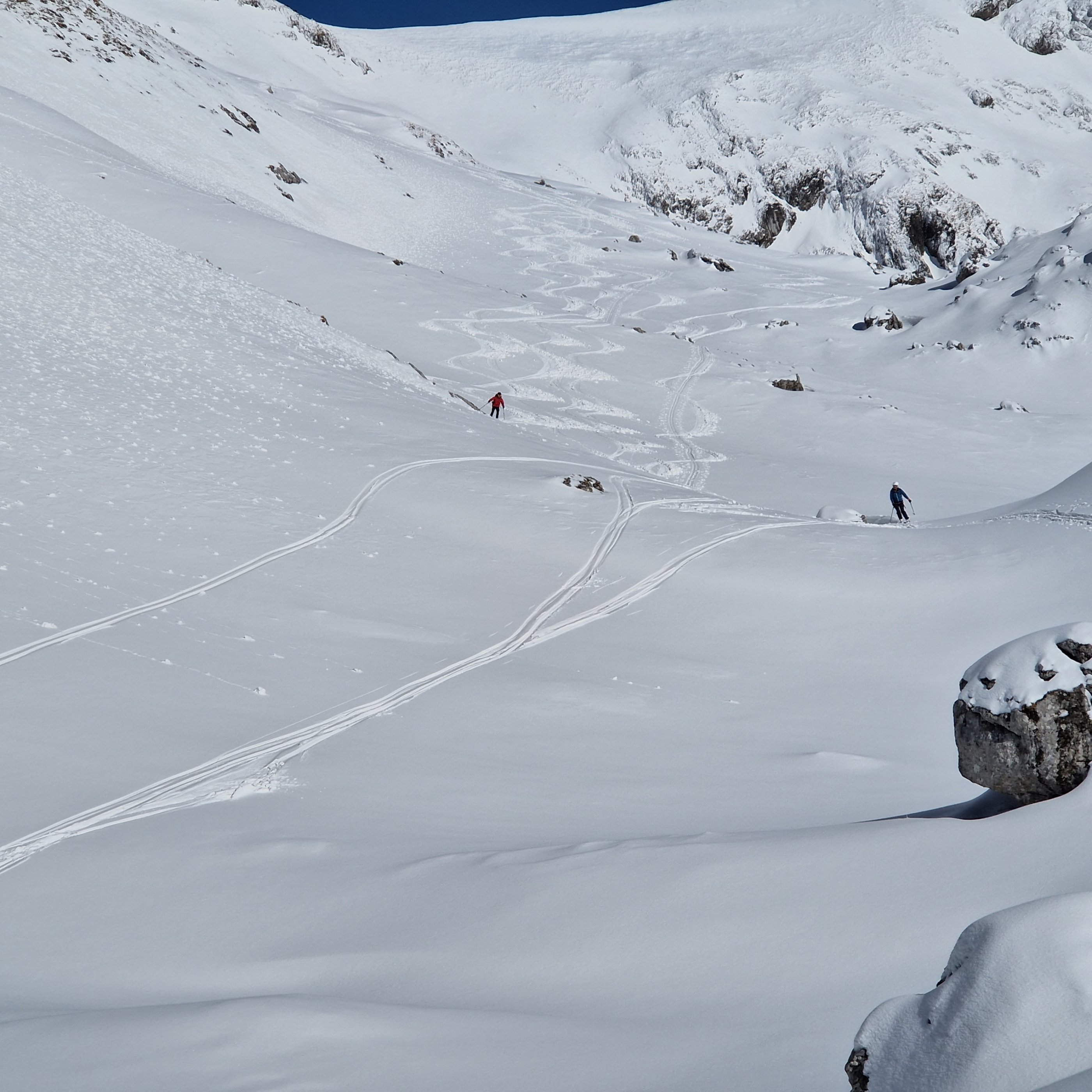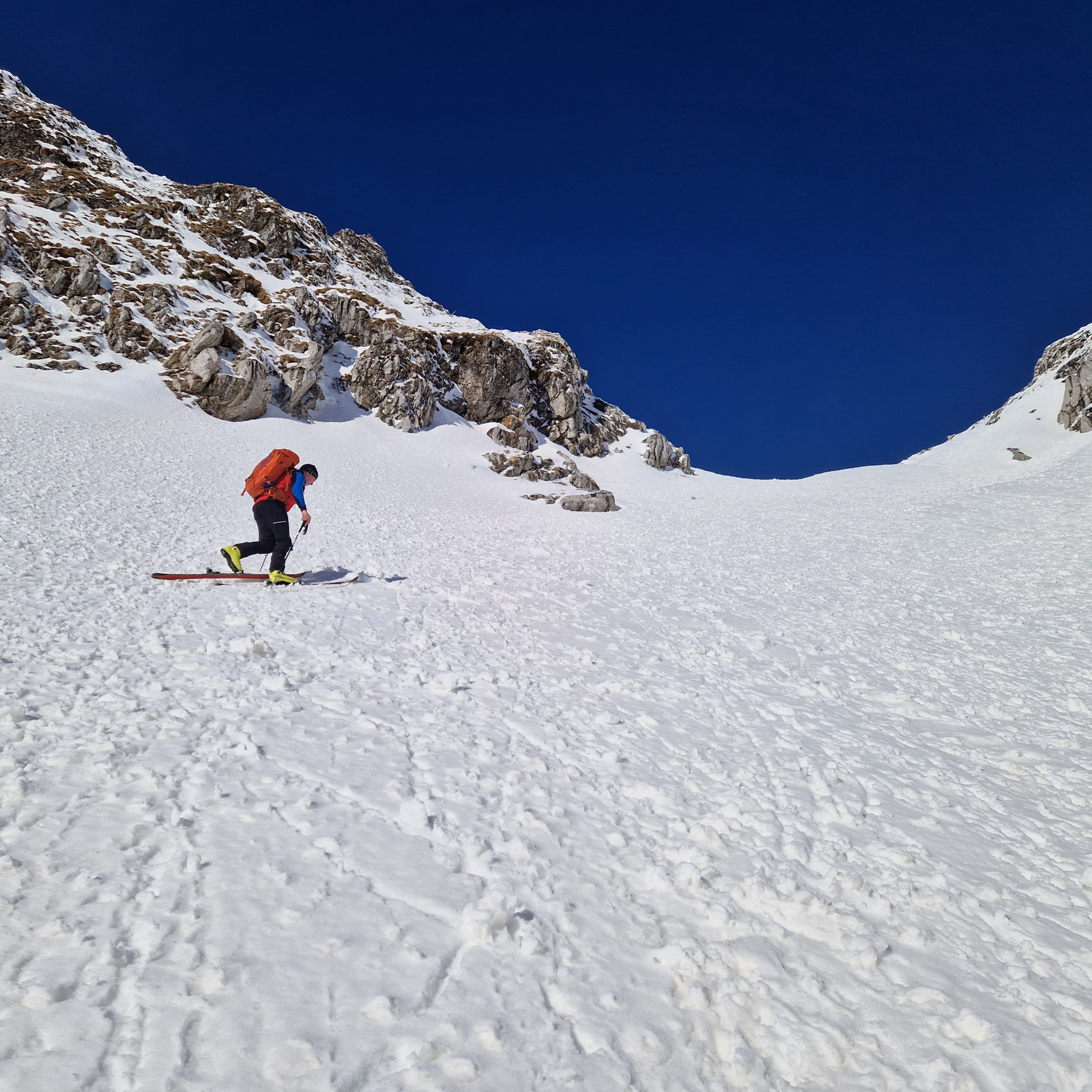 Die Tour geht gut, im Polsterkar ausreichend Schnee. Es war heute gut zum fahren, keinerlei Lawinen oder Anrisse gesehen. Die Russenstrasse ist bis zum Brunnen auch schön zu fahren. Lohnend! Sonnschienhütte von Donnerstag bis Sonntag offen.