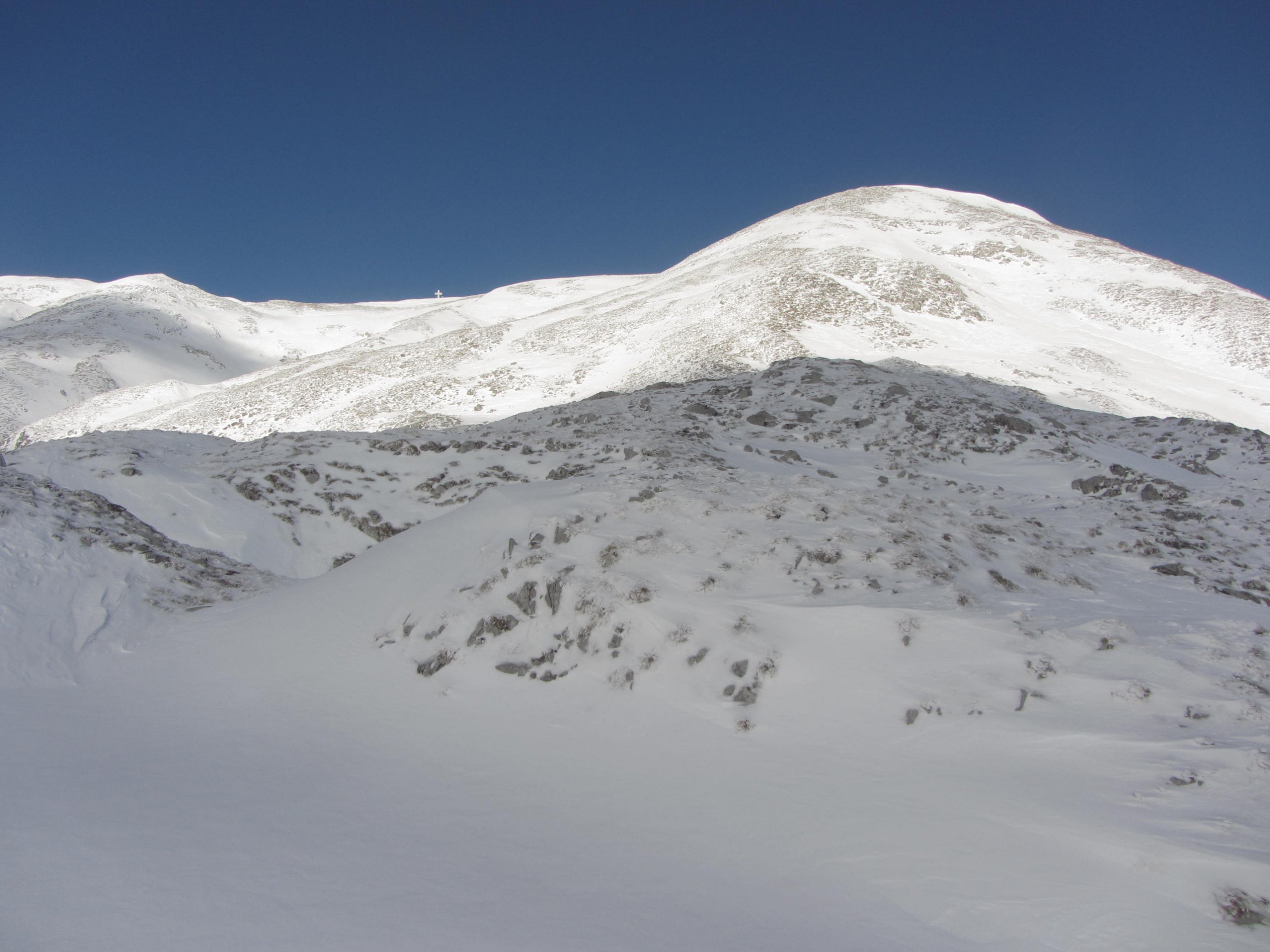 Nordseitiger Gipfelaufbau mit Vorsicht zu genießen, steilere Varianten verbieten sich, Entlastungsabstände einhalten!! Südseitig gesetzte Schneedecke mit dünner Pulverauflage, erst weit unten feucht.