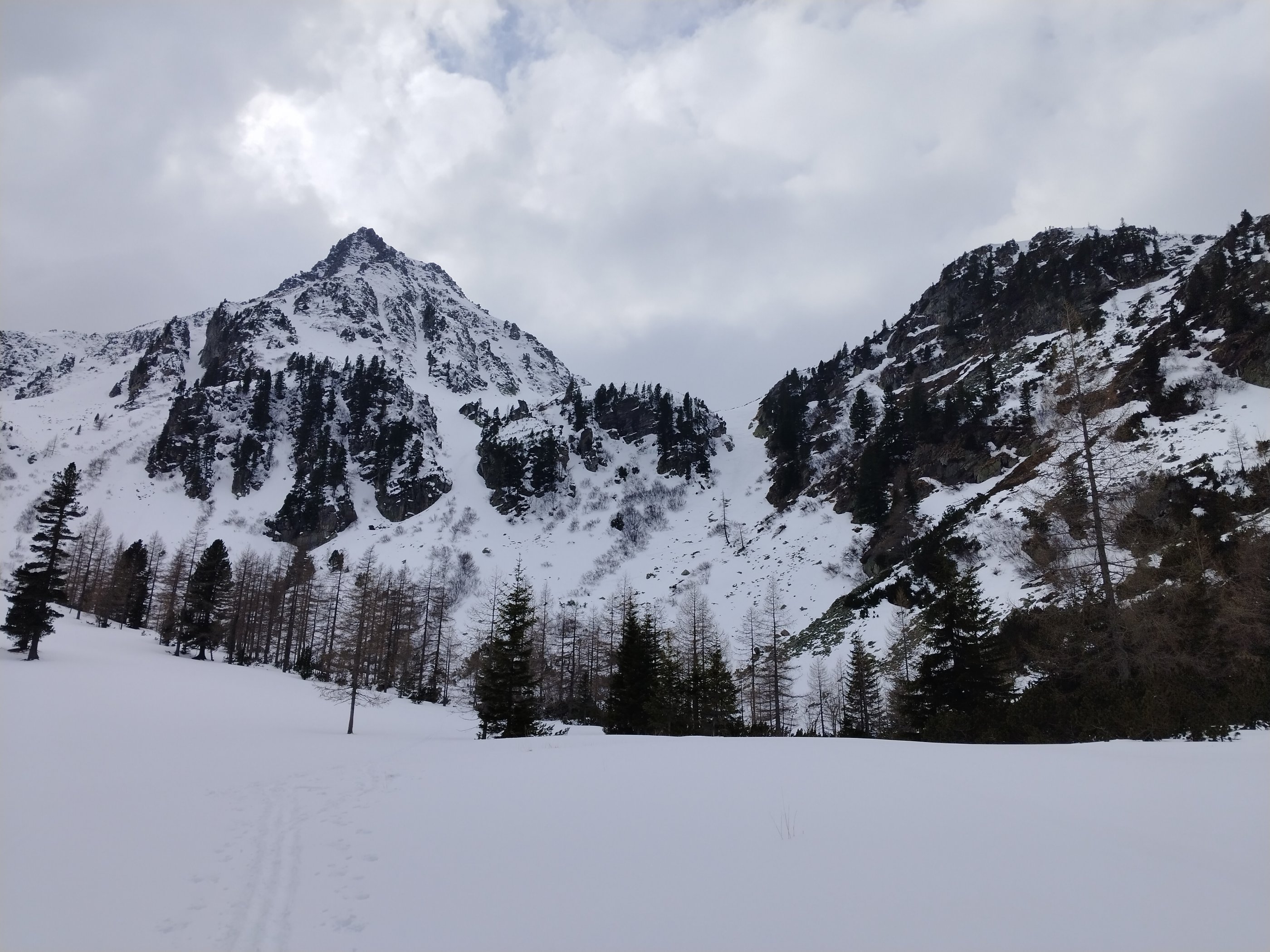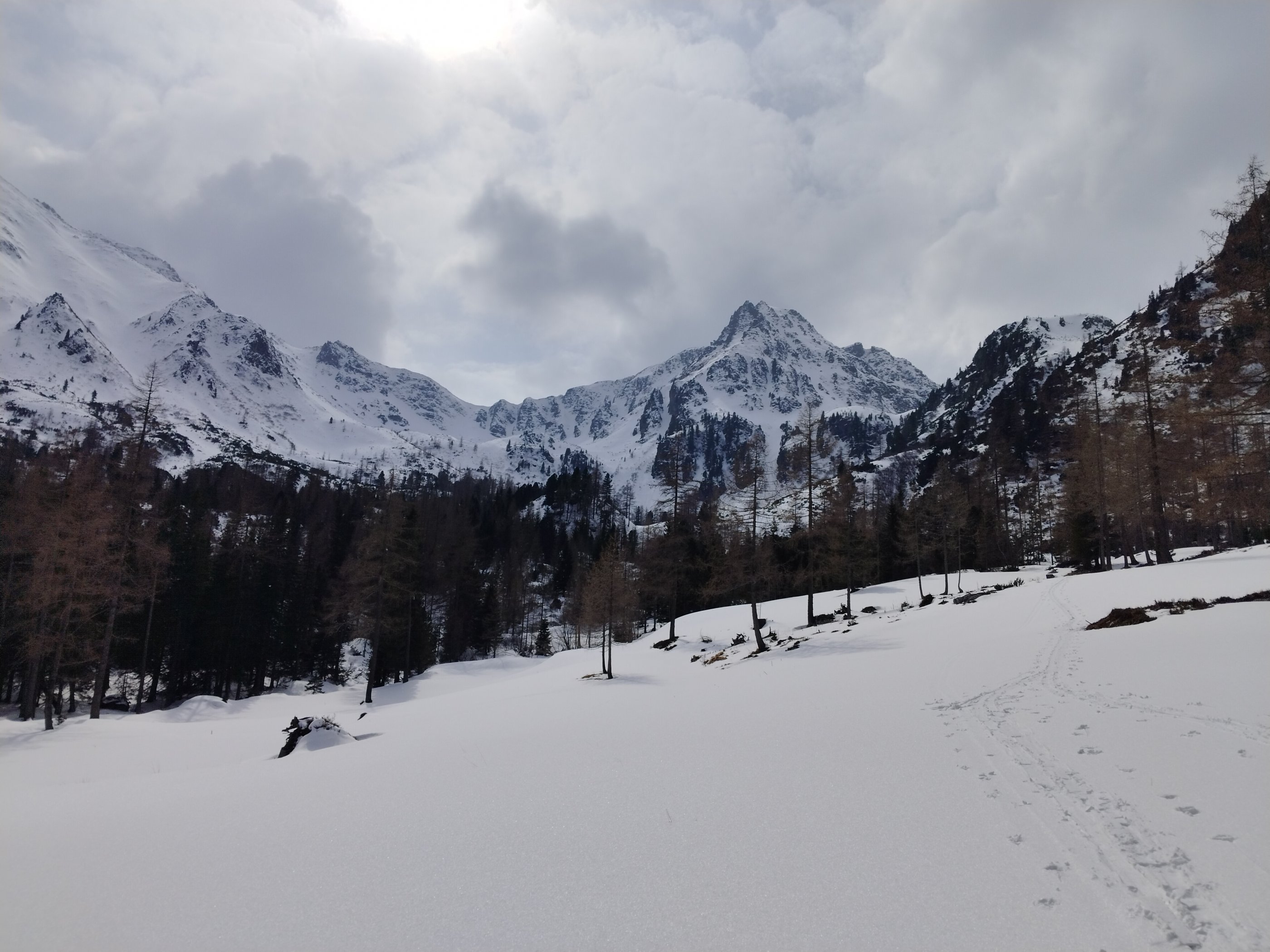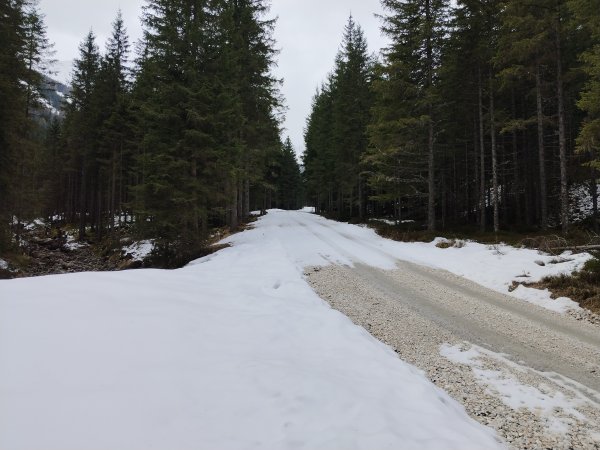 Es ist noch sehr winterlich, weit unter den Kallbrunnalmen sind die Forststraßen ungeräumt und noch schneebedeckt.
