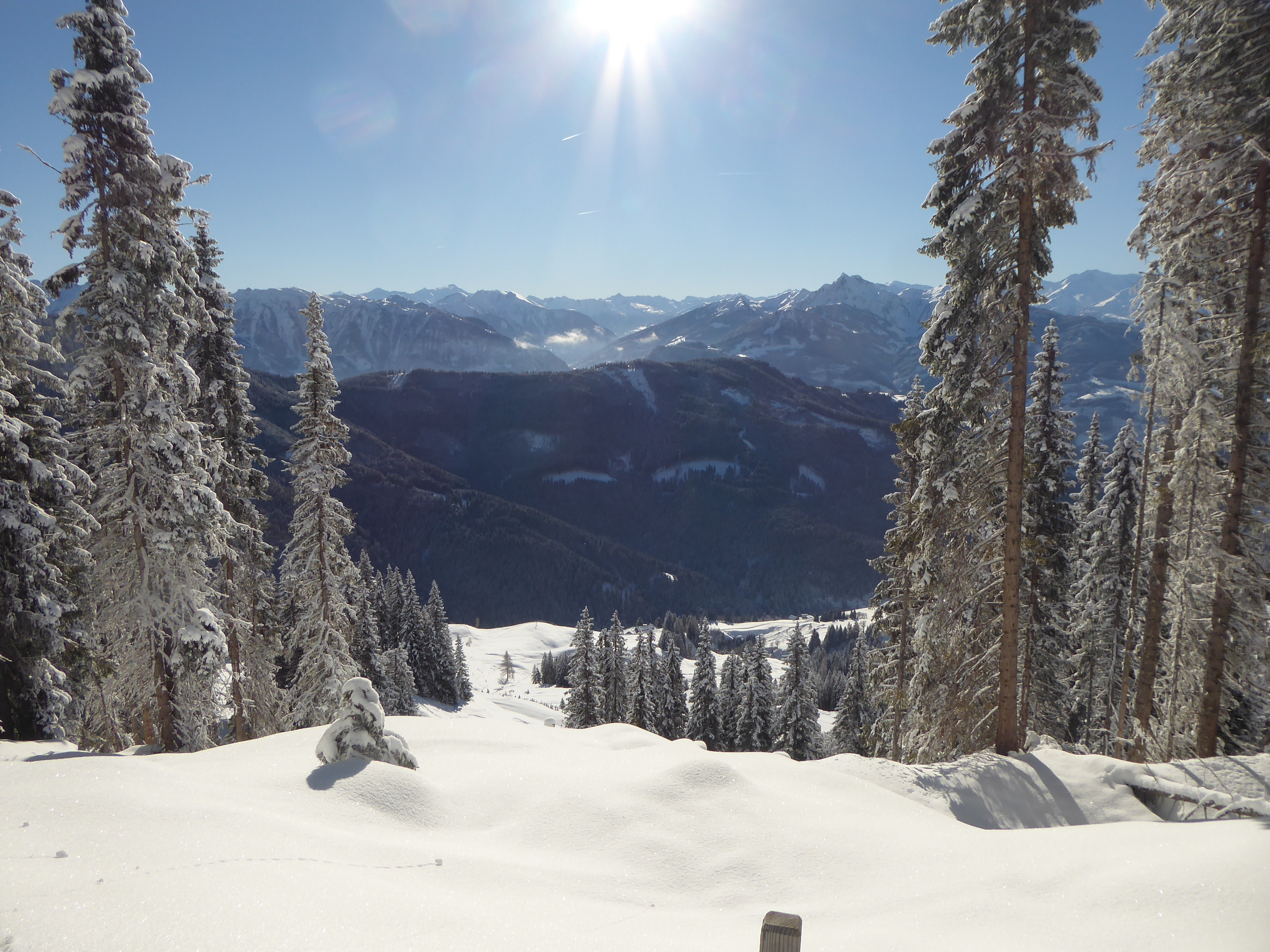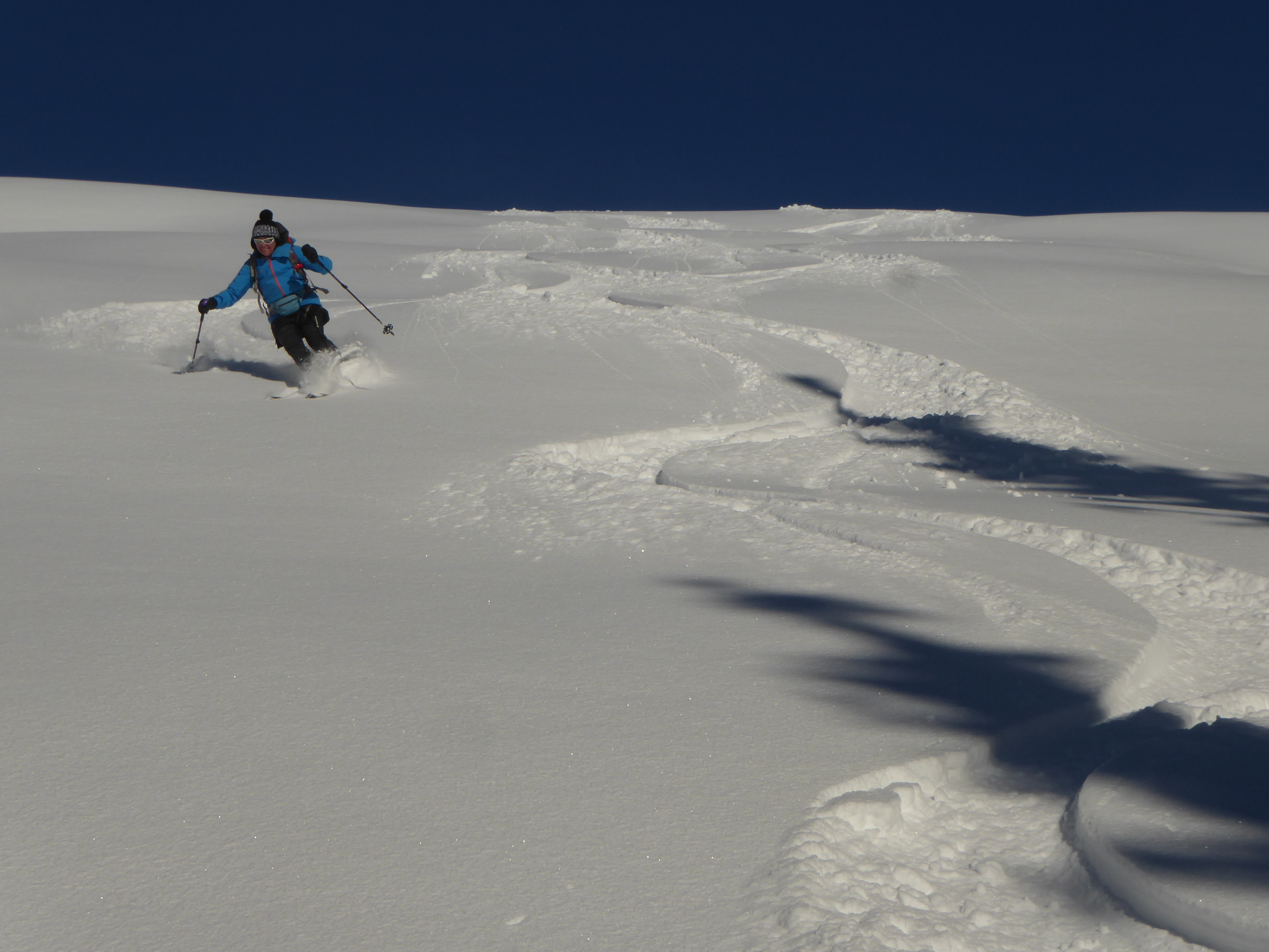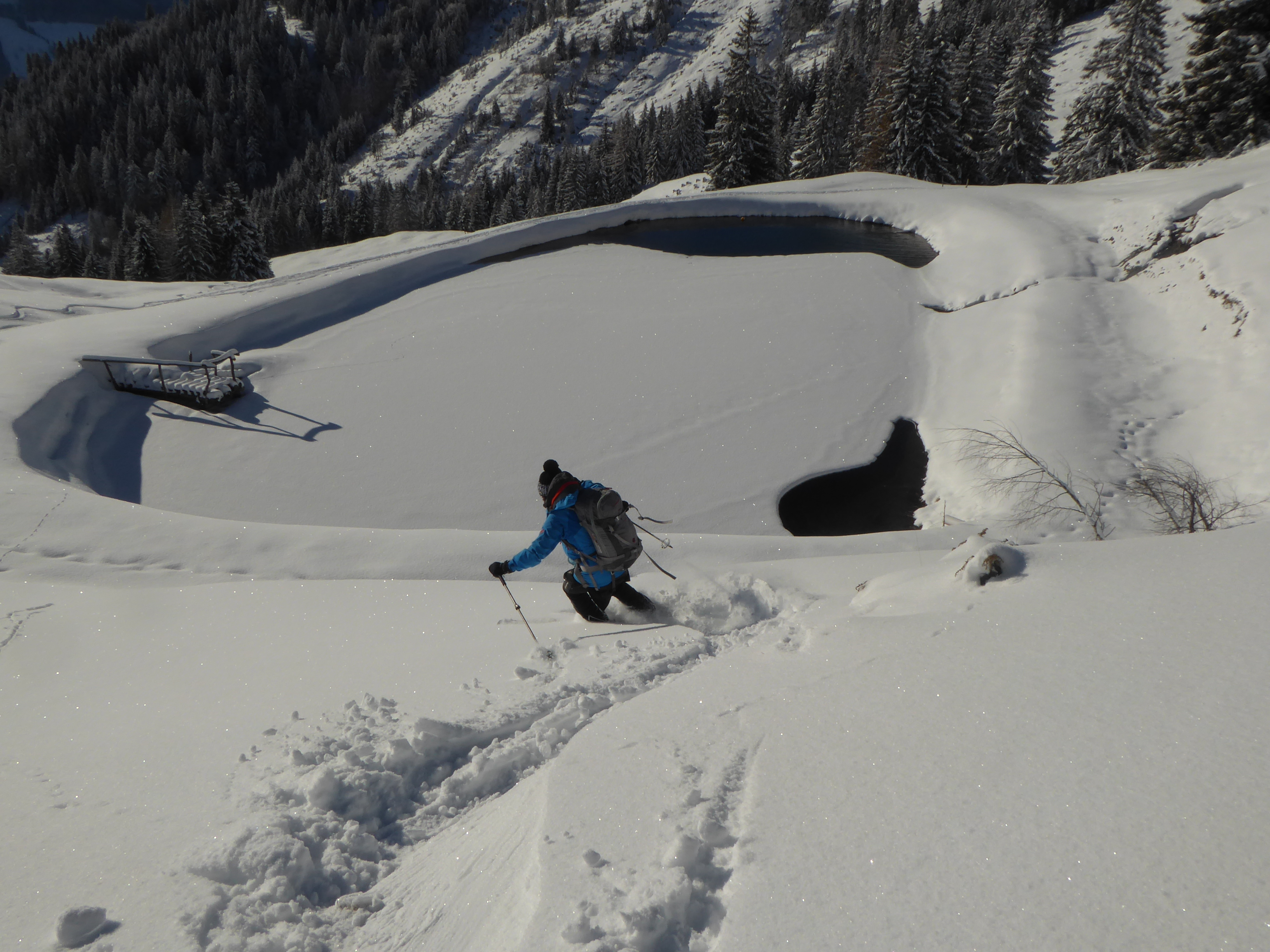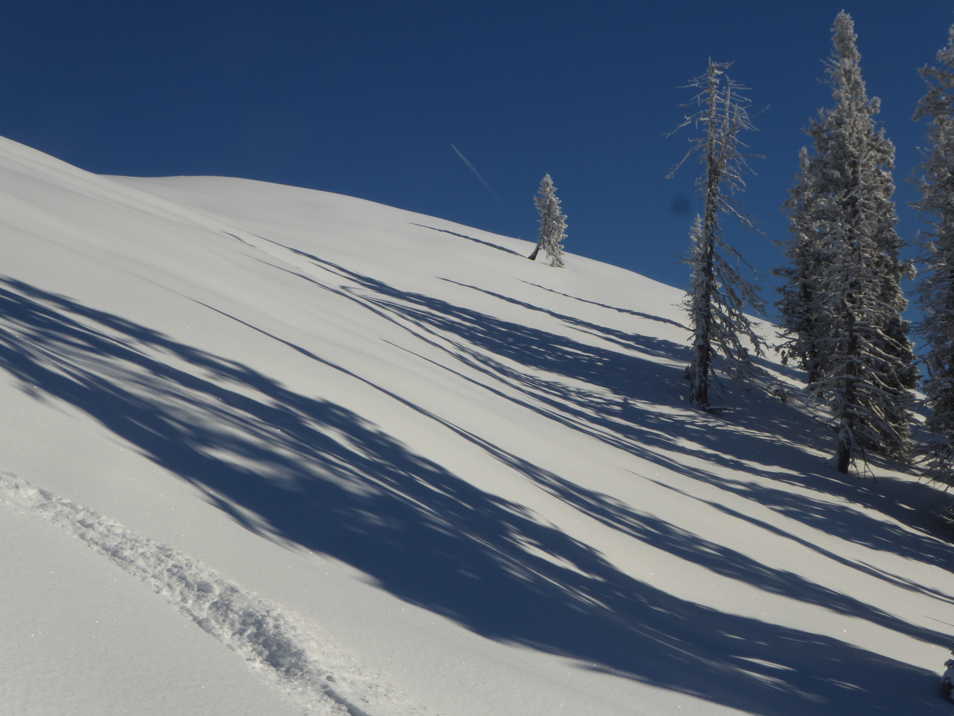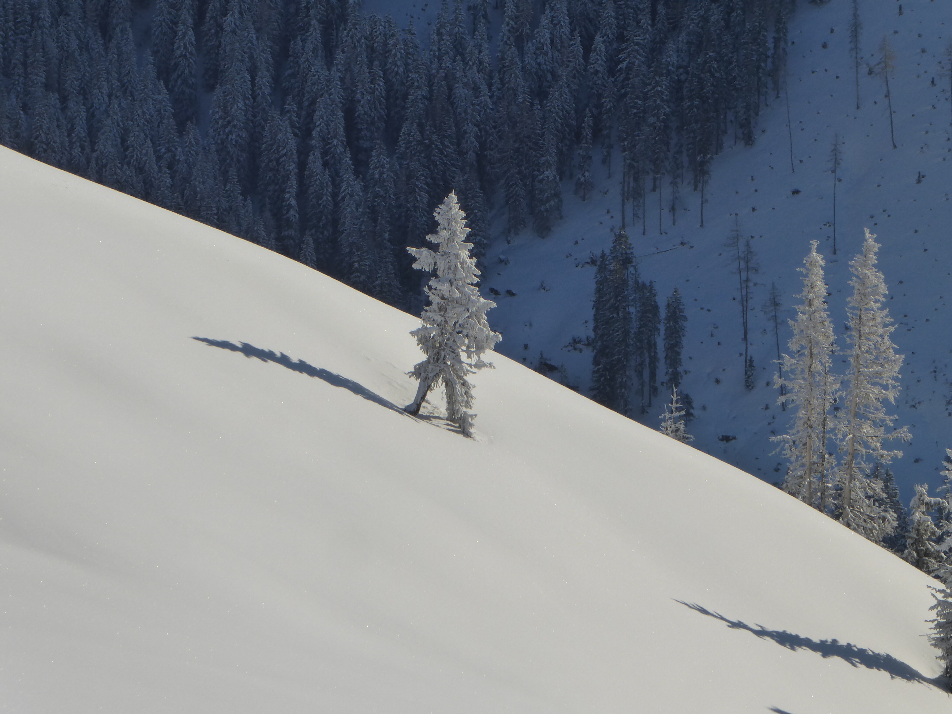 Nach schattigem Kaltstart bei -8° nach wenigen Minuten in der Sonne und die blieb uns dann für den Rest des Tages. Ein Prachttag!! Schnee: Die unterste Wiese nach dem Parkplatz beim Gh.Ottino muss vorgestern schon aper gewesen sein, da liegt also nur der jüngste Neuschnee (20cm). Zum Grasrutschen bei der Abfahrt reichts aber. Nach 100Hm wirds gleich besser, da bildet der Nassschnee der Warmperiode eine nun hartgefrorene, tragfähige Unterlage mit anfangs 20, zuletzt 30-40cm feinstem Pulver plus Rauhreif drauf. Trotz der intensiven Sonneneinstrahlung hat das auch bis zur Abfahrt mittags gehalten. Morgen wäre dieser Schnee wahrscheinlich schon angestochen, aber die Wetterkarten werden morgen ohnehin neu gemischt.
