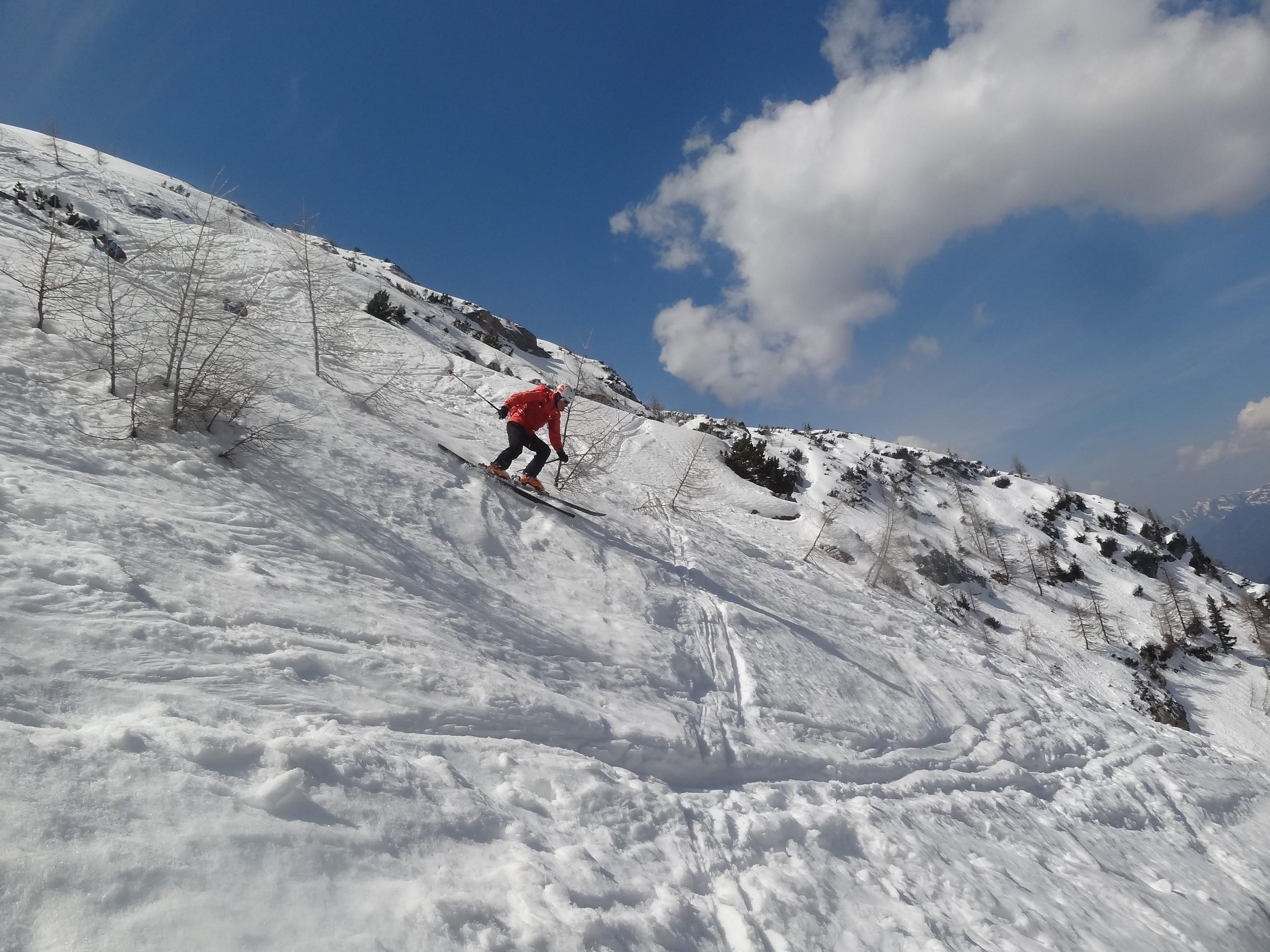 Bei der Abfahrt war der Gipfelhang noch hart, im Bereich des Karlkogels leicht firnig. Die steile Nordrinne zur Mittereisalm hatte es in sich: alte, gefrorene, tiefe Spuren und harte Knollen von alten Lockerschneerutschen aus den steilen Seitenhängen. Genußschifahren schaut anders aus.