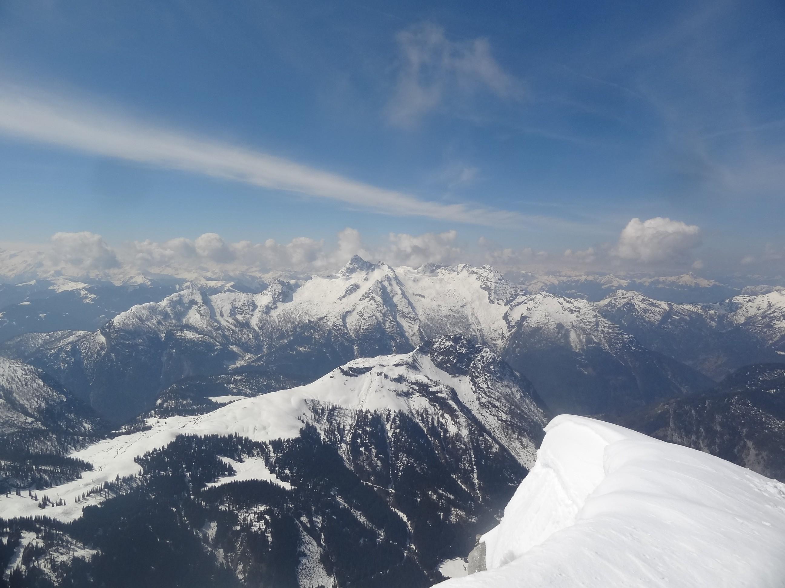 Die ersten zwei Aufstiegstunden waren heute wirklich abwechslungsreich: Abwechselnd Schi am Rucksack - kurz Schi an den Füßen - Schi auf der Schulter - Schi wieder am Rucksack - erst ab 1800 m wirklich an den Füßen. Ab da, den südseitigen Abbrüchen der Mooswand, über den Rücken zum Karlkogel und weiter bis zum Gipfel pickelhart. Harscheisen erforderlich! Am Gipfel selbst Sonnenschein, nur leichter Wind und gute Fernsicht. Nur im Süden, an den Tauern, türmten sich zu Mittag die ersten Haufenwolken.