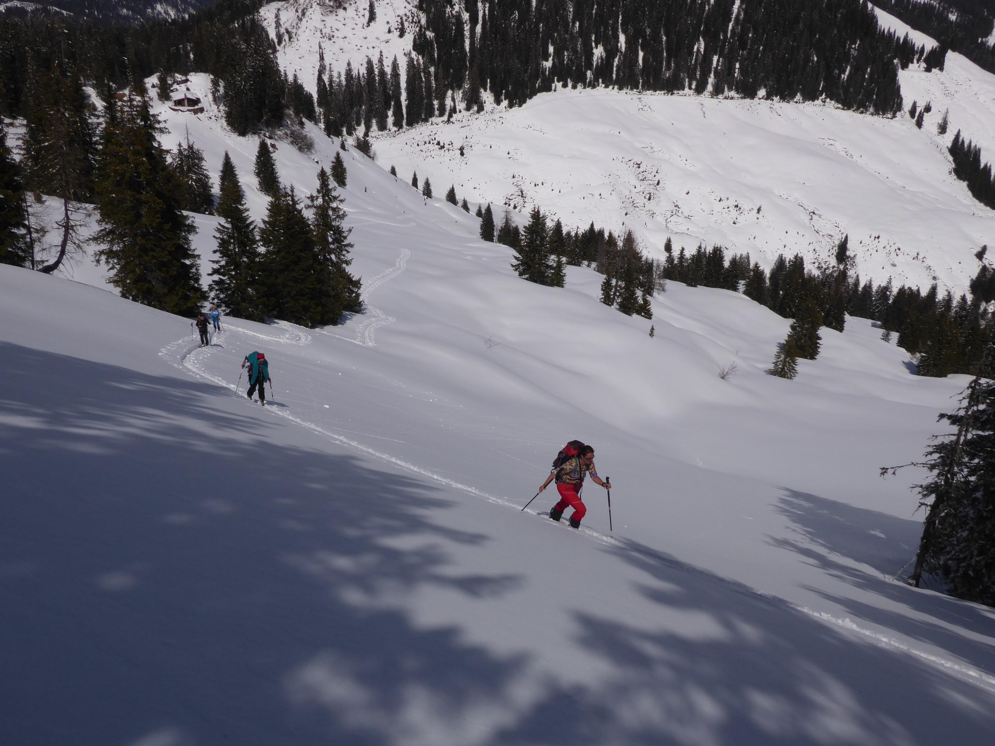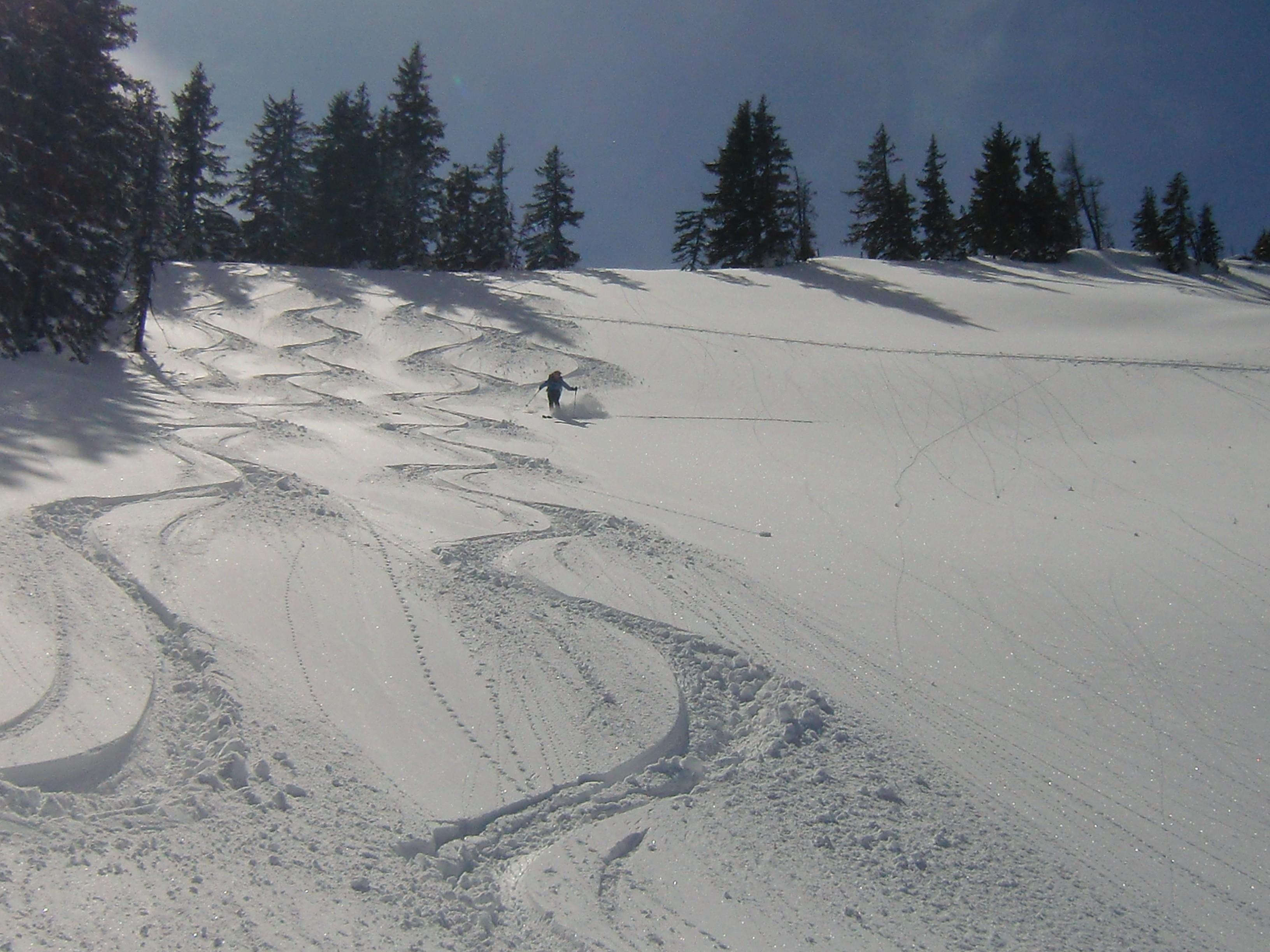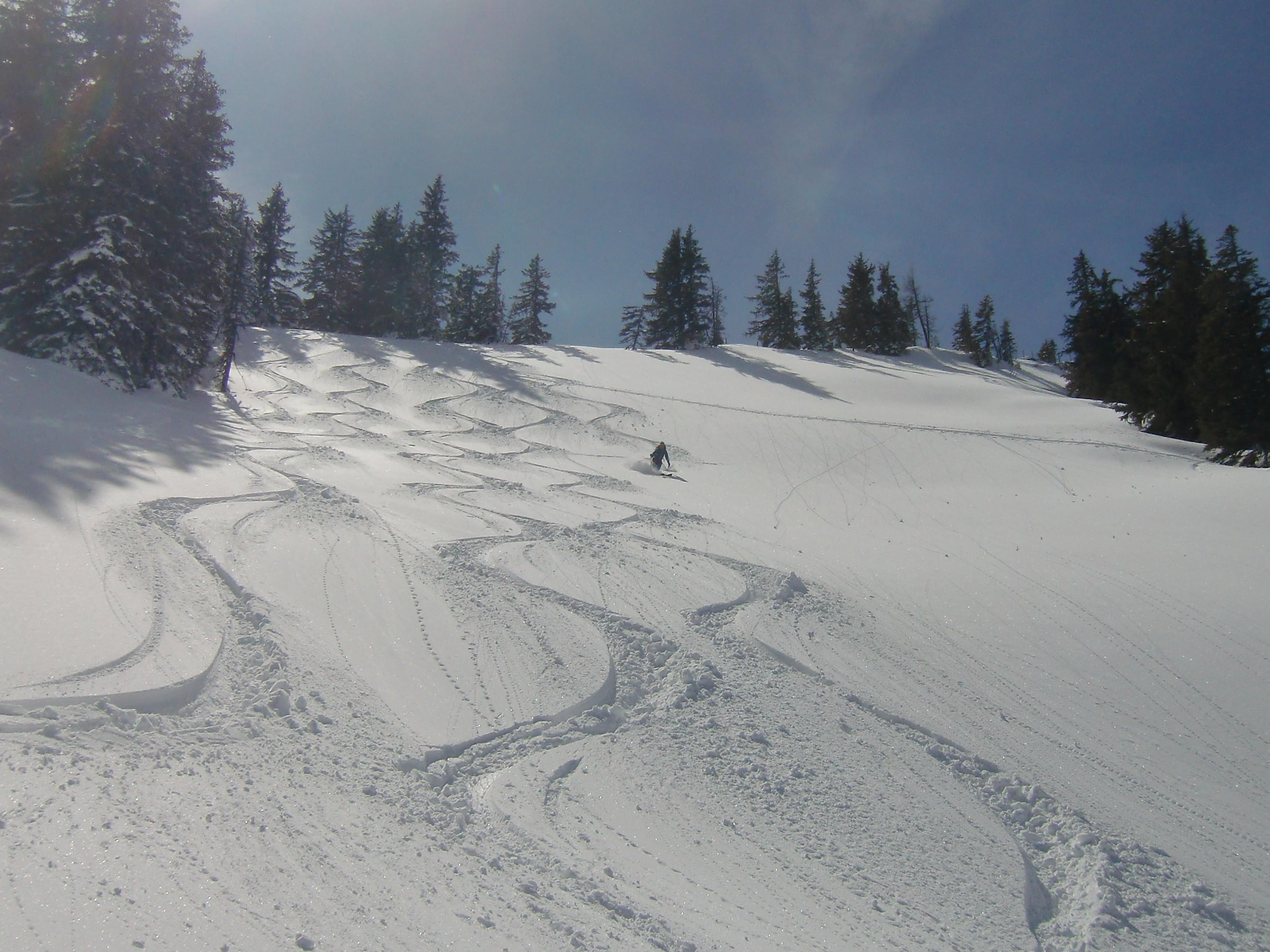 Schnee: Bereits vorgewarnt von Utas gestrigem Marbach-Bericht hatten wir uns keiner Illusion hingegeben. Am doch recht sonnenexponierten Grinnberg war der Schnee dann auch schon feucht-schwer und wirklich nicht einfach zu fahren, deshalb Abbruch der Abfahrt auf halber Strecke und Querung hinüber zur Lettenalm und zum Grünköpfl. Schnee dort um Häuser besser, oben am NE-Hang noch sehr schön pulvrig, obendrein unverspurt, nach unten zu stetig schwerer und feuchter werdend, aber trotzdem kein Vergleich zum Beton am Grinnberg.
