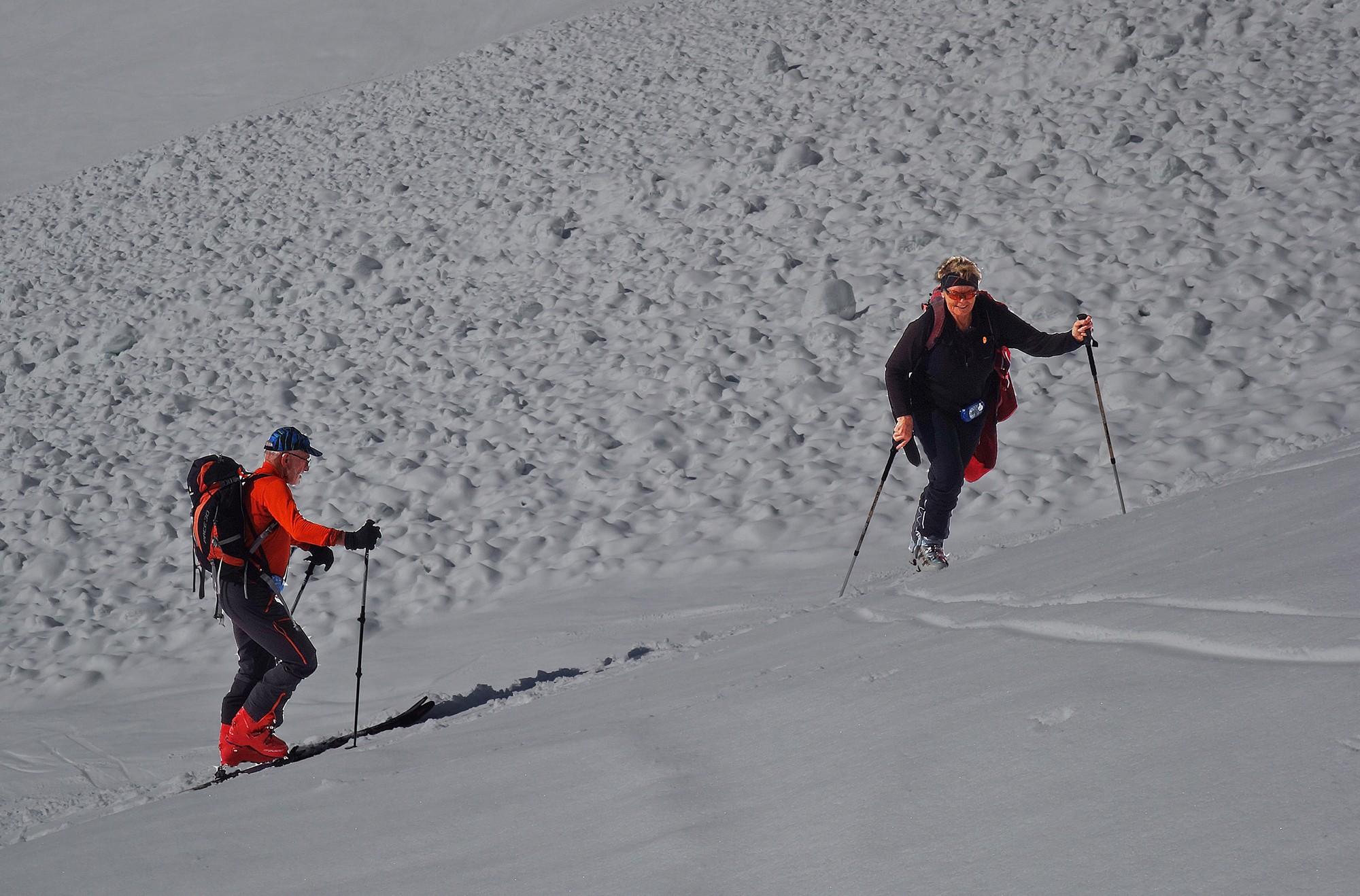 Wieder ins Birgkar, schon bei der Anreise die Sicht ins Kar möglich, ja, alles voller Lawinenschnee, im April, südseitig und bei Wärme rechnet man mit Nassschnee, diesmal nicht, der ganze Haufen brettartig angebrochen und das aus mehreren Richtungen. Die Lawine hart gefroren und mit etwas Neuschnee zugedeckt. Für die Abfahrt findet man dann doch wieder schöne Möglichkeiten.