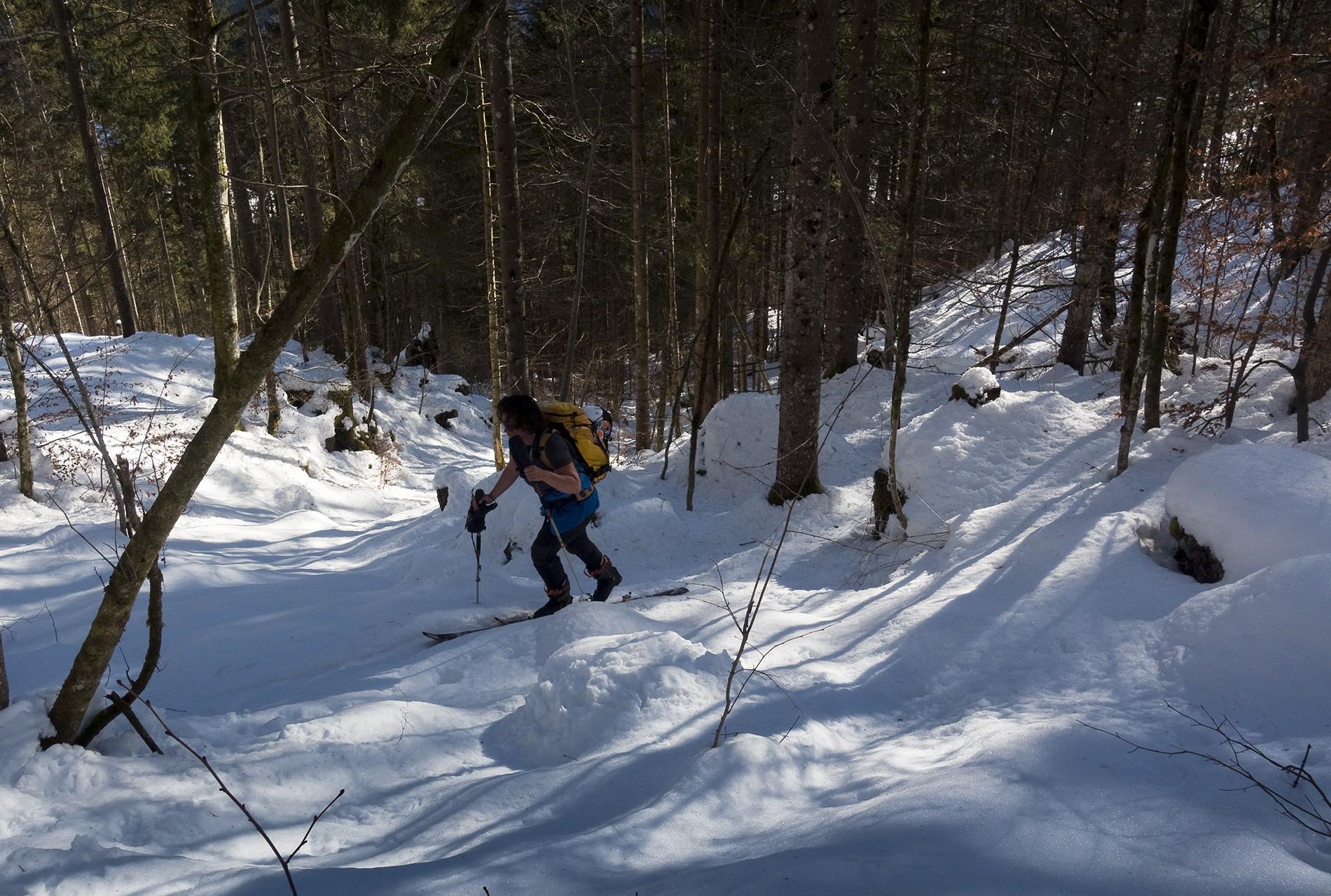 In der Waldstufe liegt überraschend viel Schnee, der weiter oben im Ebersbergkar stellenweise windbehandelt ist, aber dennoch sehr gut fahrbar!