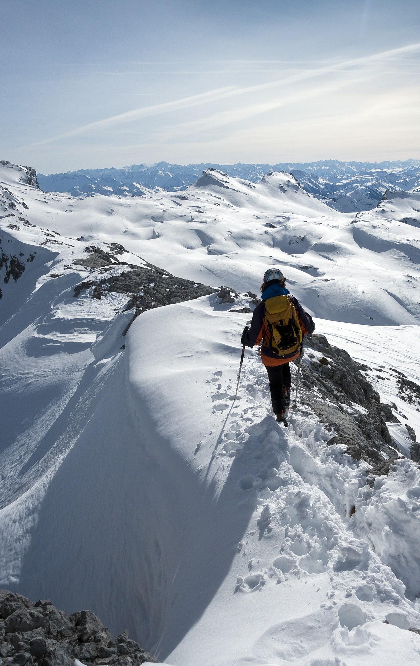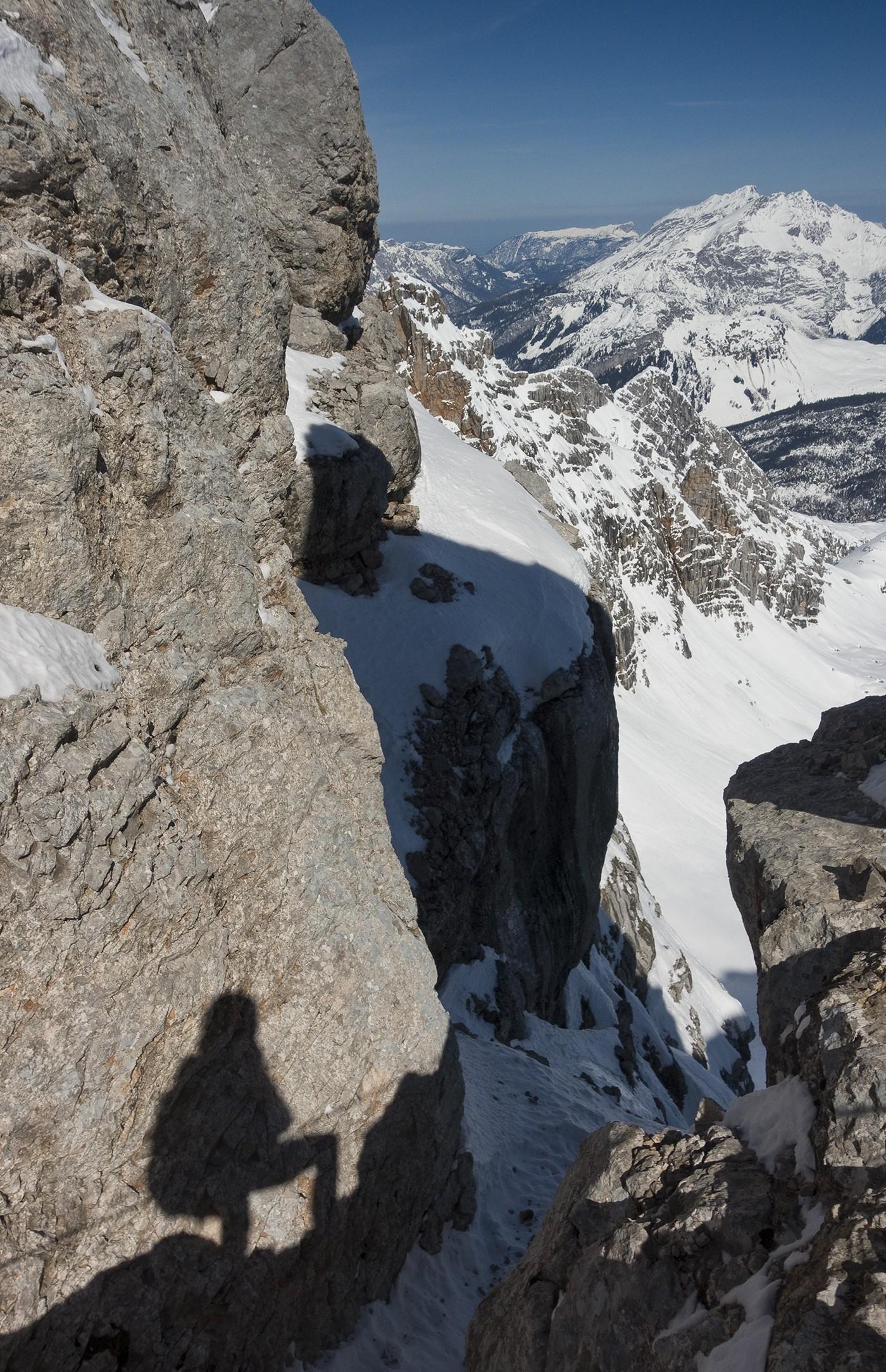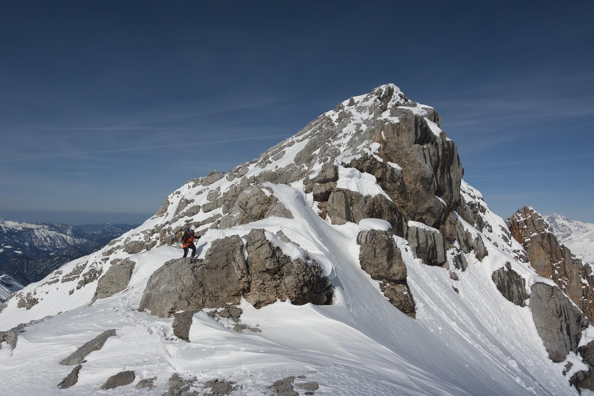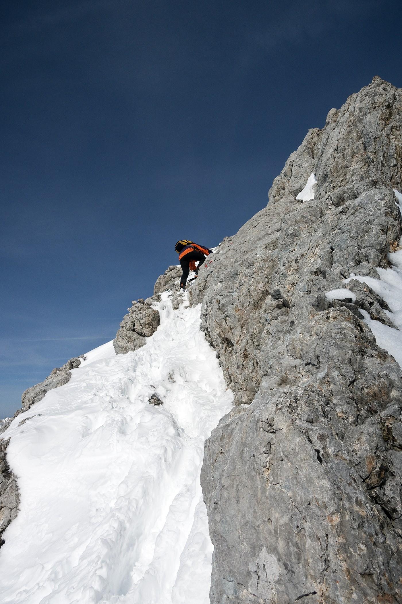 Zum Birnhorngipfel braucht man keine Steigeisen, etwas heikel sind allerdings manchmal die Querungen im tiefen Schnee, weil der abgleiten könnte, wenn er nass wird, und weil die meisten Drahtseile eingeweht sind.