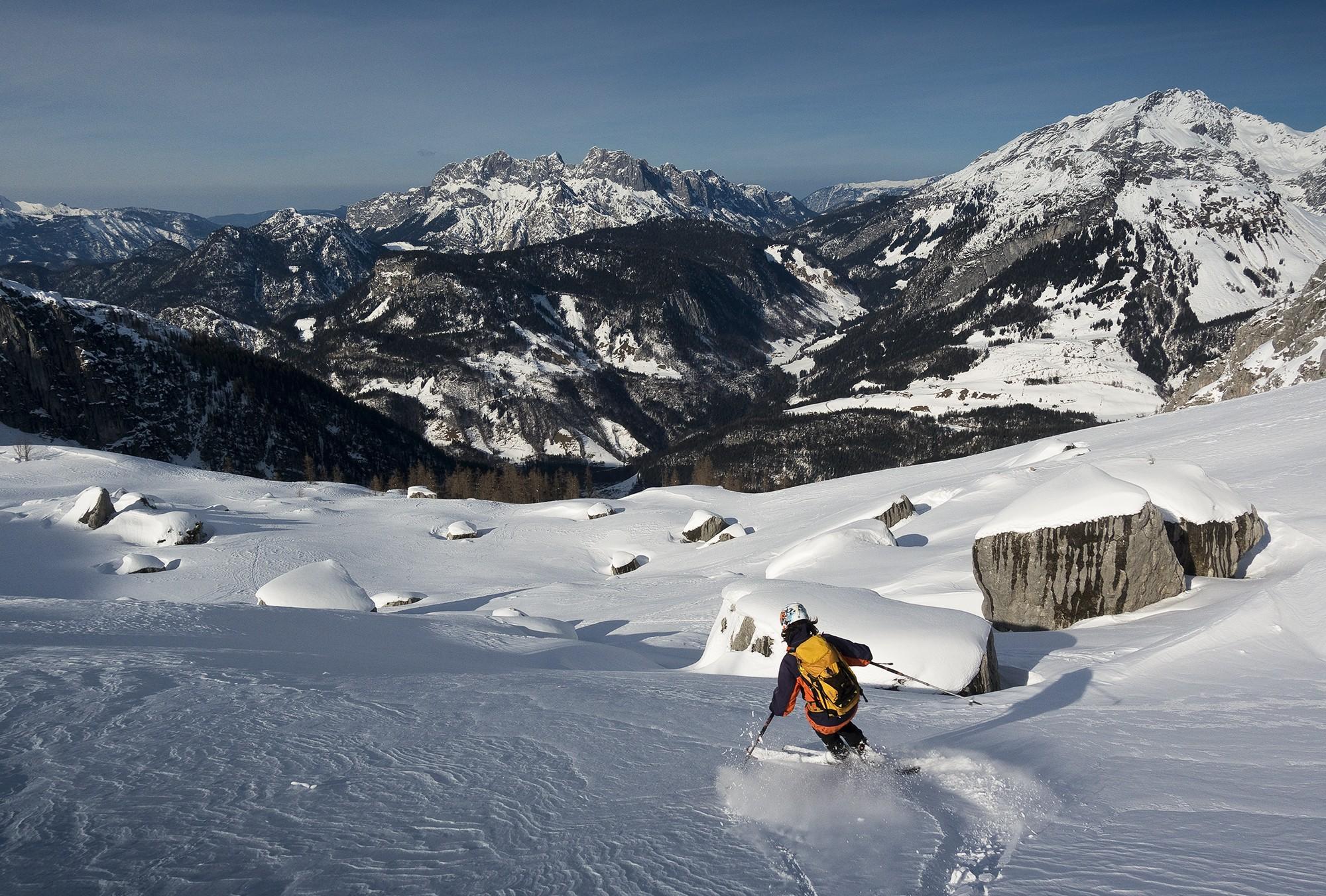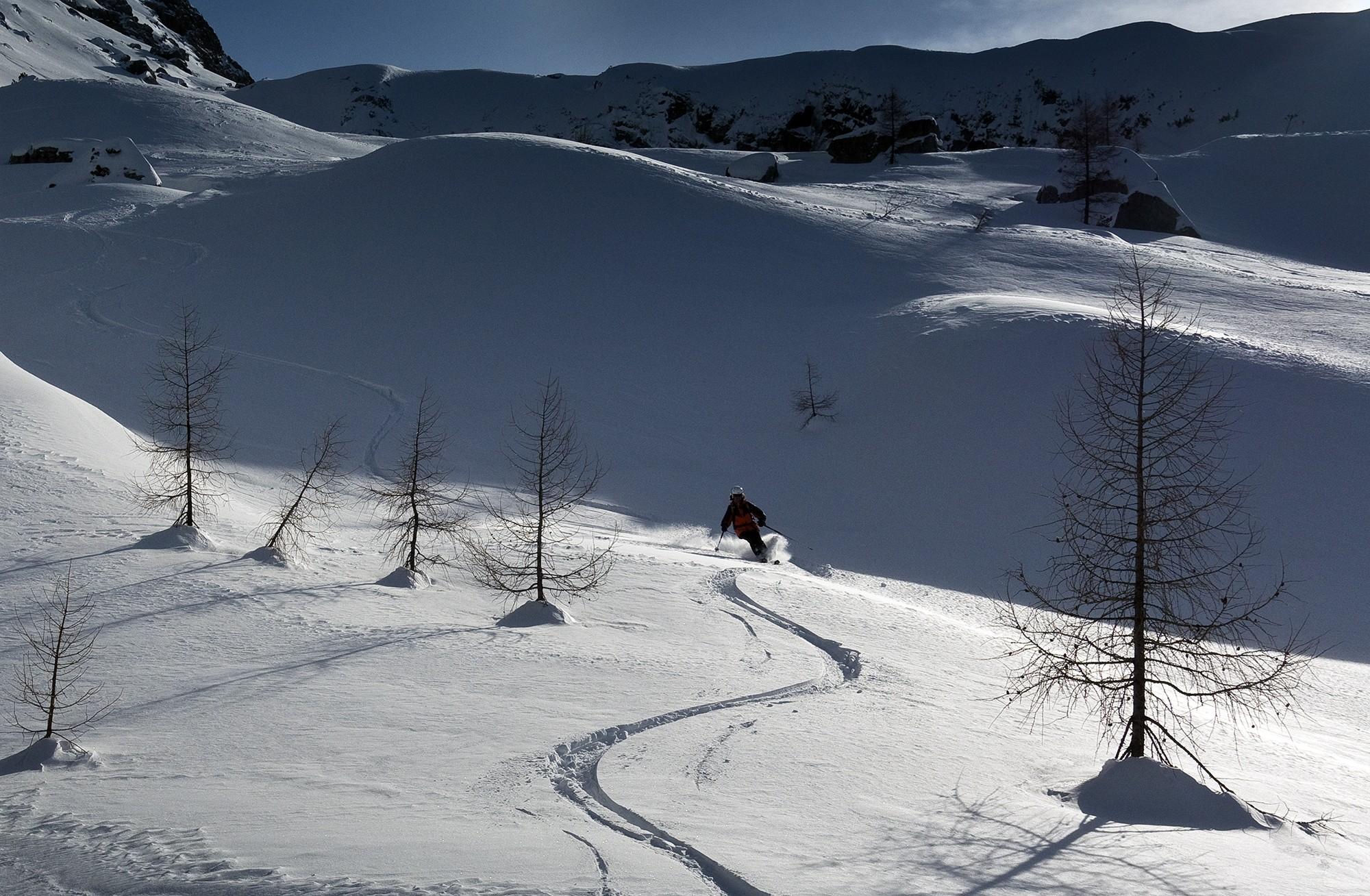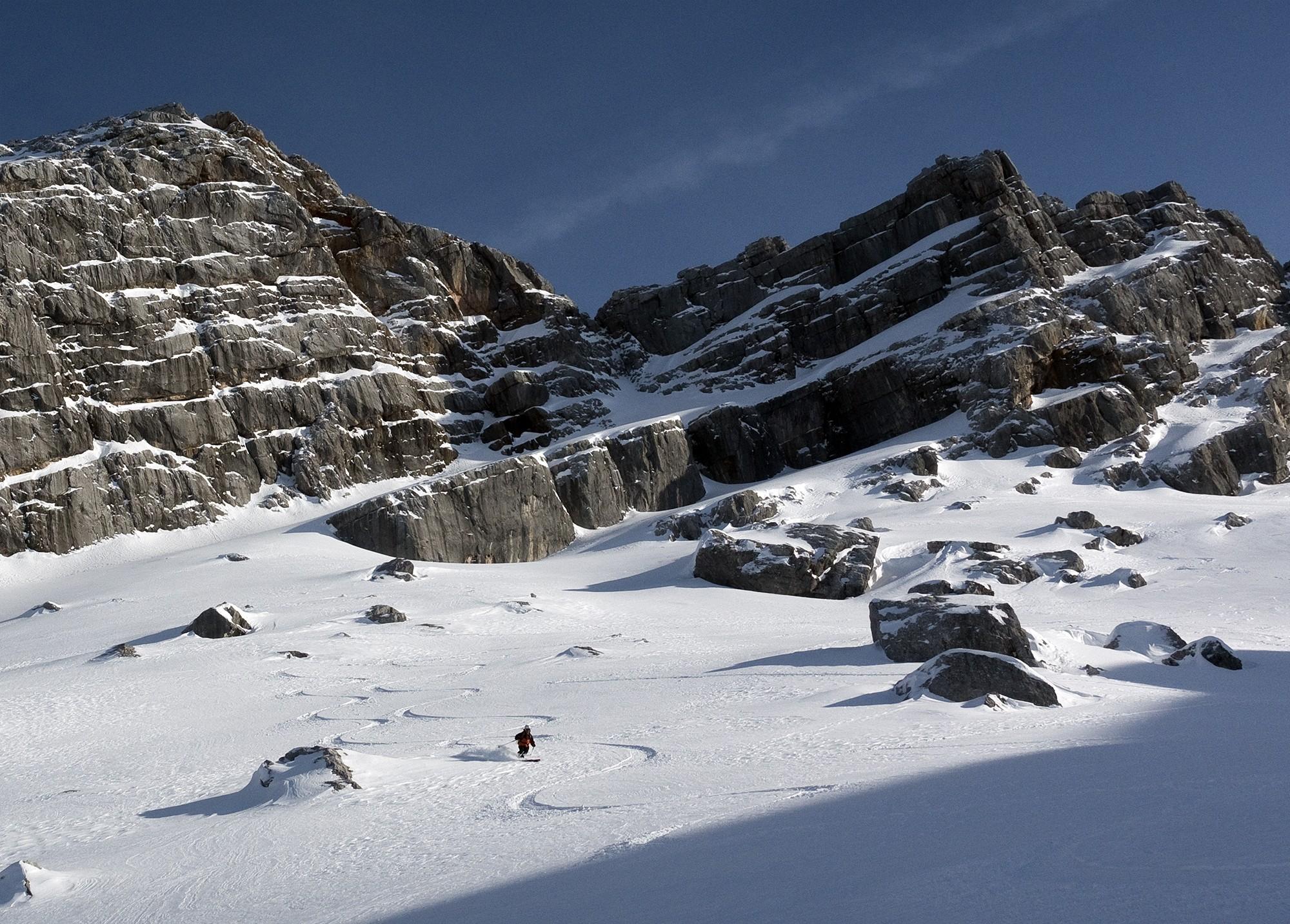 Die Abfahrt ist durchwegs gut, was man am Birnhorn nur selten sagen kann. Oben Pulver, weiter unten dann feucht. Die Waldstufe lässt sich durchrollen: Wie eine Kugel in der Kugelbahn saust man durch die Anliegerkehren des Weges, ein Riesenspaß. Helmpflicht!!