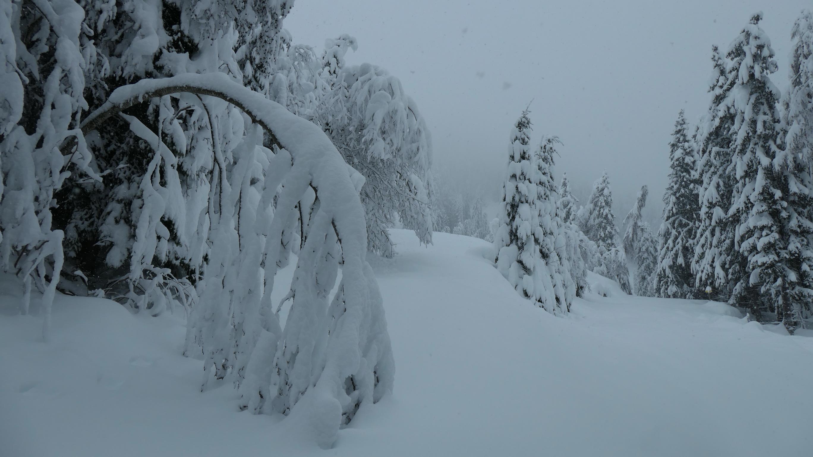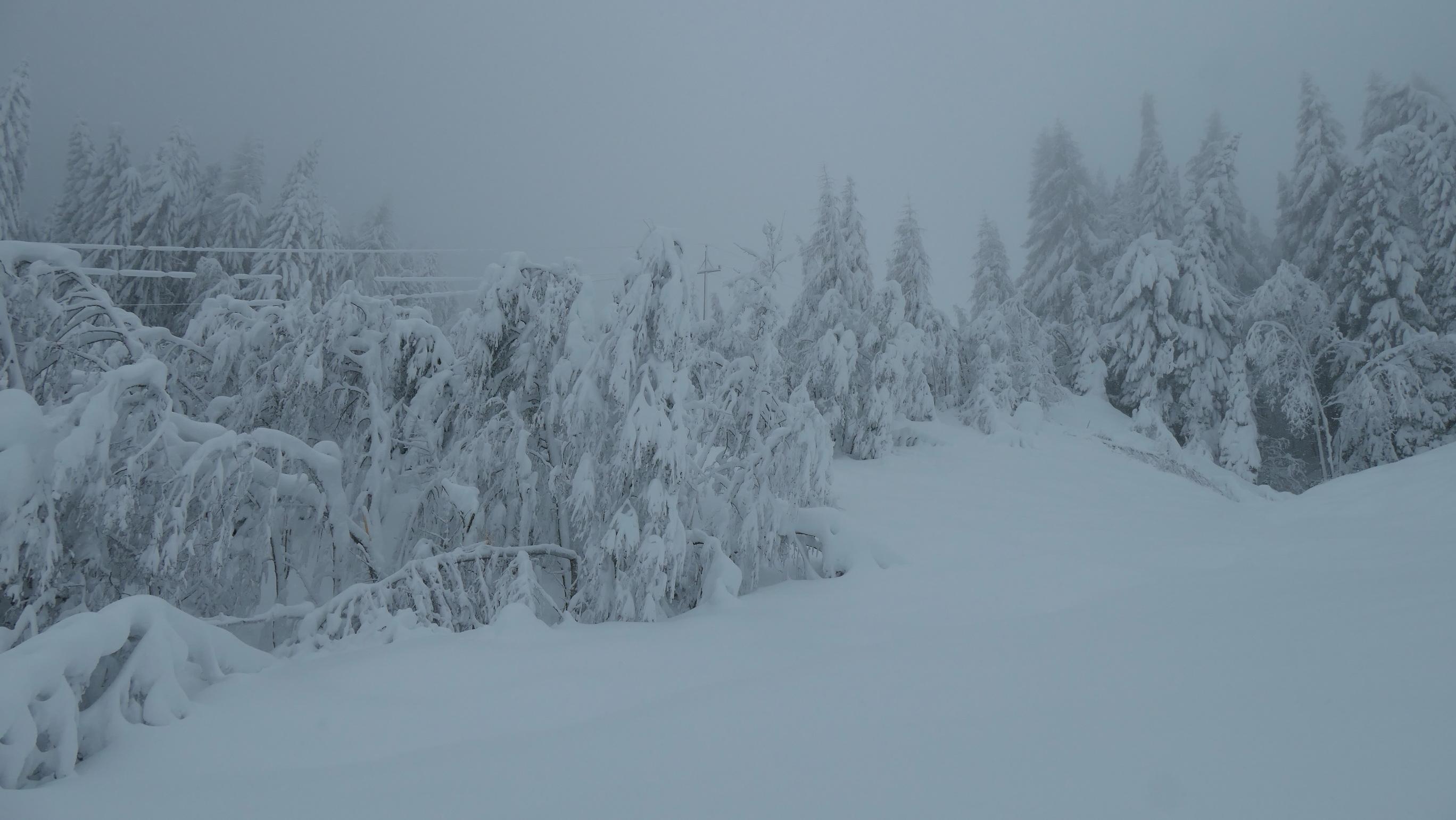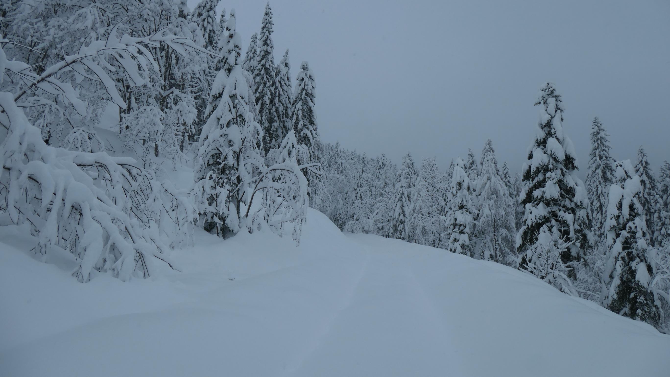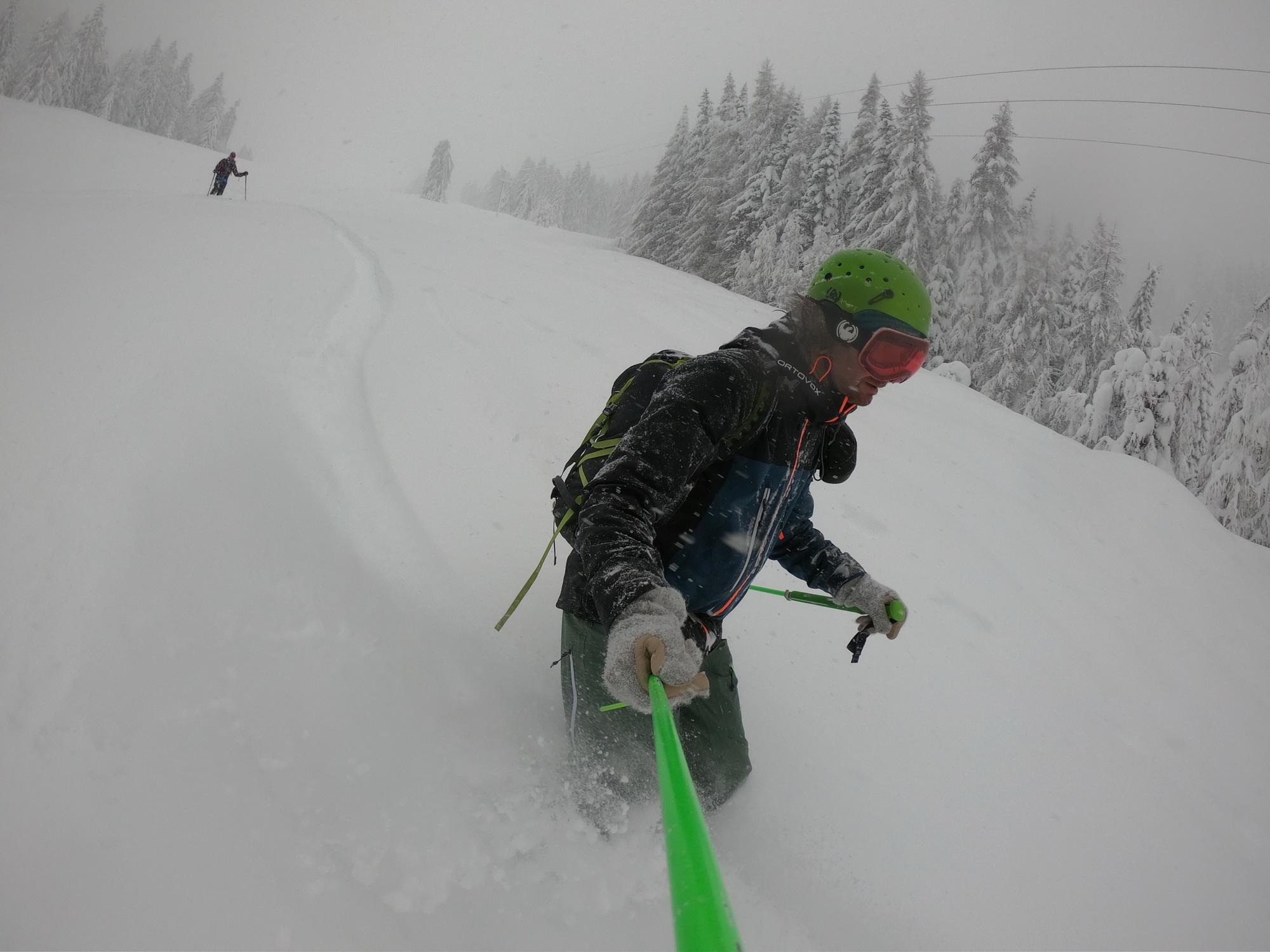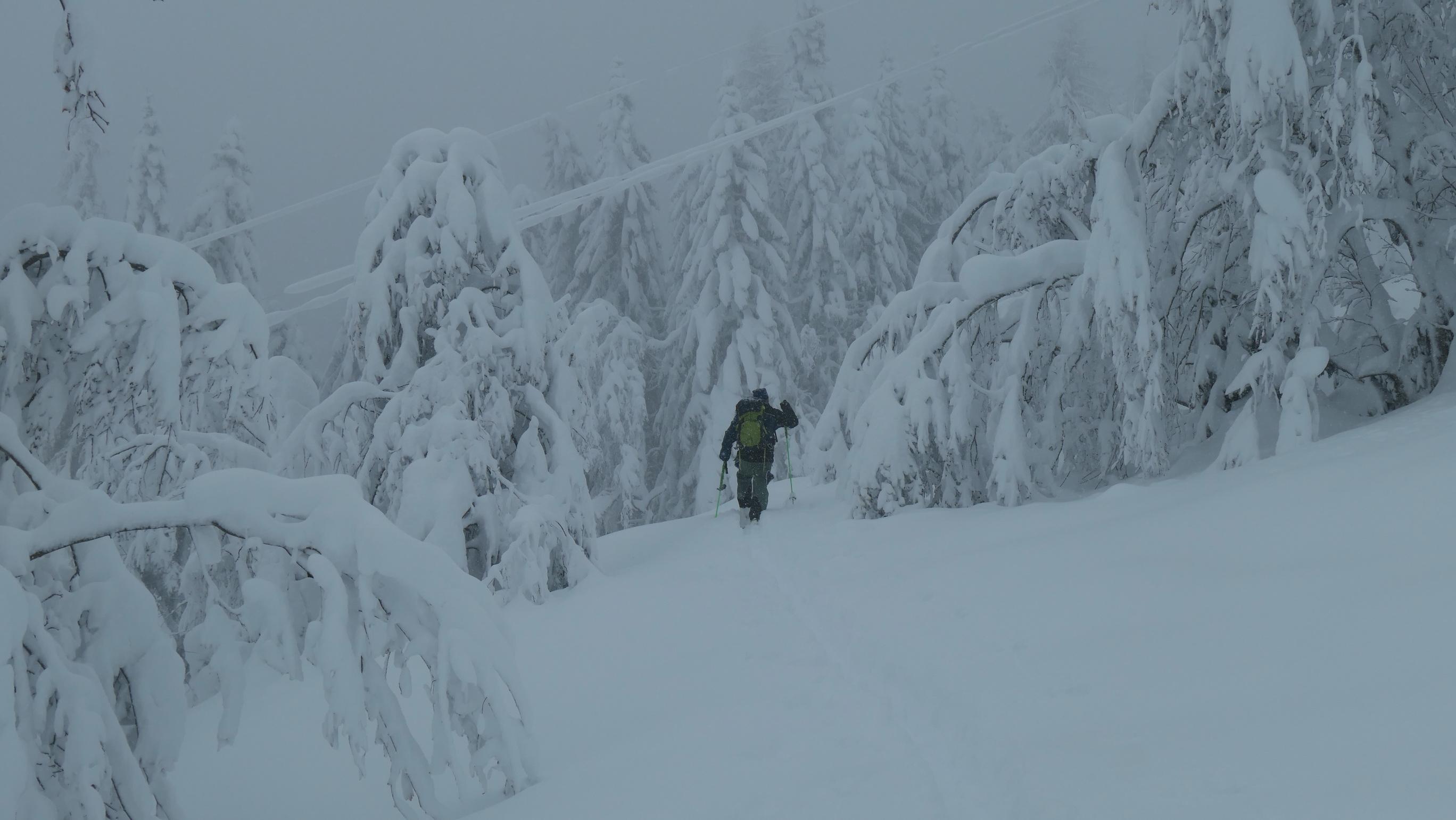Im unteren Teil bis ca. 1000m ist die Schneedecke ziemlich durchfeuchtet was mit zunehmender Seehöhe stetig abnimmt. Überhalb von 1200m wurde es dann richtig pulvrig. Die Wahl dieses Aufstieges halte ich lawinentechnisch für relativ sicher. Wir konnten keine Anzeichen von Lawinenaktivitäten erkennen. Allerdings sollte man speziell im oberen Teil einen Augenmerk auf die Bäume und die Stromleitung machen. Unterhalb von 1000m sind die Bäume in der Zwischenzeit wieder schneefrei. Derzeit sicher eine nicht zu unterschätzende Gefahr.