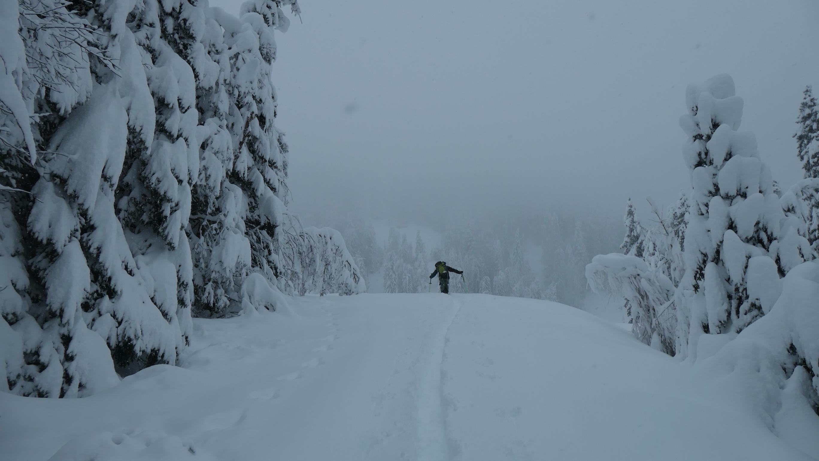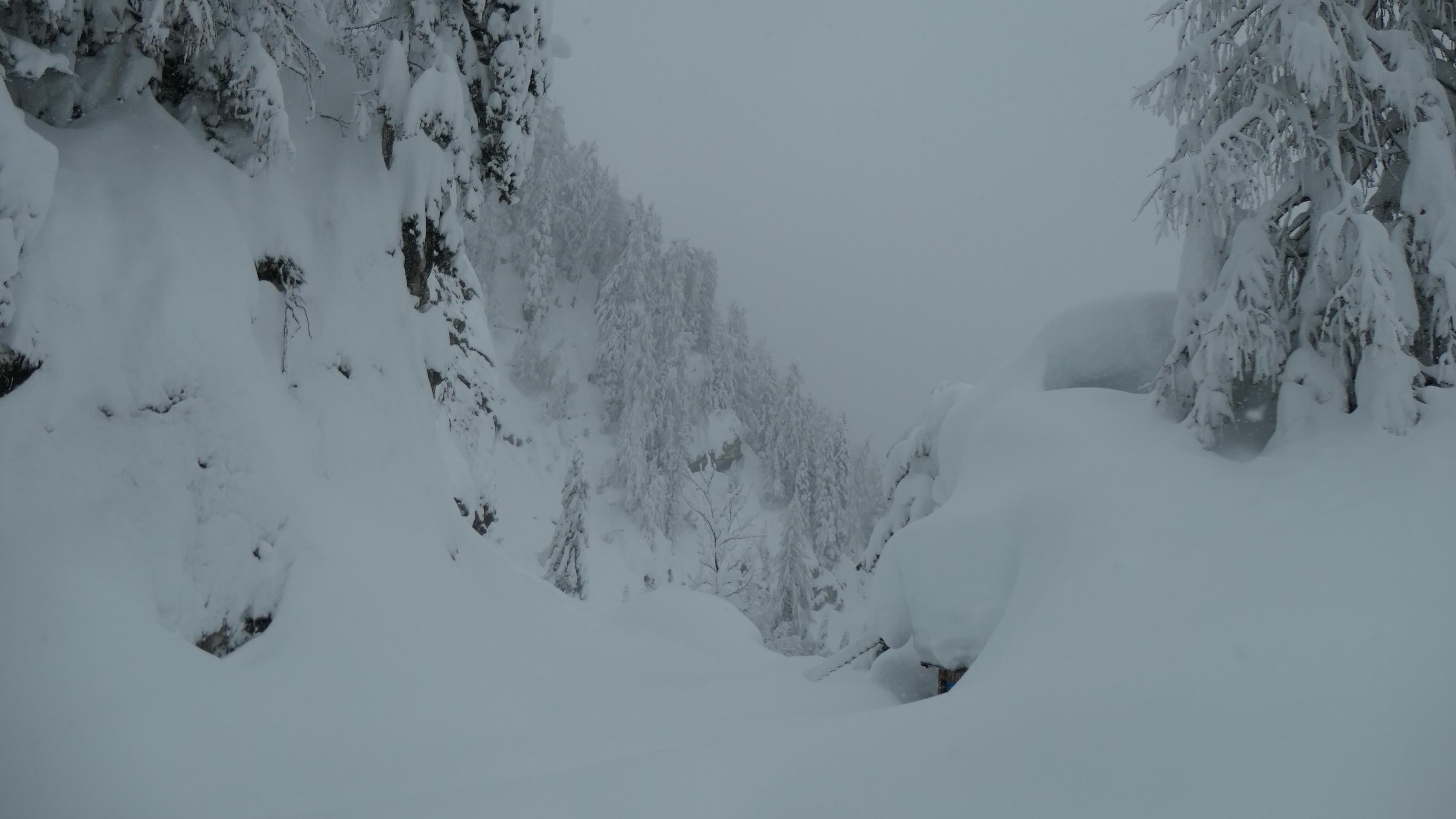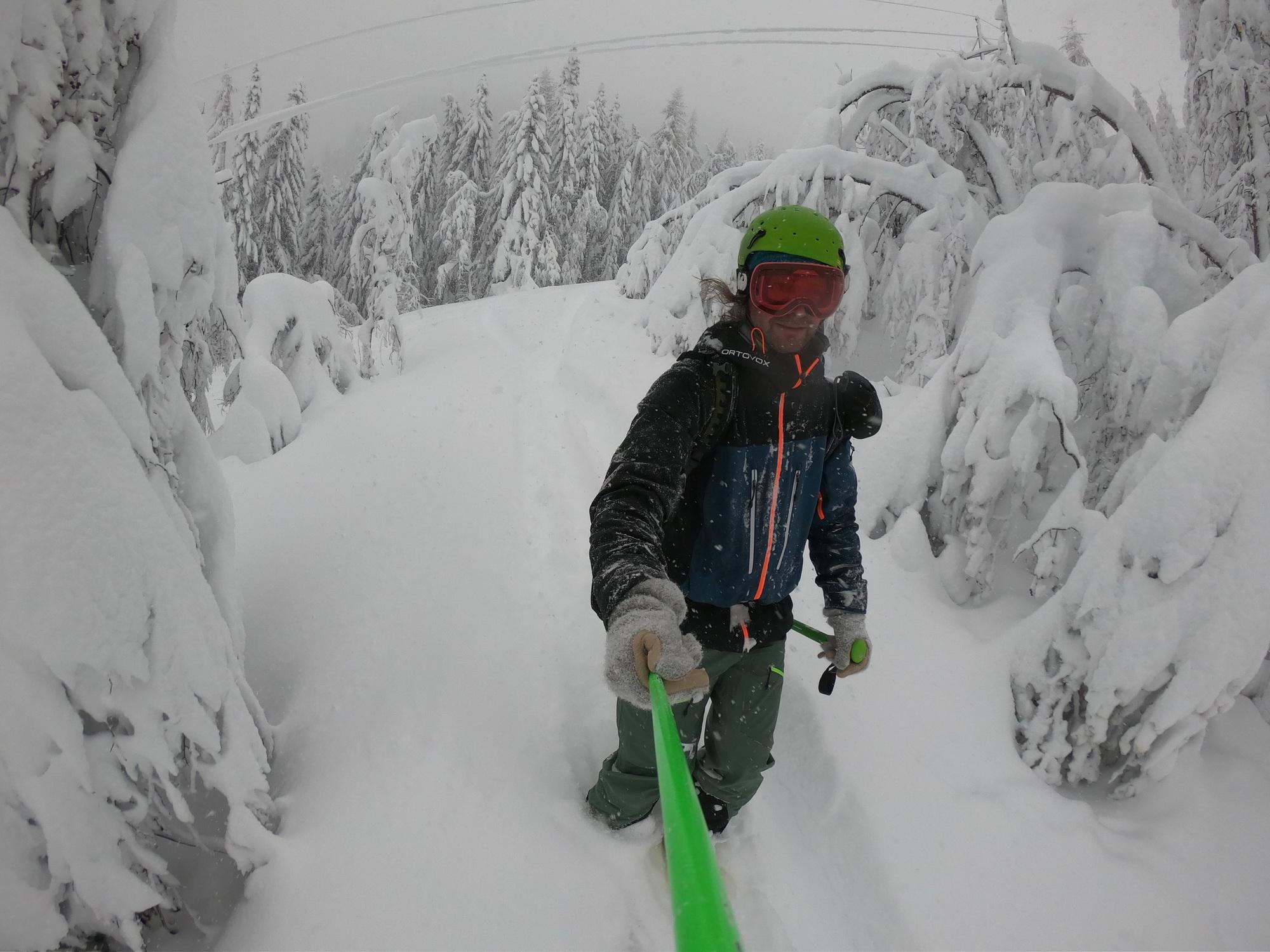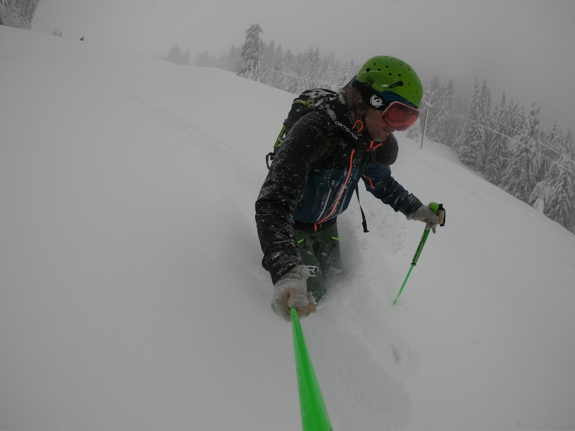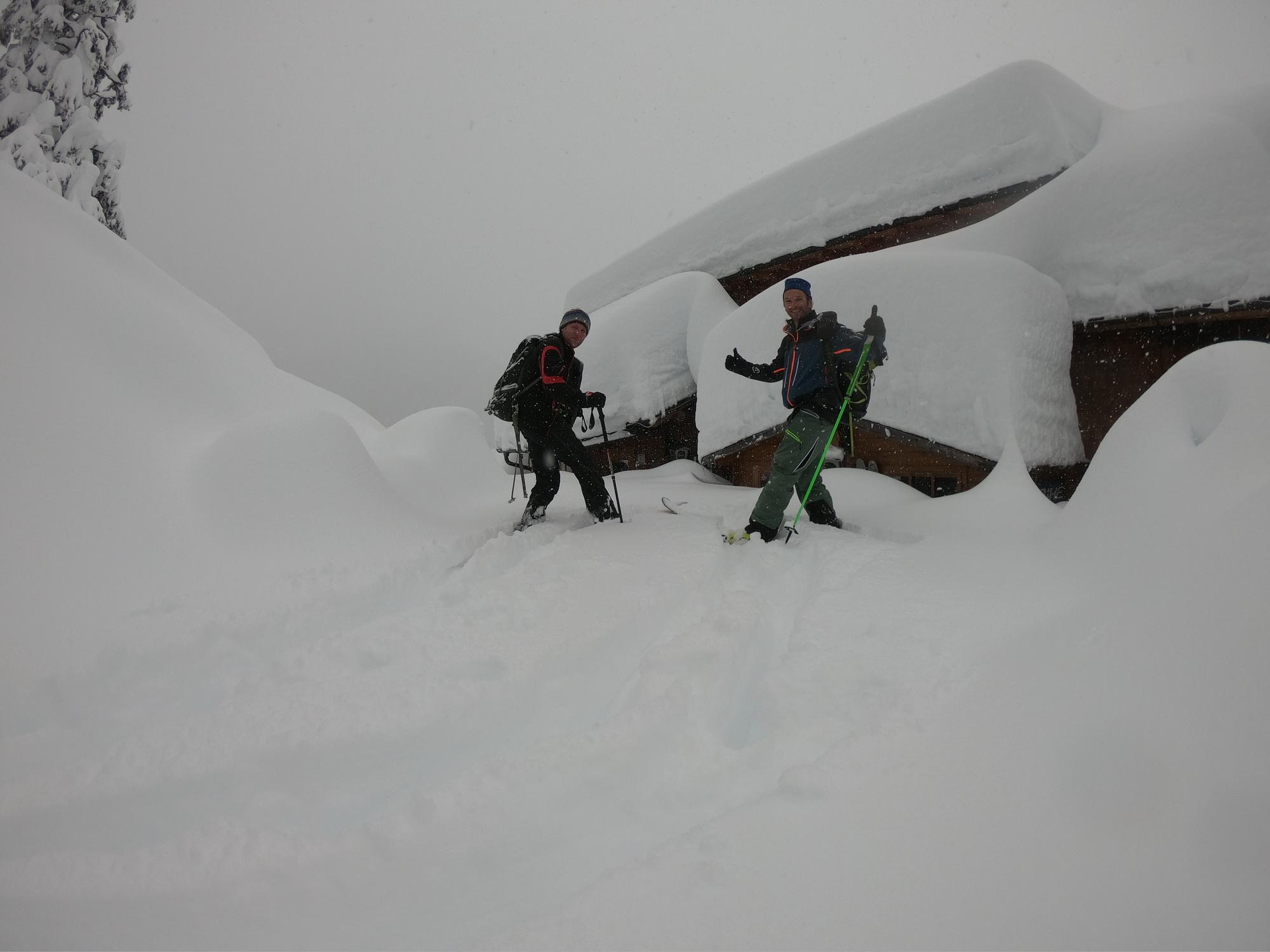 Im unteren Teil bis ca. 1000m ist die Schneedecke ziemlich durchfeuchtet was mit zunehmender Seehöhe stetig abnimmt. Überhalb von 1200m wurde es dann richtig pulvrig. Die Wahl dieses Aufstieges halte ich lawinentechnisch für relativ sicher. Wir konnten keine Anzeichen von Lawinenaktivitäten erkennen. Allerdings sollte man speziell im oberen Teil einen Augenmerk auf die Bäume und die Stromleitung machen. Unterhalb von 1000m sind die Bäume in der Zwischenzeit wieder schneefrei. Derzeit sicher eine nicht zu unterschätzende Gefahr.