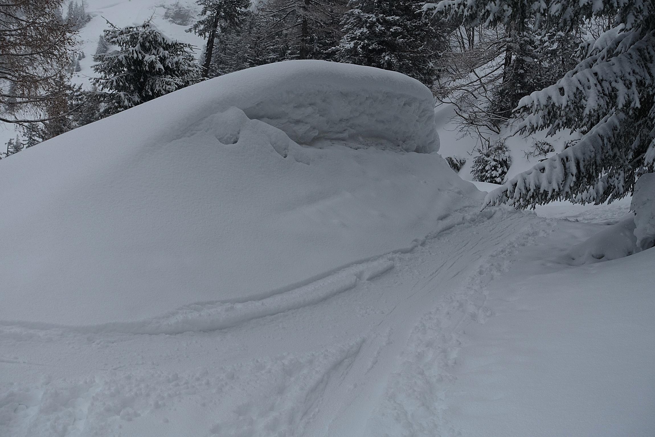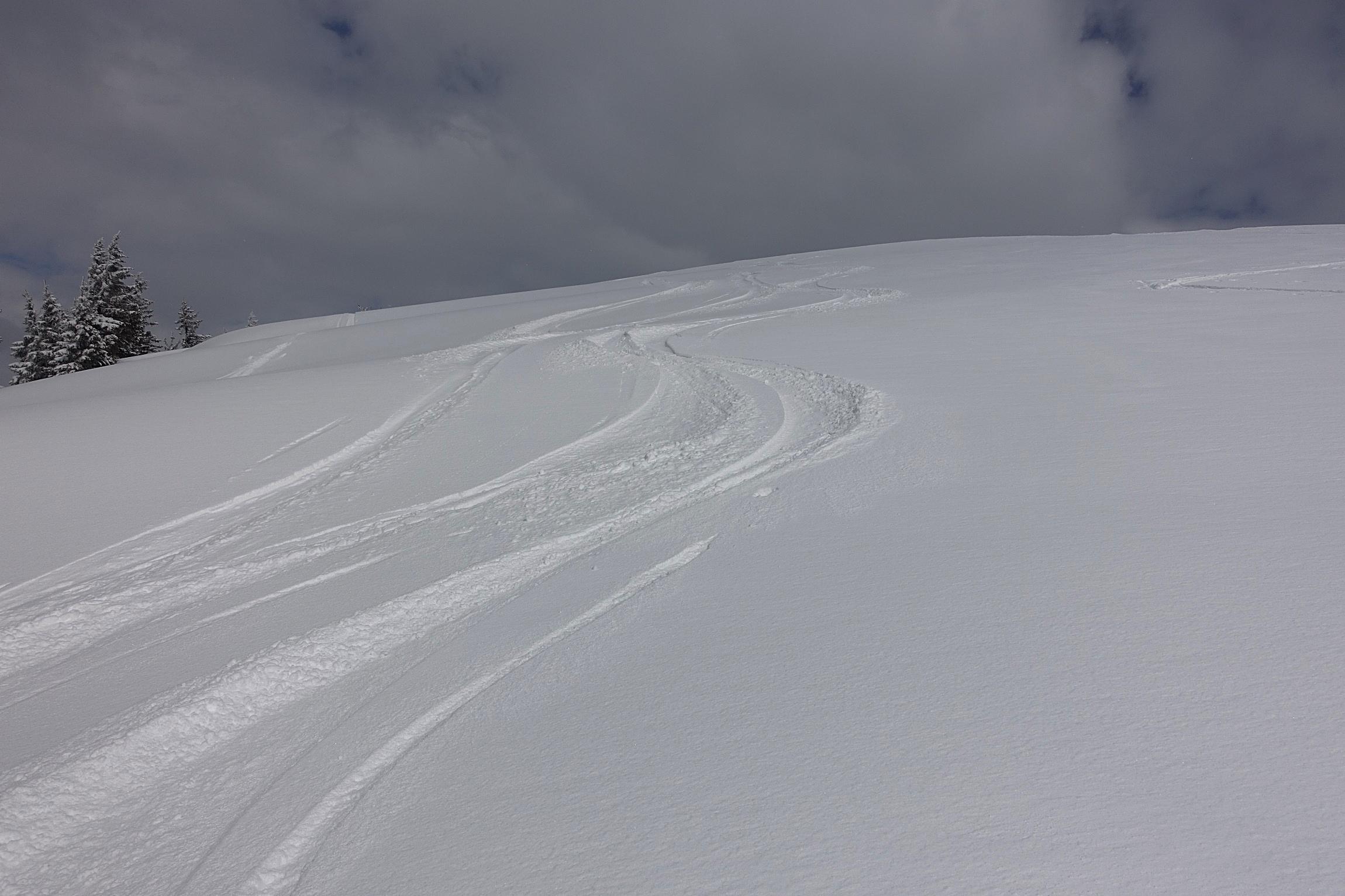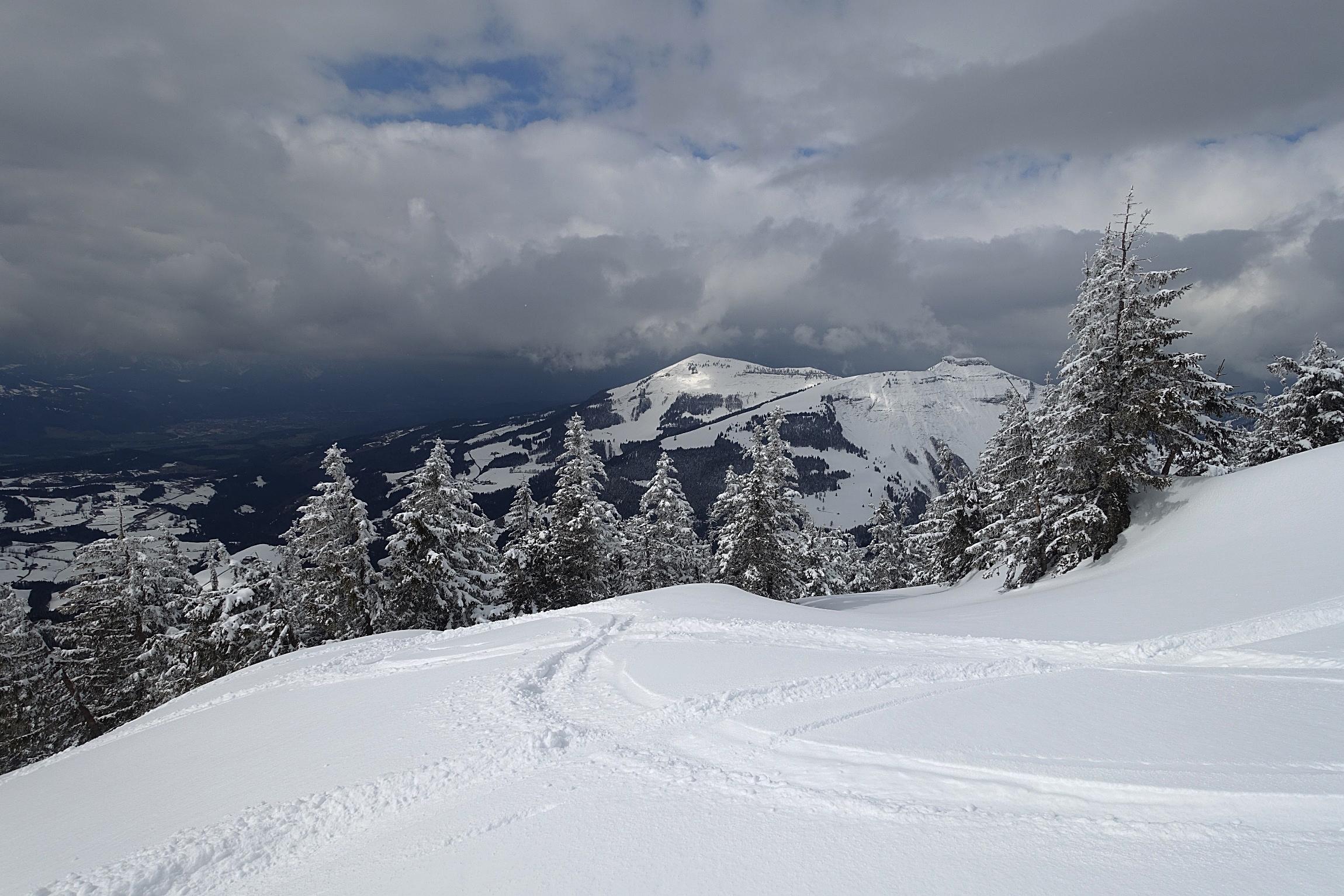 Anfangs Sonne, dann dichter Graupelschauer und mäßiger Wind beim Aufstieg. Für die Abfahrt ein kleines Sonnenfenster genutzt. Sehr gute Bedinungen - ca. 20cm Neuschnee (oben Pulver, unten etwas angefeuchet) auf fester tragender und stabiler Unterlage. Alte Spuren sind fast nicht zu spüren.