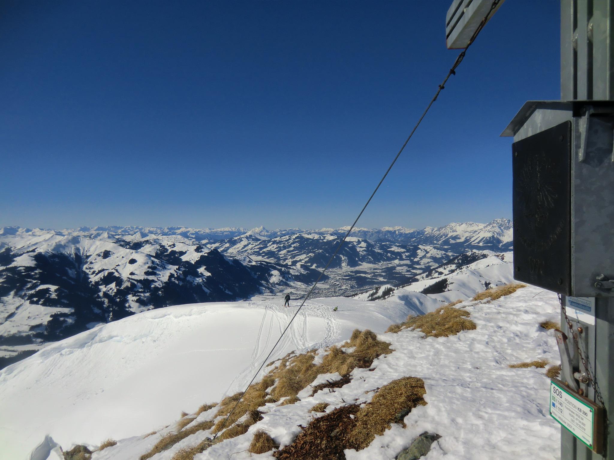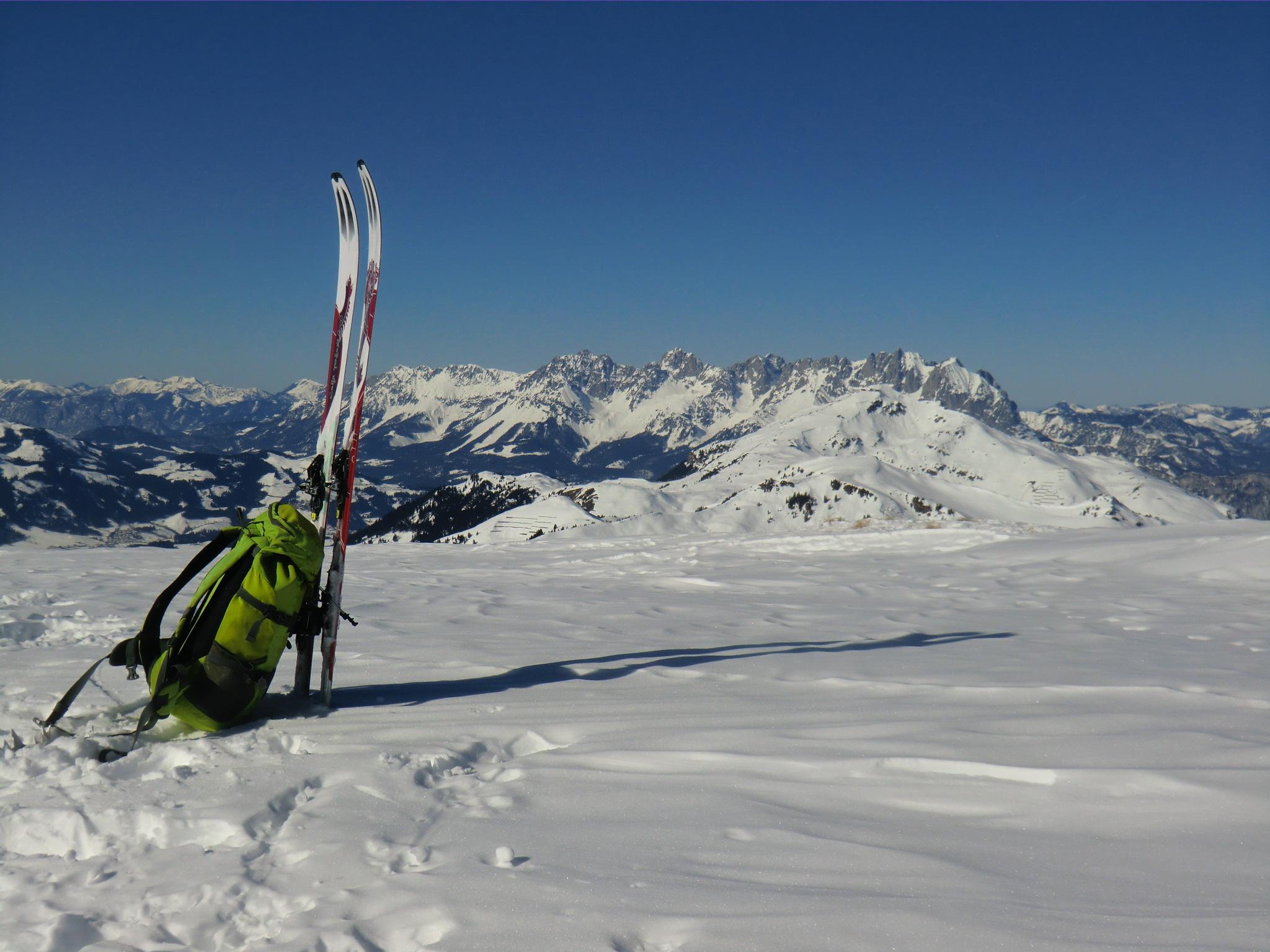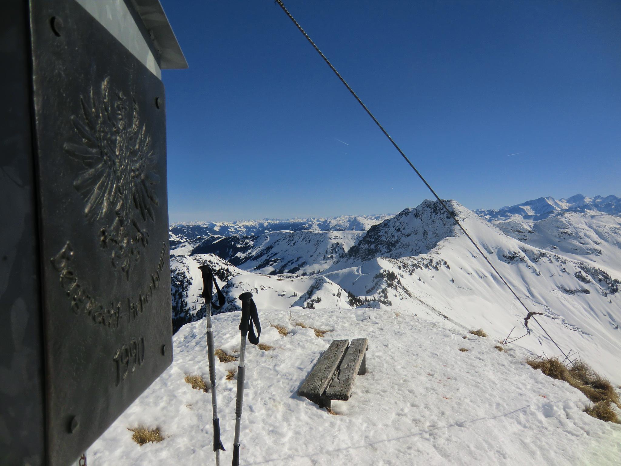 Wieder im Bann der Kitzbühler - heute auf der gegenüberliegenden Seite. Die südlichen Hänge haben sich ordentlich aufgeheizt. Ab mittags war firnschmiern angesagt. Der steile westliche Gipfelgrat bzw. die Rinne war bockhart und etwas tricky beim Aufstieg. Am Gipfel hat die Sonne schon ein Grasfleckerl ausgeapert - ein Hauch von Frühling. Der Himmel makellos blau, Bruder Wind auf unbestimmte Zeit verreist, gigantische Fernsicht. Auf der Hausbank der Hochwildalmhütte wurde es dann endgültig zum bruzzeln. Zum Glück war die Minibar frisch aufgefüllt ;-)