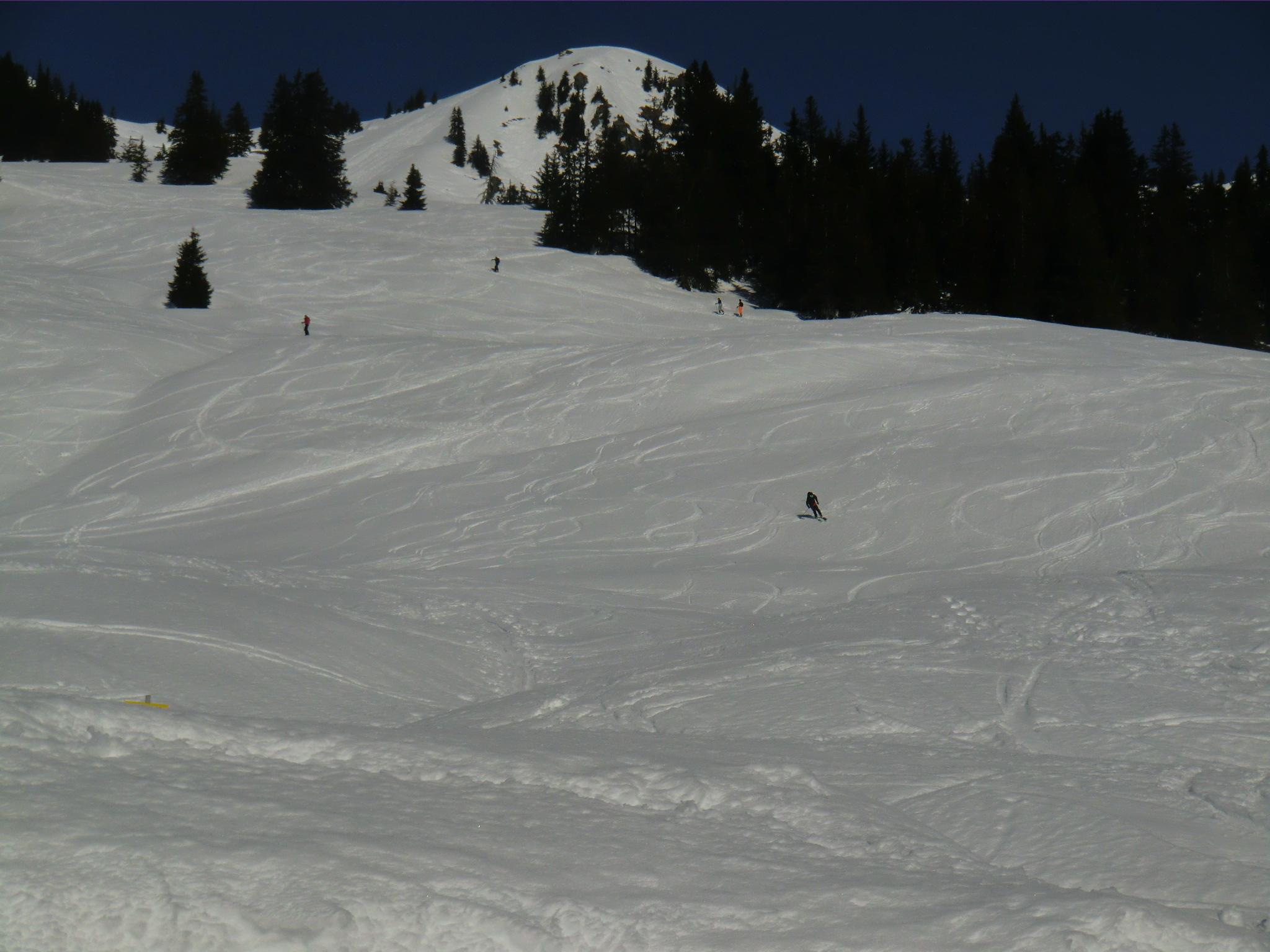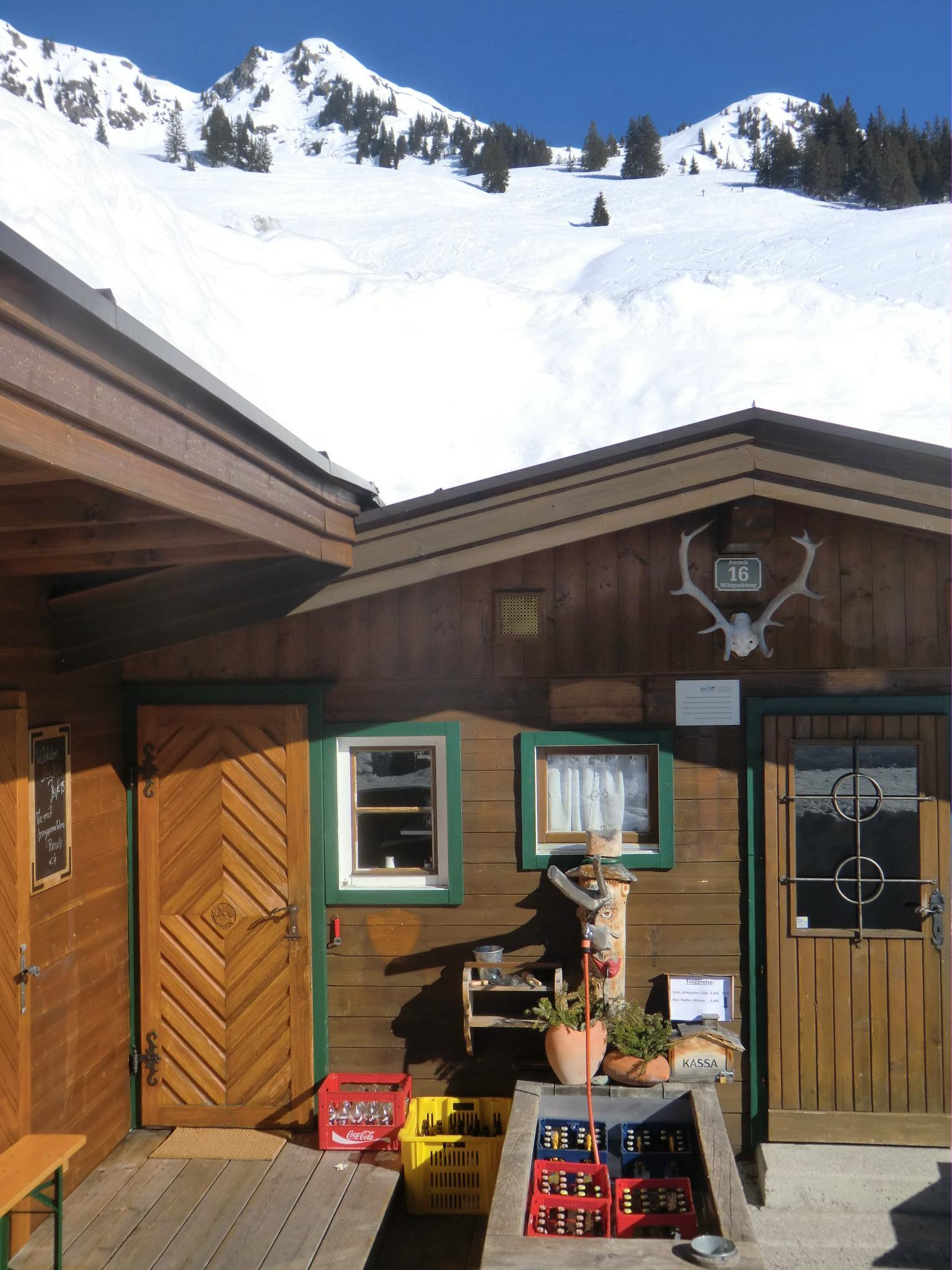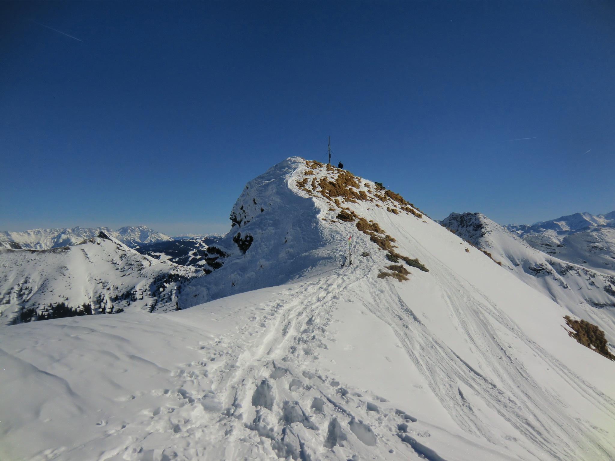 Wieder im Bann der Kitzbühler - heute auf der gegenüberliegenden Seite. Die südlichen Hänge haben sich ordentlich aufgeheizt. Ab mittags war firnschmiern angesagt. Der steile westliche Gipfelgrat bzw. die Rinne war bockhart und etwas tricky beim Aufstieg. Am Gipfel hat die Sonne schon ein Grasfleckerl ausgeapert - ein Hauch von Frühling. Der Himmel makellos blau, Bruder Wind auf unbestimmte Zeit verreist, gigantische Fernsicht. Auf der Hausbank der Hochwildalmhütte wurde es dann endgültig zum bruzzeln. Zum Glück war die Minibar frisch aufgefüllt ;-)