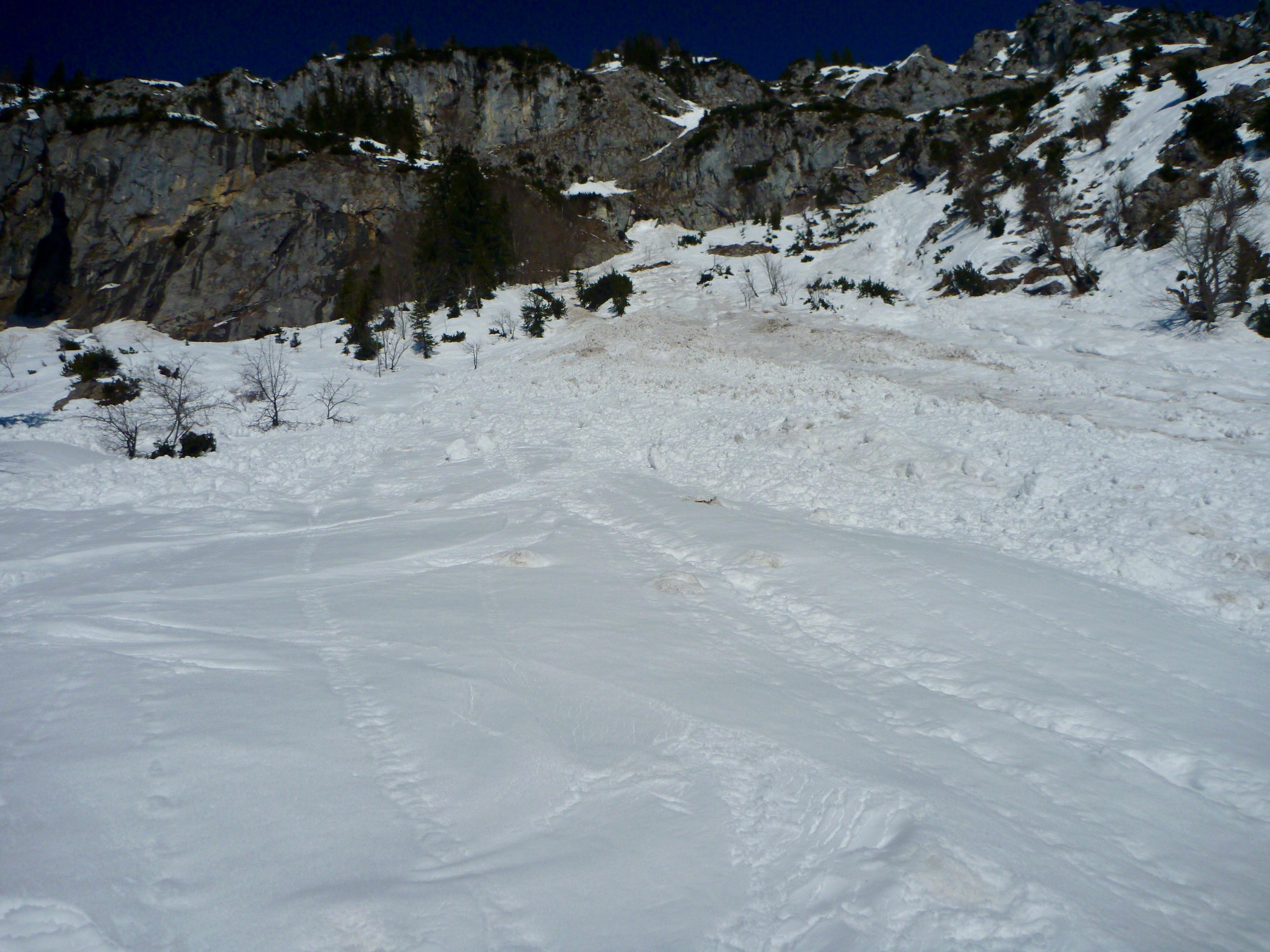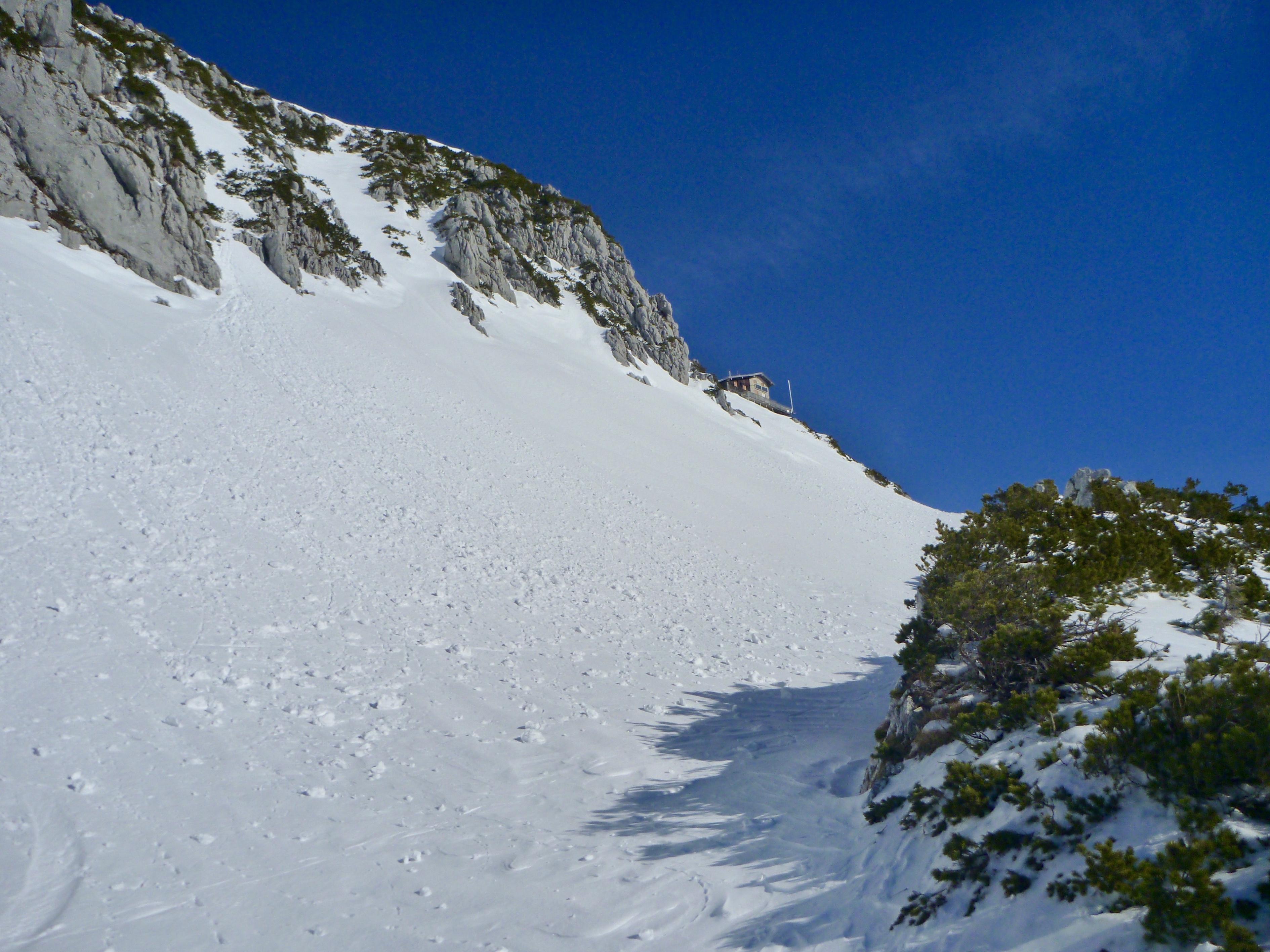 Schnee&Bedingung: nur oberflächlich verharschte Schneedecke (Harscheisen), beim Stapfen bereits am Morgen tief, die Querung geegen 9:30 sehr tief, darunter Lawinenknollen, Abfahrt um 10:30 mit dem Board gerade noch gut machbar ab Mitte grenzwertig weich.