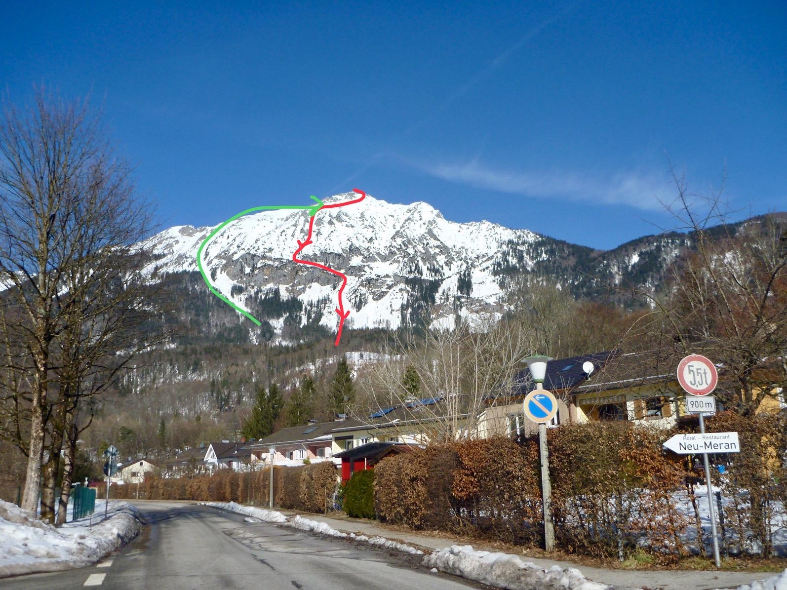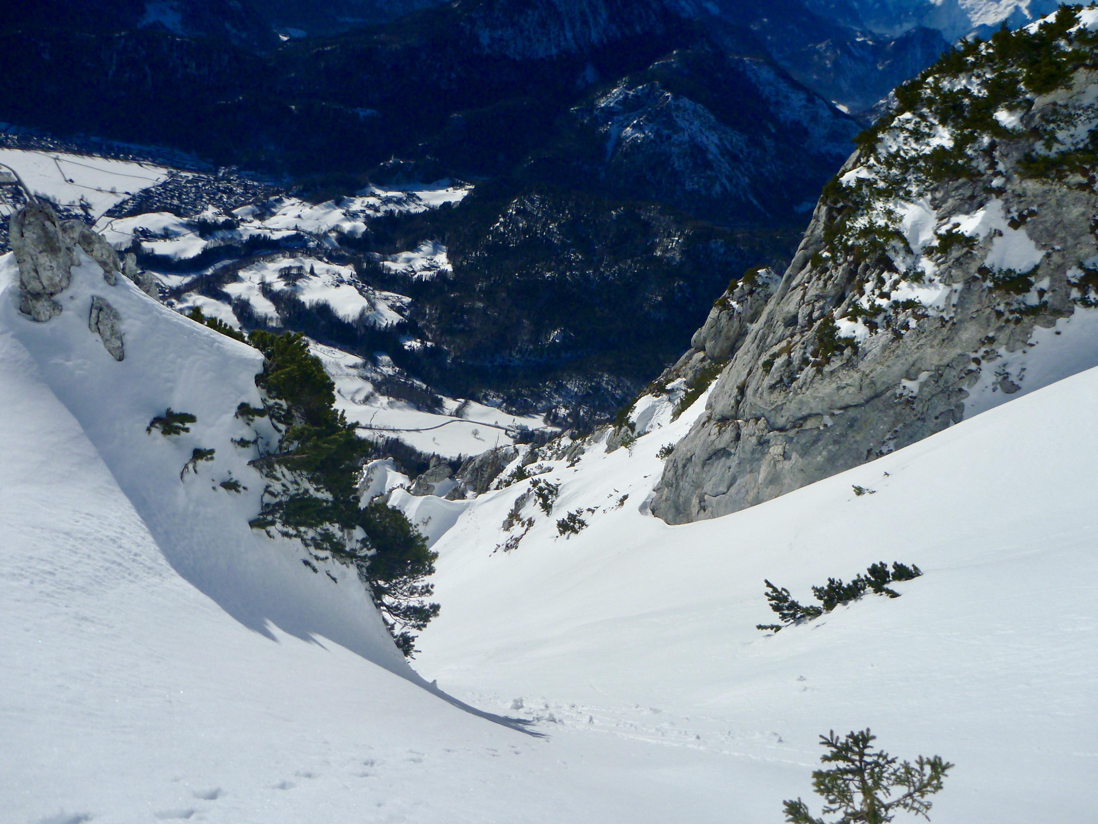 Ziel war der Hochstaufen über den Goldtropfsteig. Den hab ich im Anstieg zwar versäumt. weil ich ca. 100hm zu tief nach Westen gequert bin, aber über eine schöne steile Rinne gings dann auch bis nach oben. Bei der Abfahrt fand ich dann auf der Suche nach einem beim Anstieg verlorenen Harscheisen, falls es wer findet bitte melden, doch noch iwie im Zick-Zack in den Goldtropfsteig und suchte bis zur Querung hinunter. Danach ging`s noch einmal direkt, wie die Linie eigentlich sein sollte, hoch und wieder runter zur Padinger Alm.