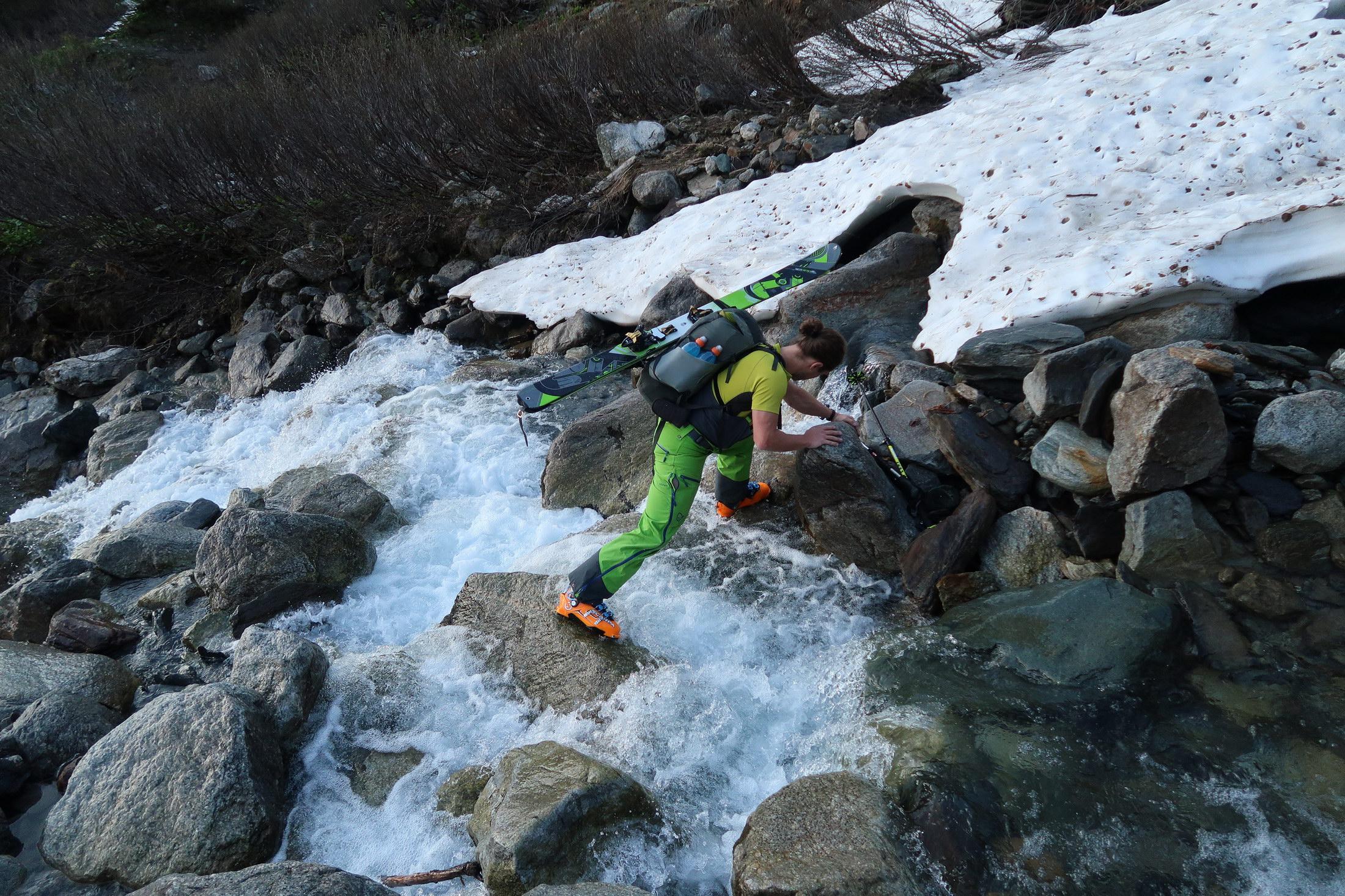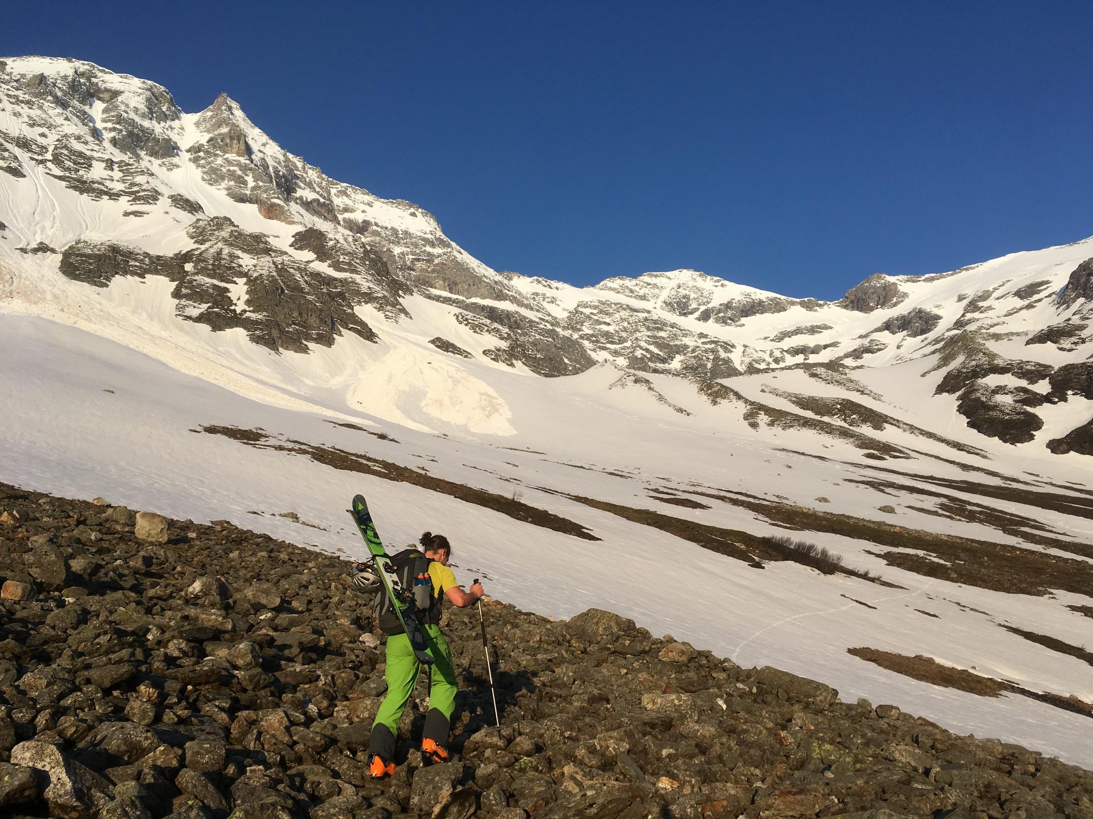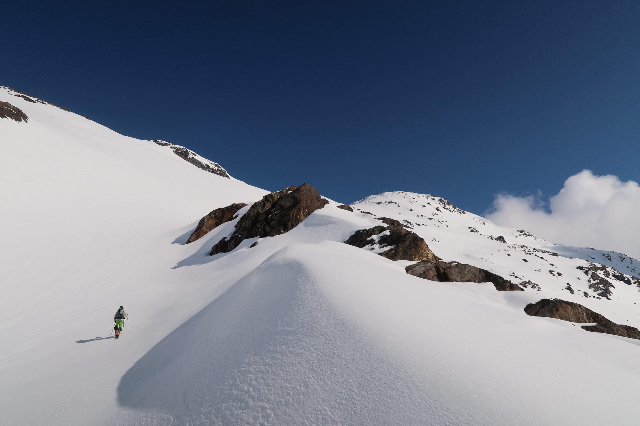 Hochgebastelt haben wir uns in Aufstiegsrichtung eher links -- wie ich in der Abfahrt festgestellt habe, wär's gscheiter rechtshaltend über den Erfurter Weg. Nach ca. 300hm/1h kann man dann in der rechten Rinne direkt mit Ski starten.
