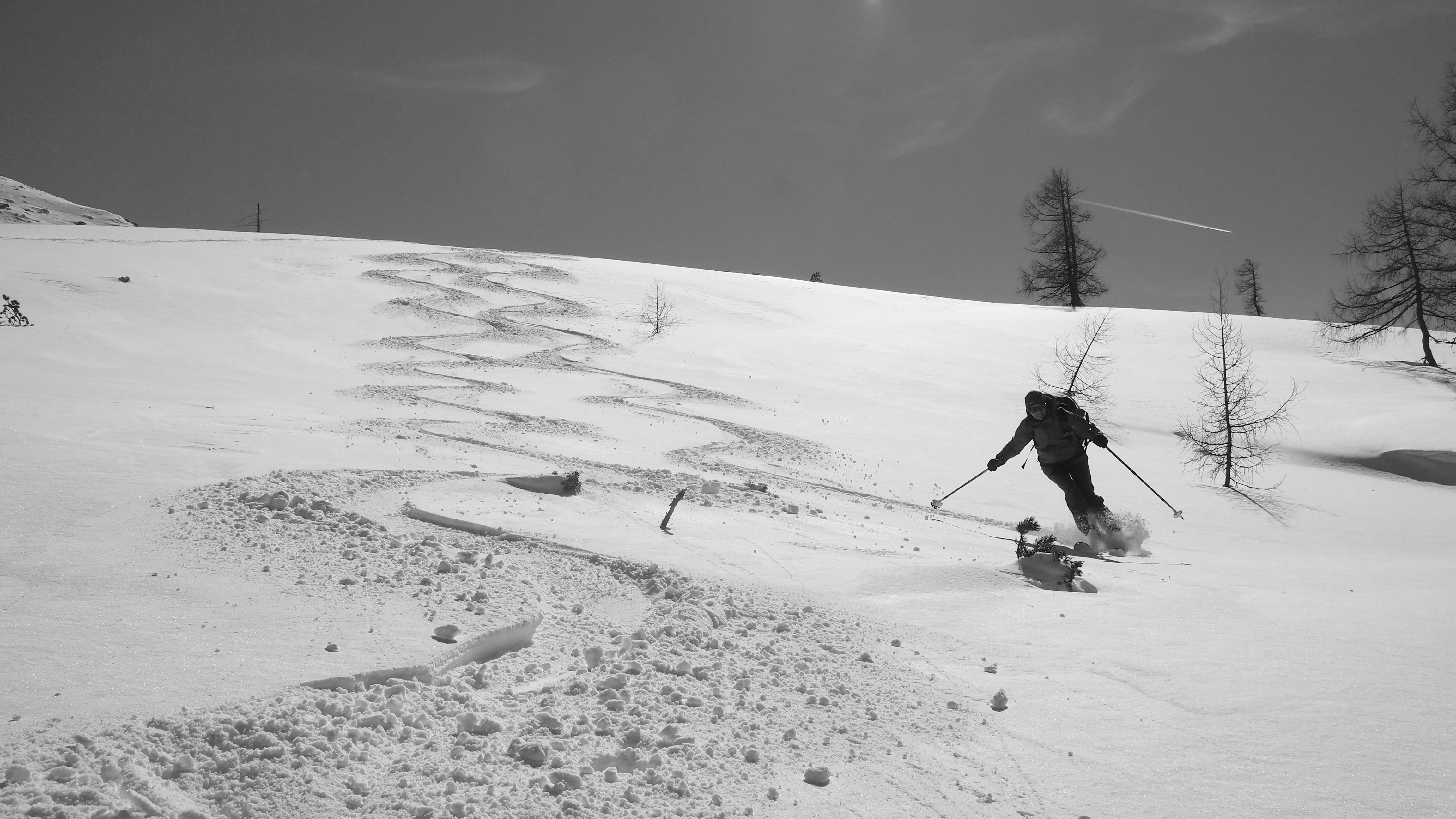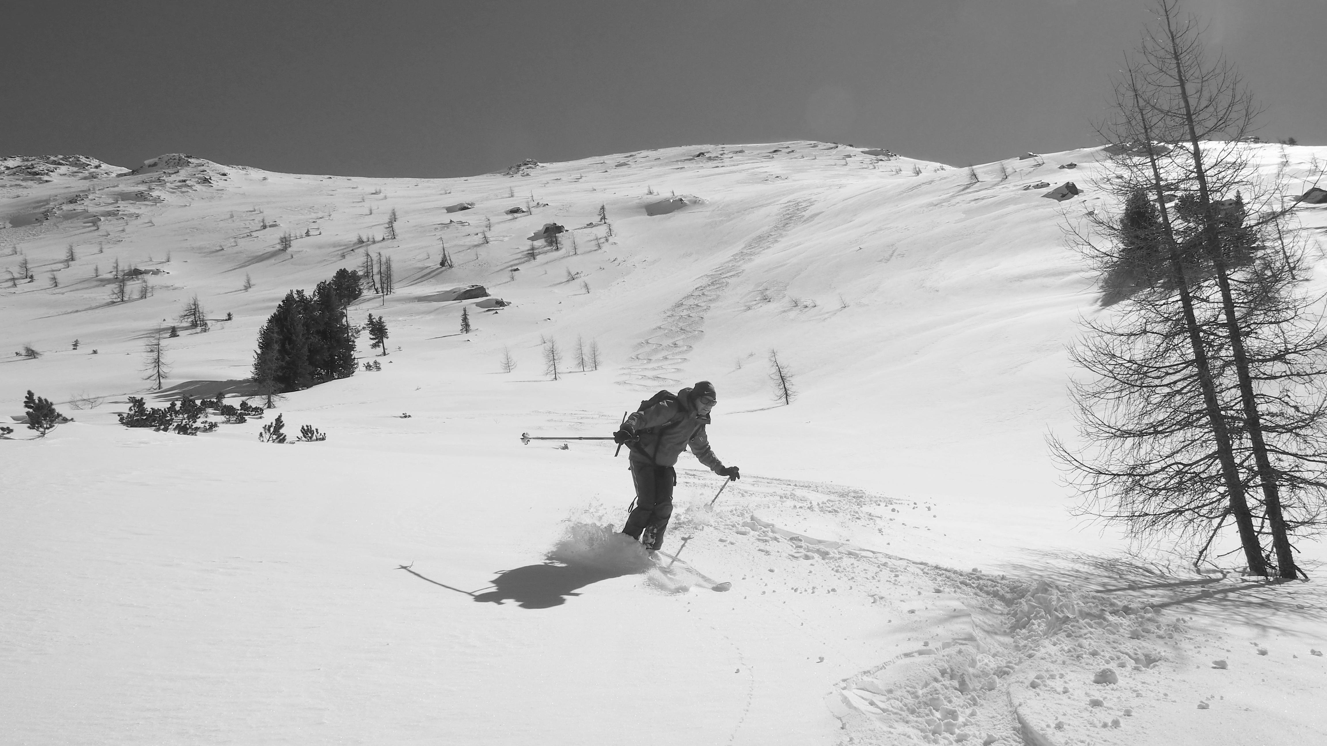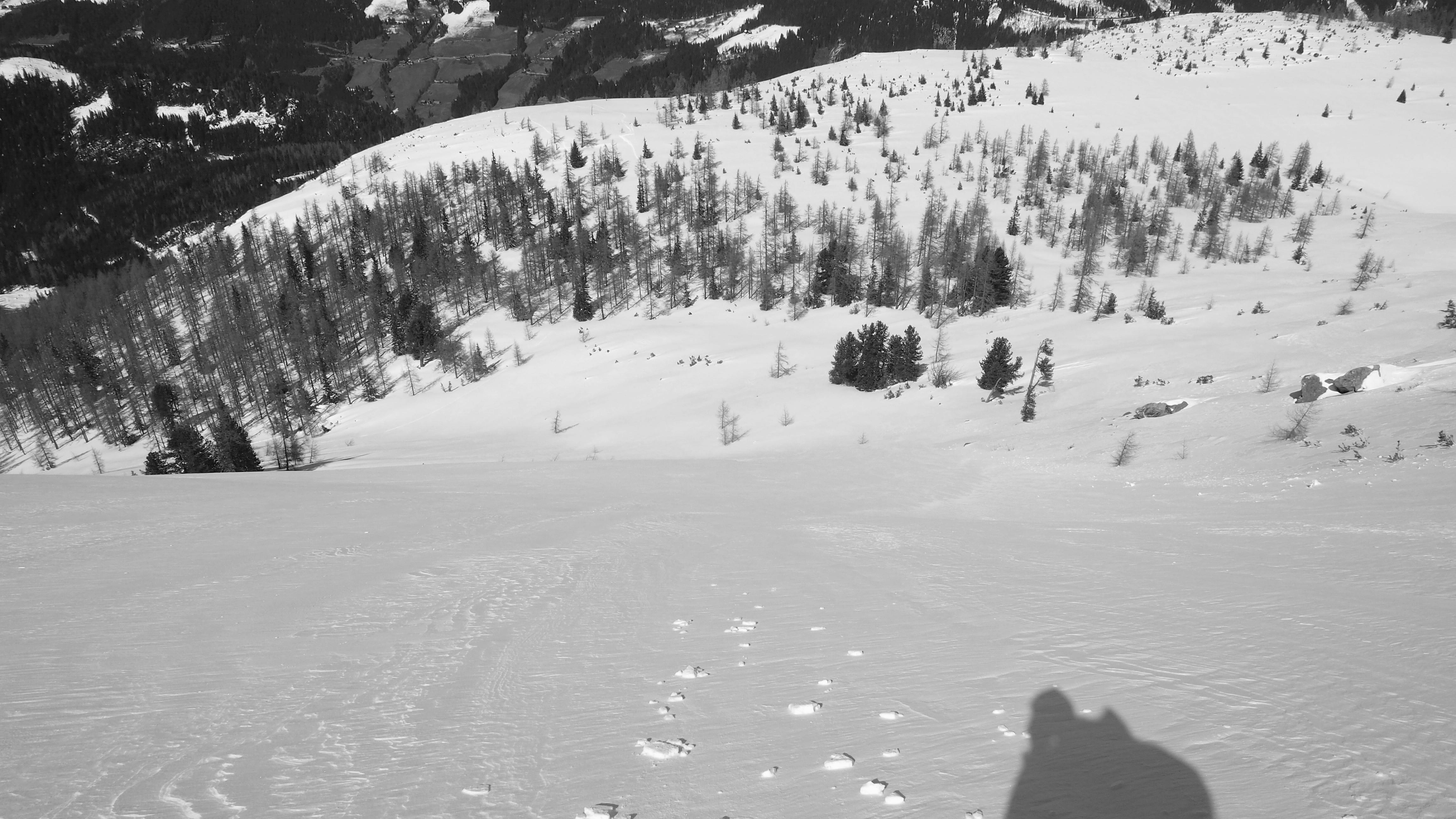 Aufstieg und Abfahrt über die Tröschmitz. Einsam, von unseren "Spurern" sehen wir heute nur Spuren. Wir können zwar keine Lawinentätigkeit erkennen, aber......