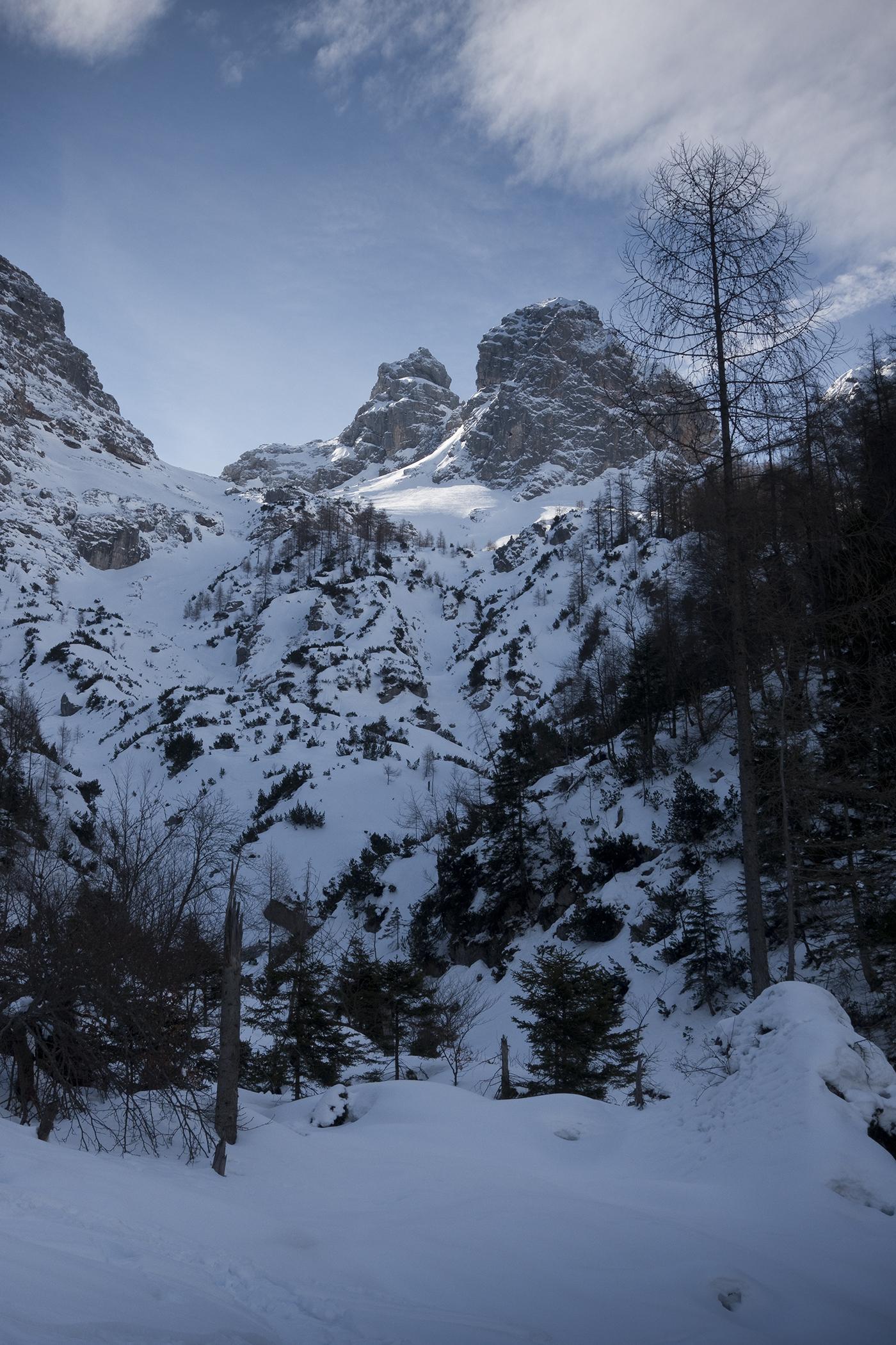 Der Leoganger von Norden ist immer wieder einsam und schön. Ich habe mich gewundert, dass schon Spuren vorhanden waren. Sie verloren sich aber in der Großen Saugrube, wohl auch wegen der Windbehandlung des Schnees. Die Querung unterm Barbarahorn war ziemlich hart, es ging aber noch alles ohne Harscheisen. Ganz oben am Übergang ins Ebersbergkar beim Hundshörnl waren verwehte Spuren zu ahnen.