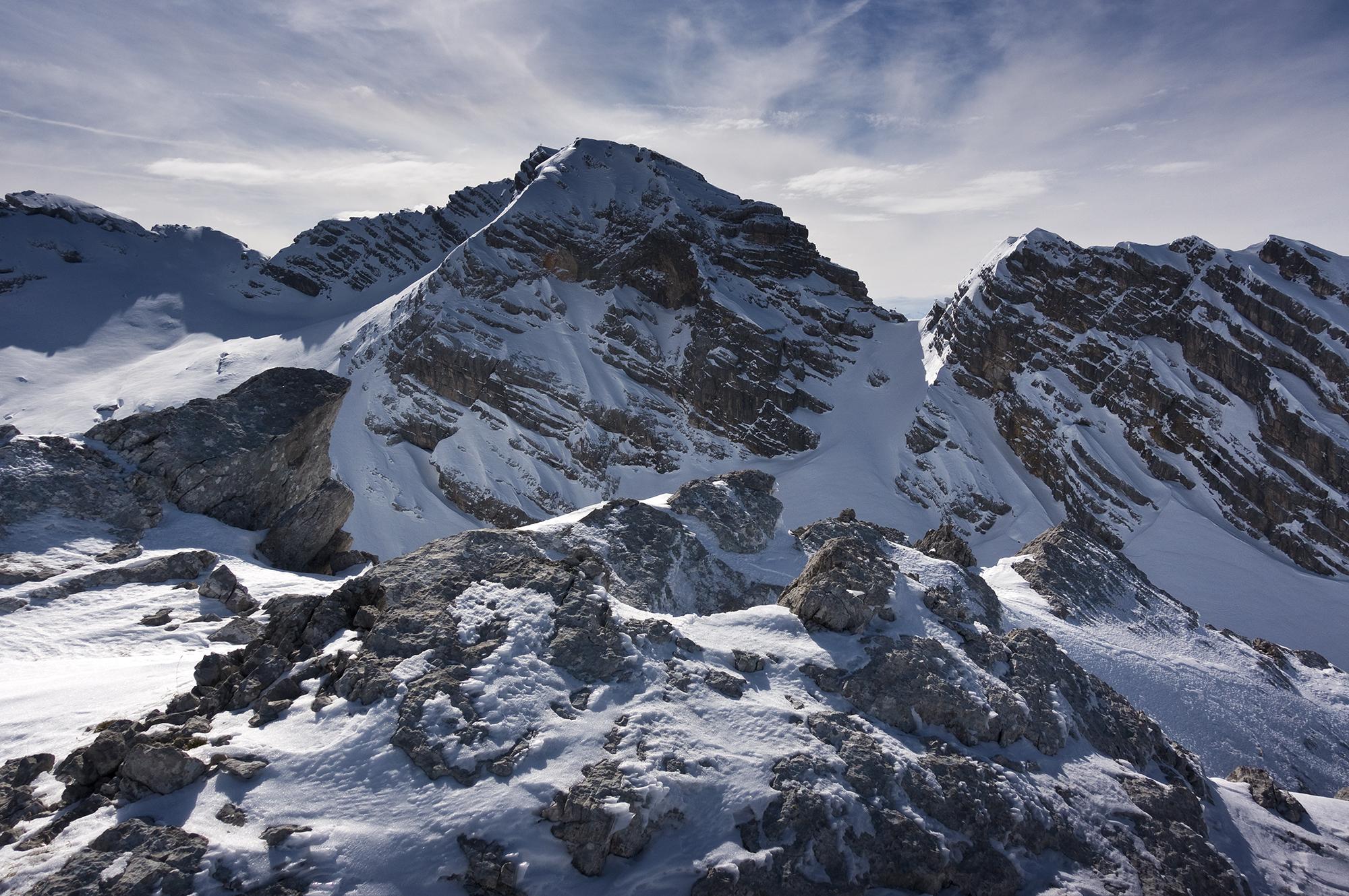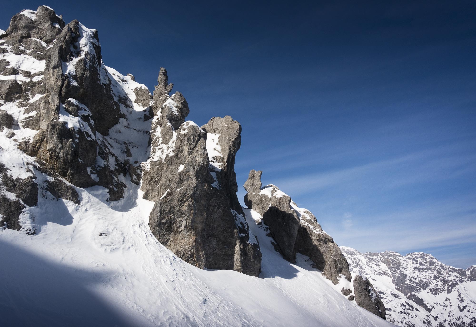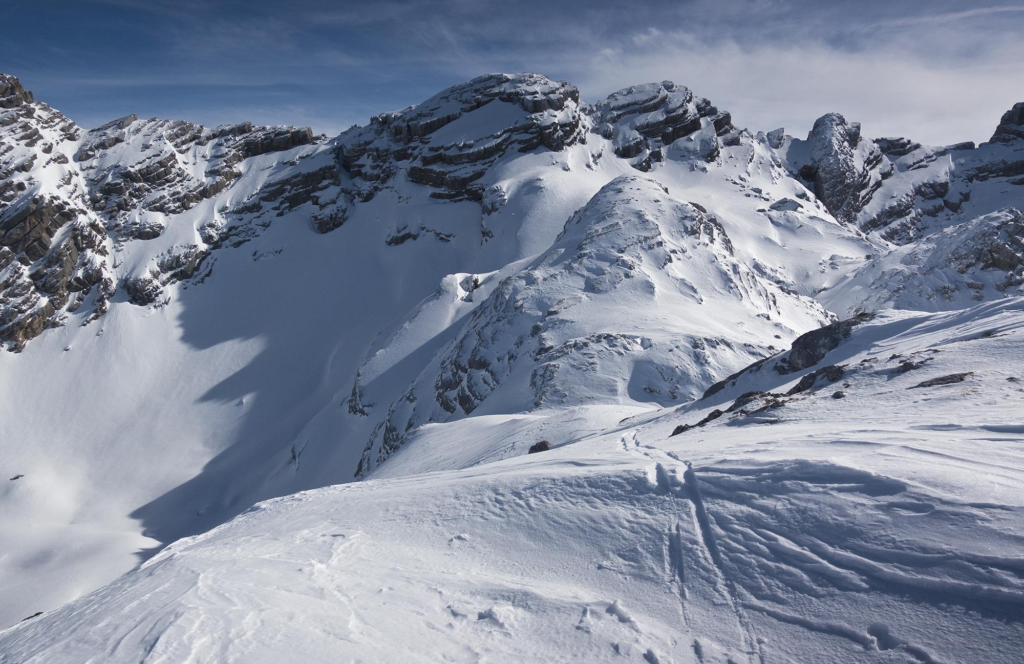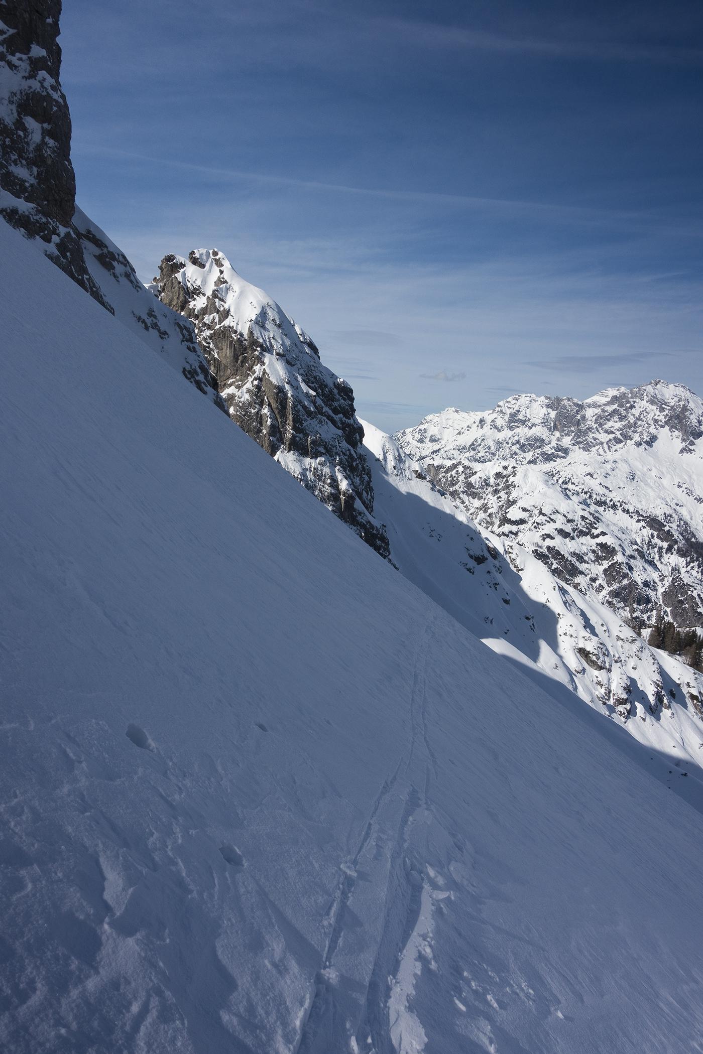 Das Sauhorn war noch ungespurt. Die westexponierte Abfahrt in die Saugrube hatte stark windbehandelten schon ganz leicht angefeuchteten Pulver, ab und zu auch festgepresste Stellen.