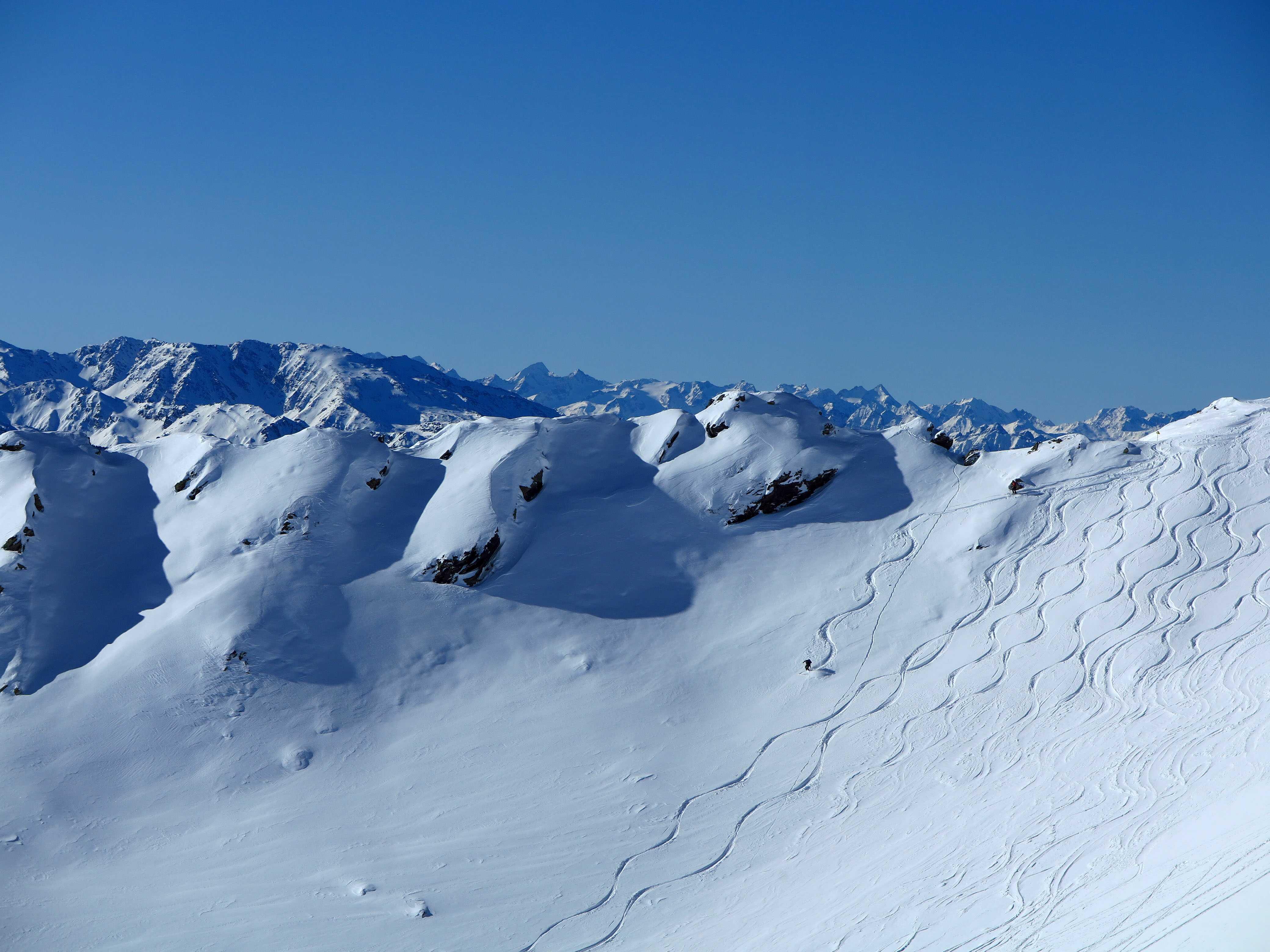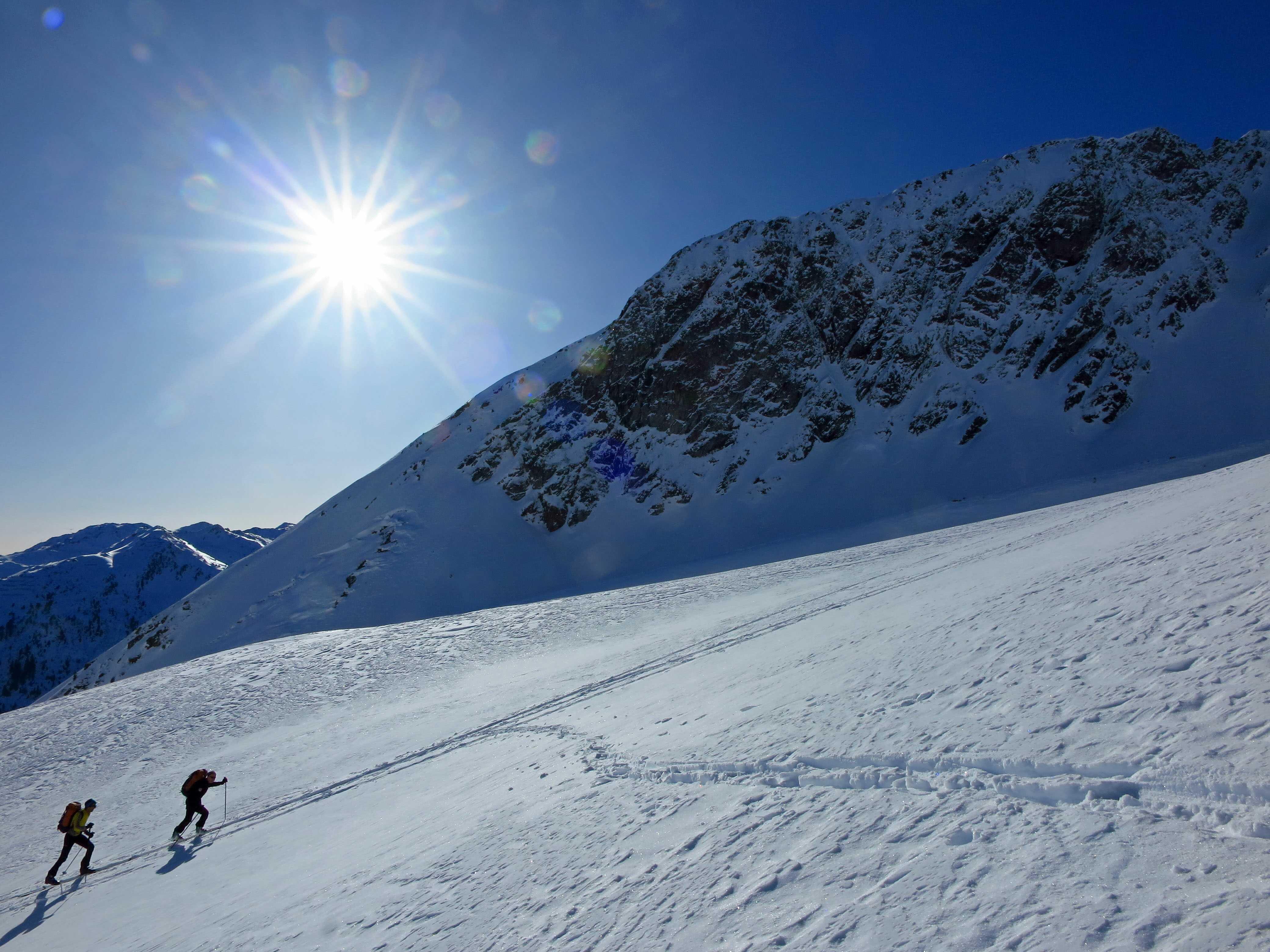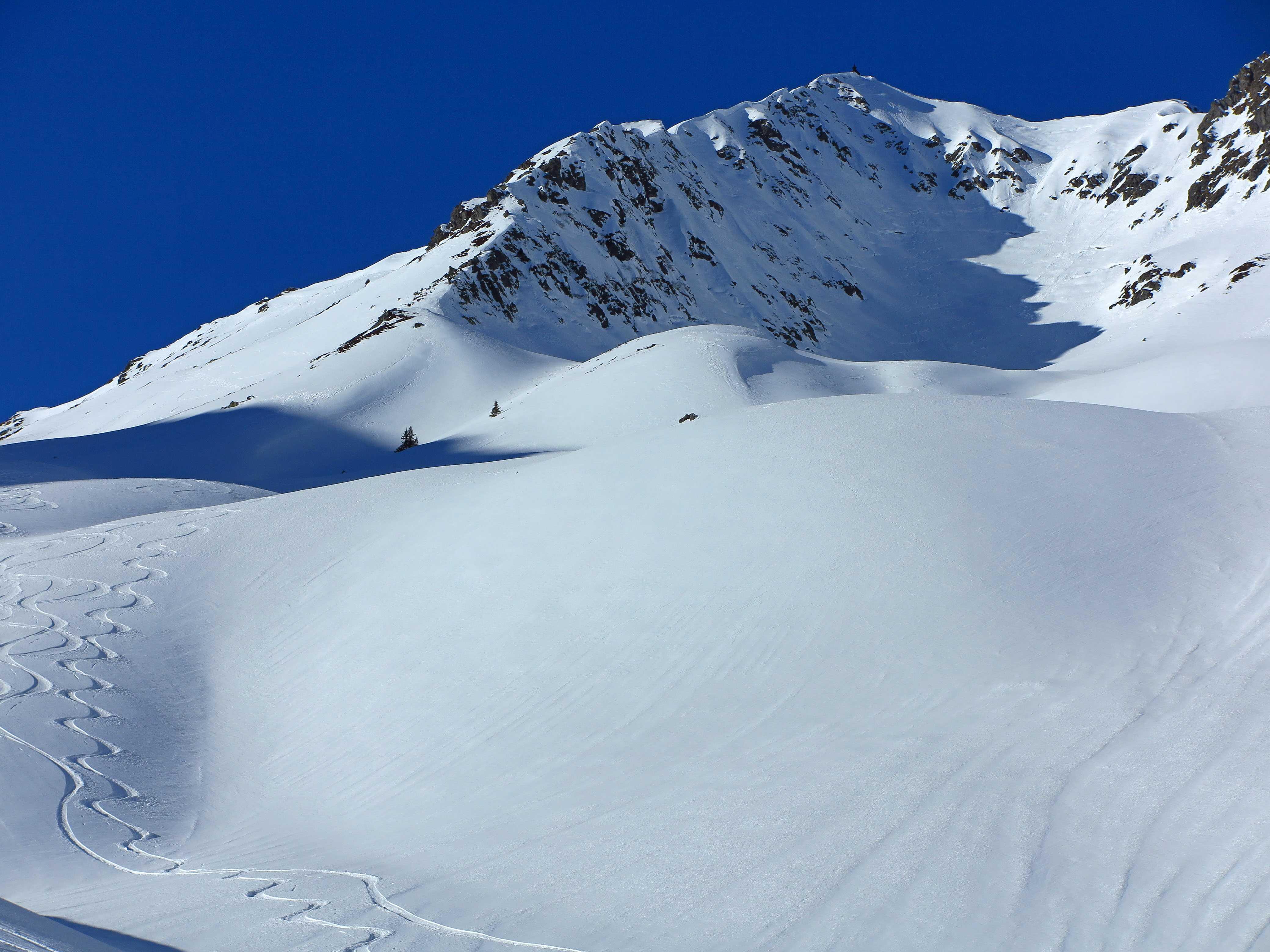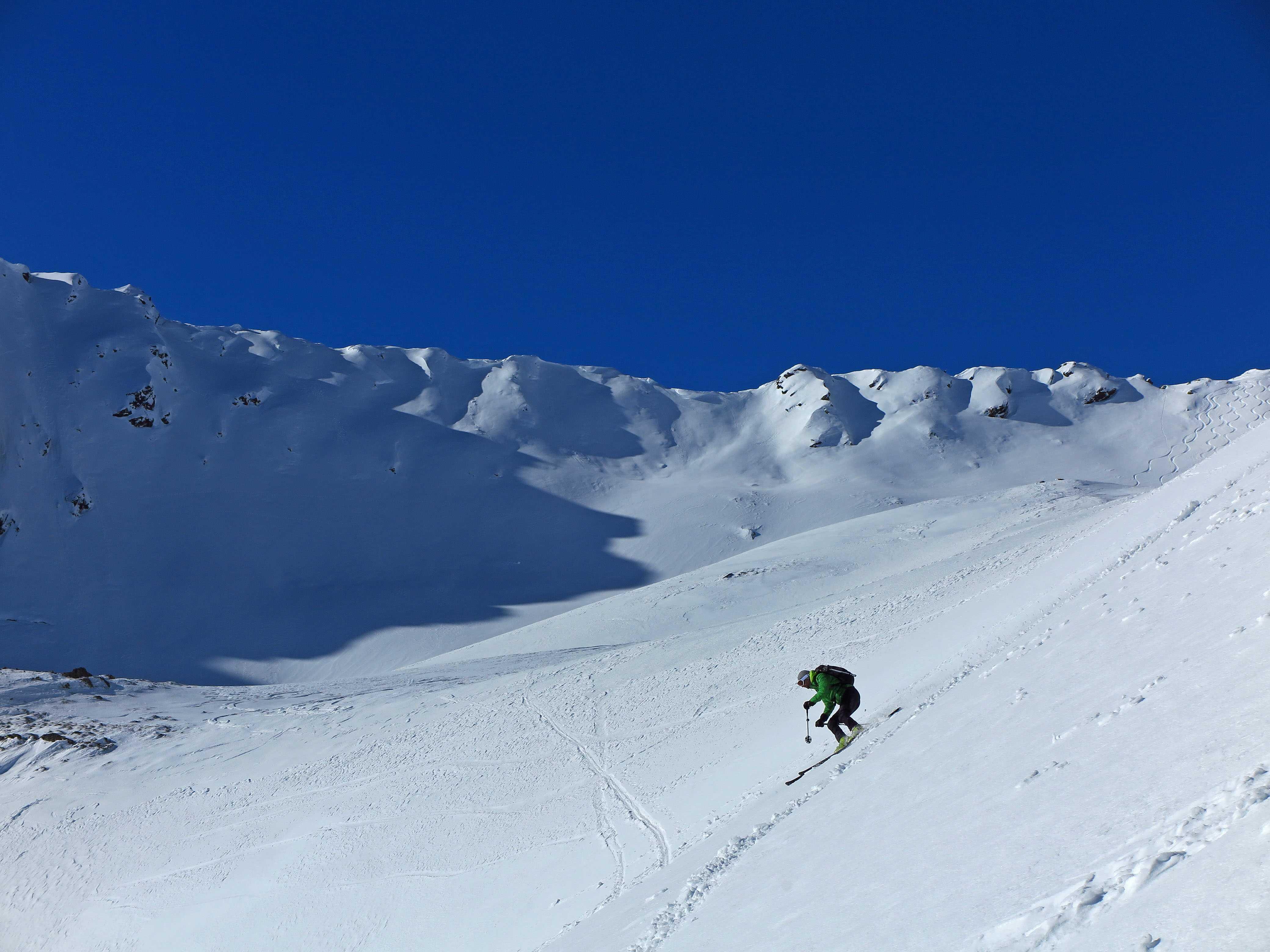 Schneelage: Bei dieser steilen südseitigen Exposition hätte ich mir eigentlich hauptsächlich Firn erwartet, diesen gab es aber nur in den rein S-seitigen Hängen unter ca. 1600m. Darüber gabs alles was man sich vorstellen kann: von tragenden Harsch über Pressschnee bis Pulver. Insgesamt waren die Abfahrtsbedingungen, wenn man etwas umsichtig war, aber ganz in Ordnung.